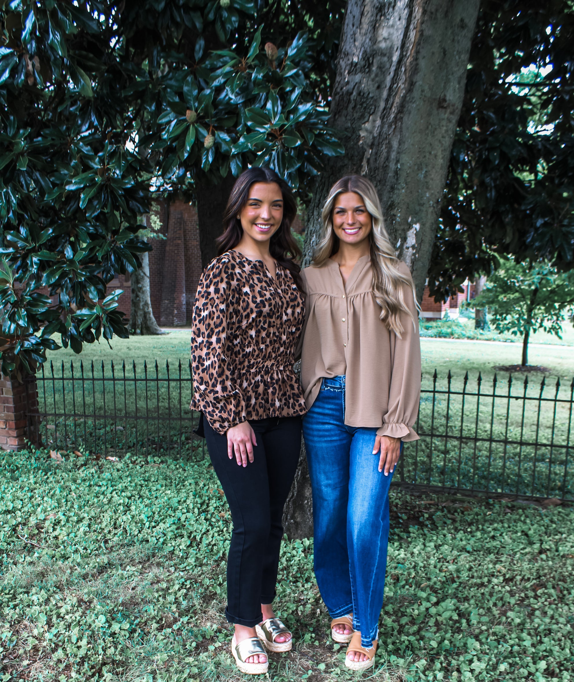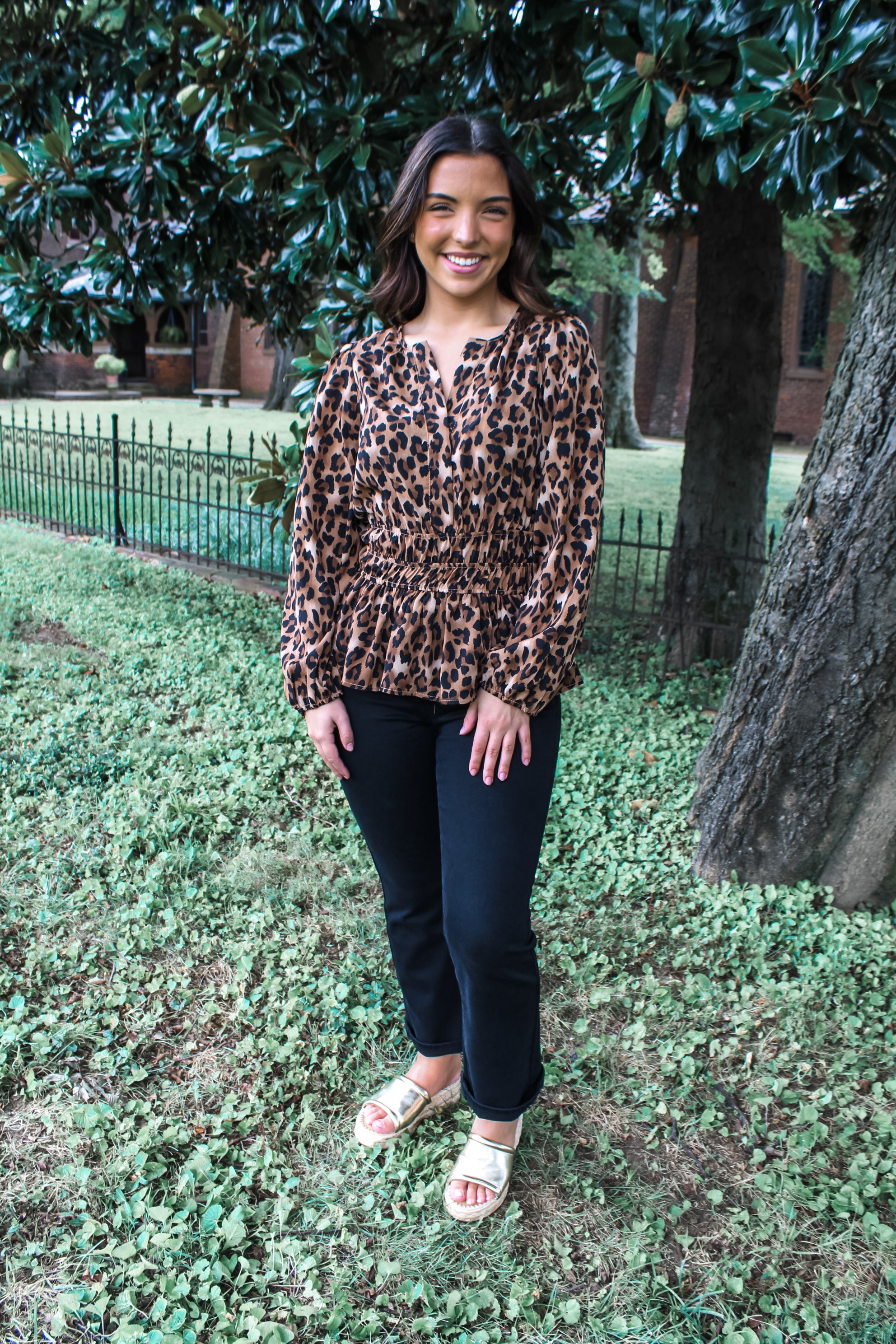 Fierce and feminine in striking leopard, this blouse is an effortless look whether you dress it up or down. Fabricated in a lightweight woven, with a notched neckline, snap button bodice, balloon sleeves and peplum hem,