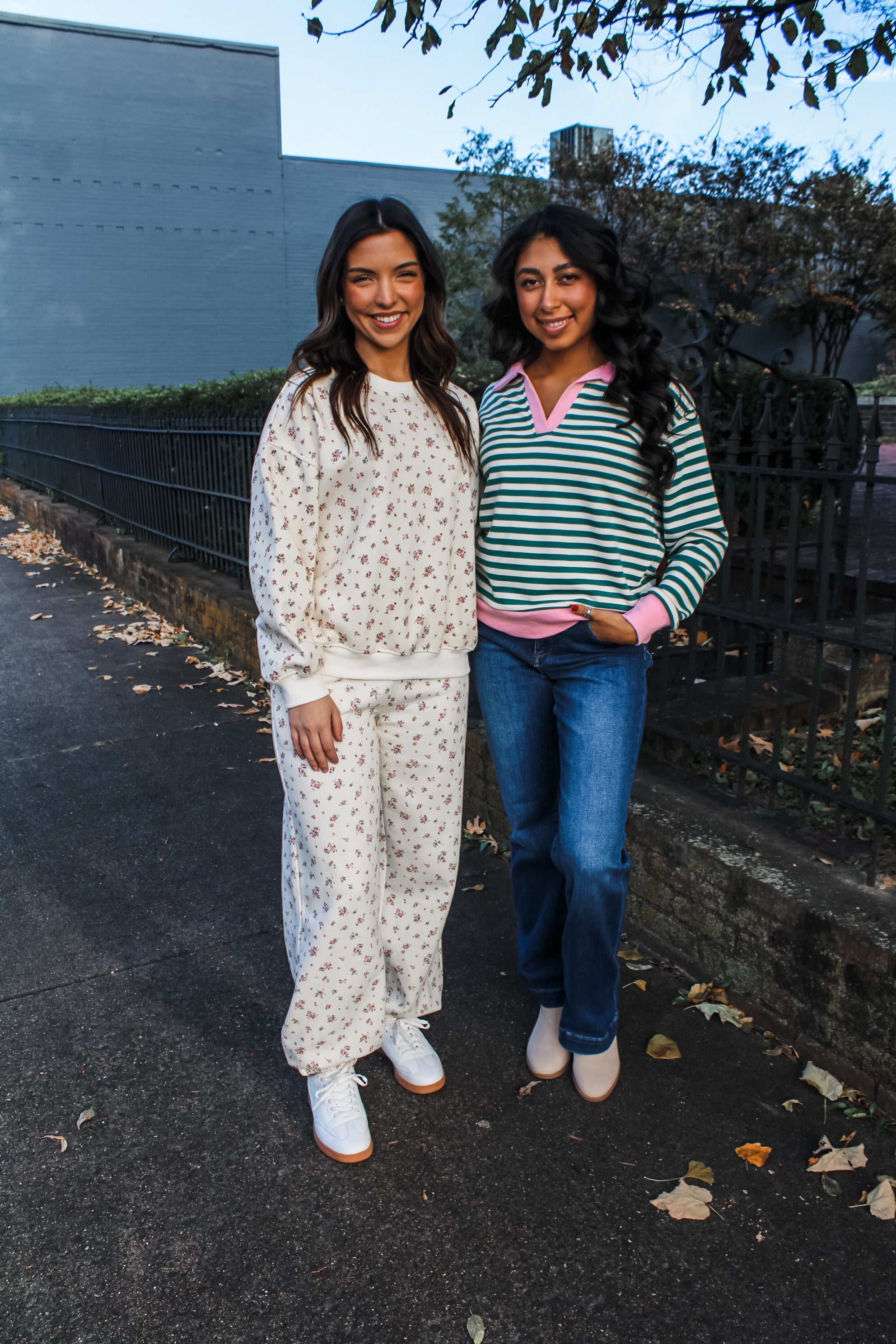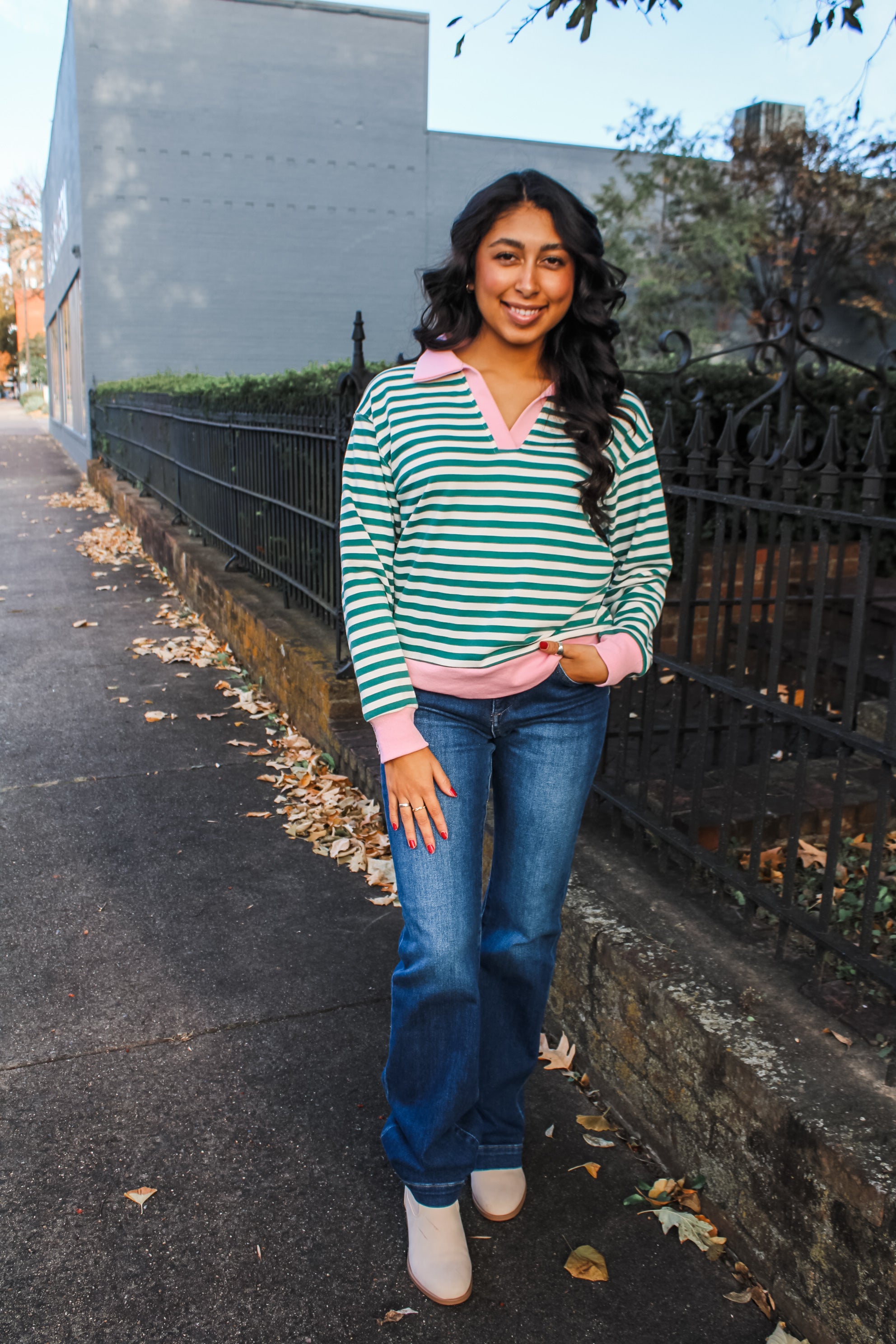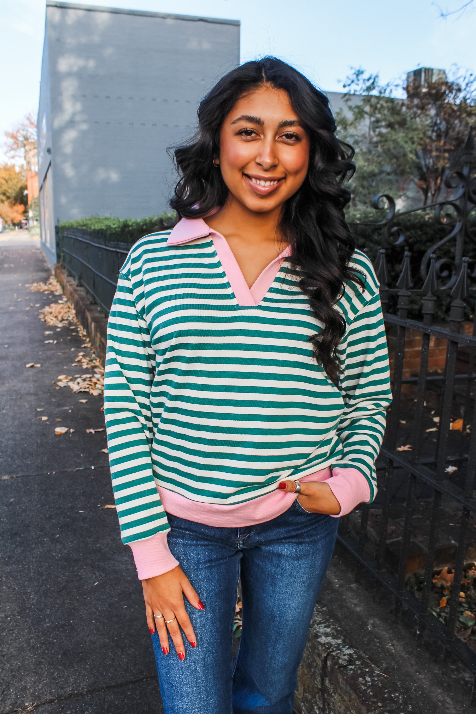 Fun and festive staples for a cute holiday style! This striped essential is fabricated in a soft cotton-blend knit with a relaxed fit for endless styling season after season. The pink and green colorway gives it a preppy and playful style you can dress up or down for any day of the week. With a collared neckline and contrast rib finishing.