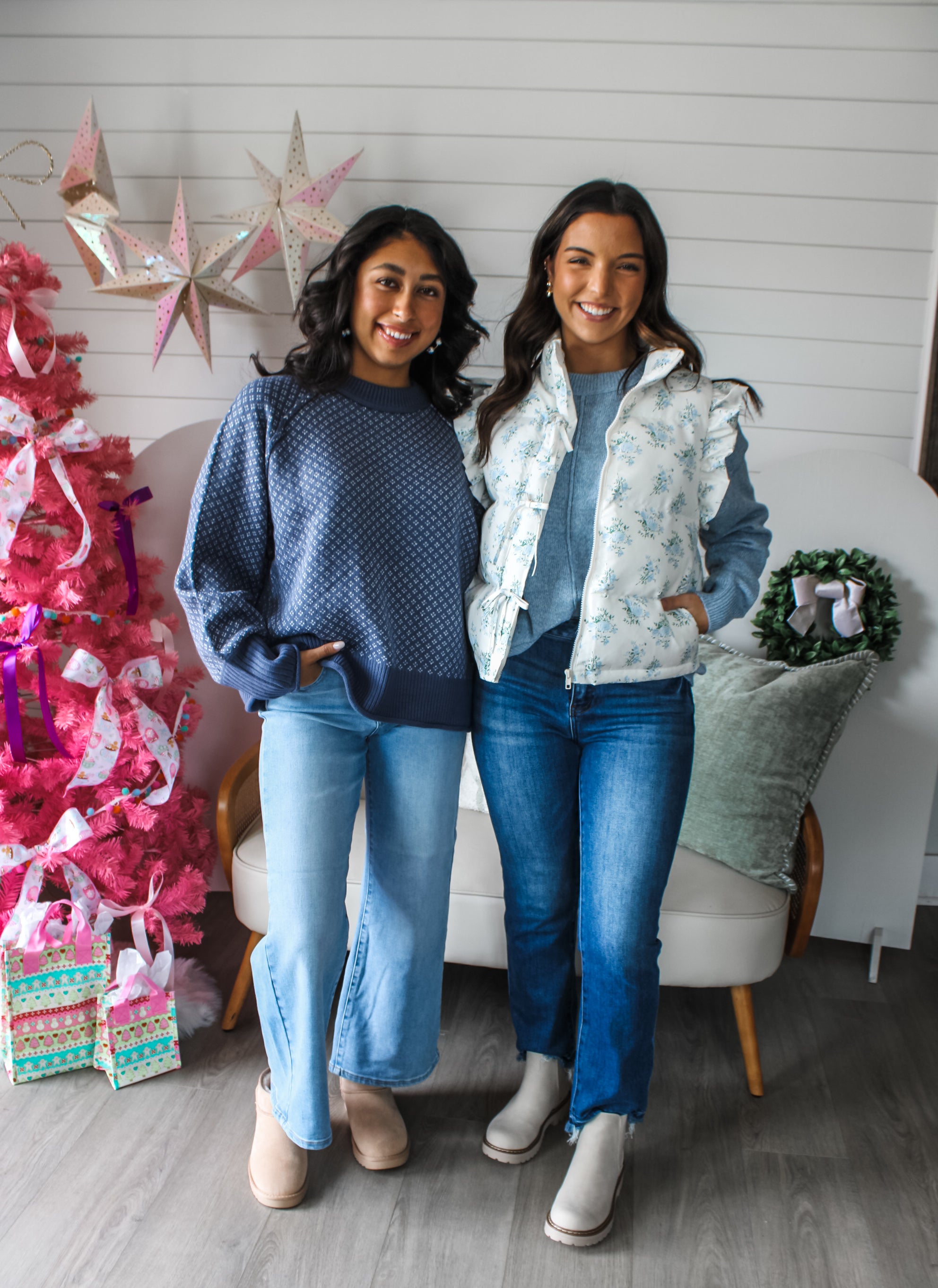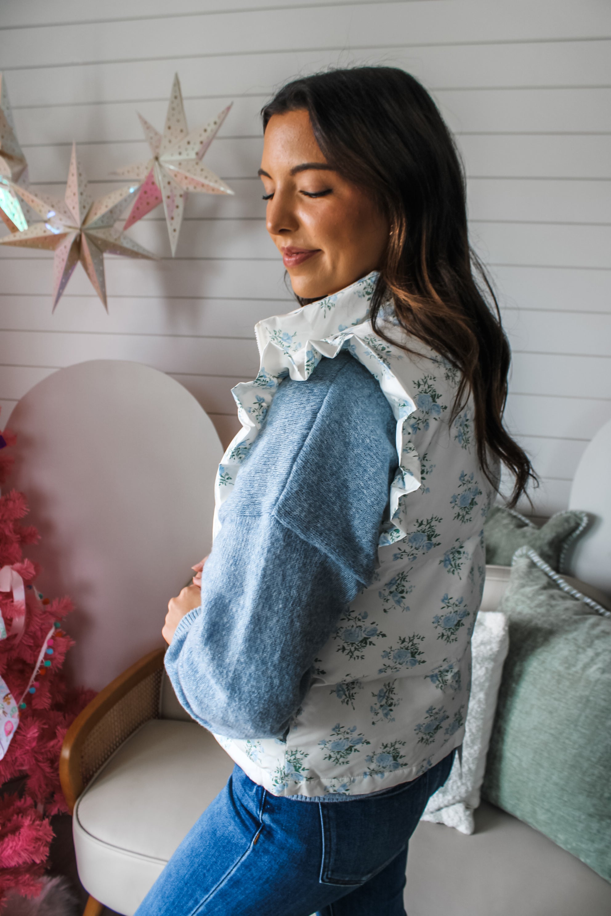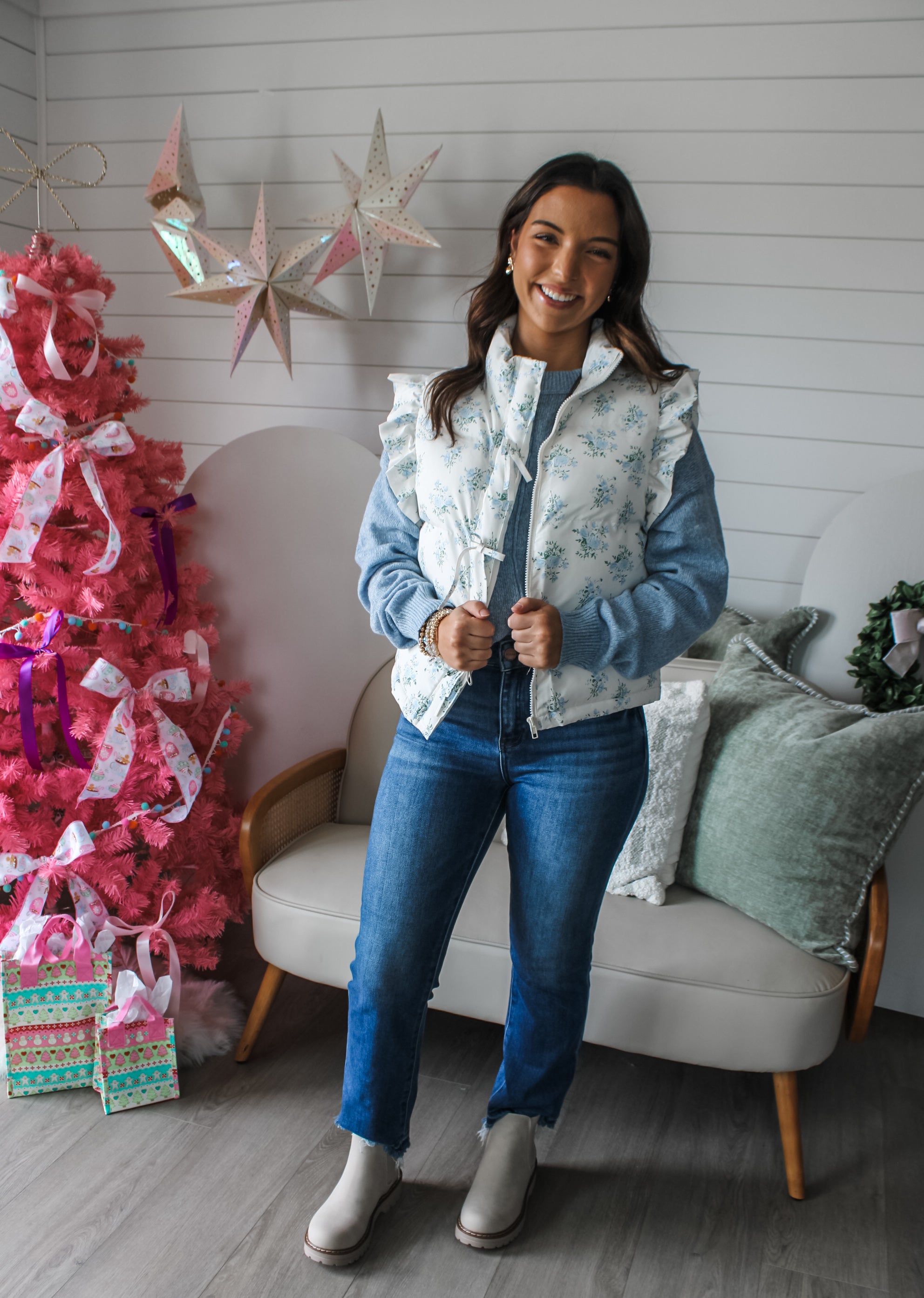 So pretty in a classic ivory and blue colorway, this quilted vest will add a pop of print and warmth to any outfit! The charming floral motif, ruffle sleeves and bow details on the front make this such a sweet statement-maker for the holidays and beyond! Featured in a classic quilted fabrication with a hidden zip front, side pockets and a relaxed fit that’s made for layering.