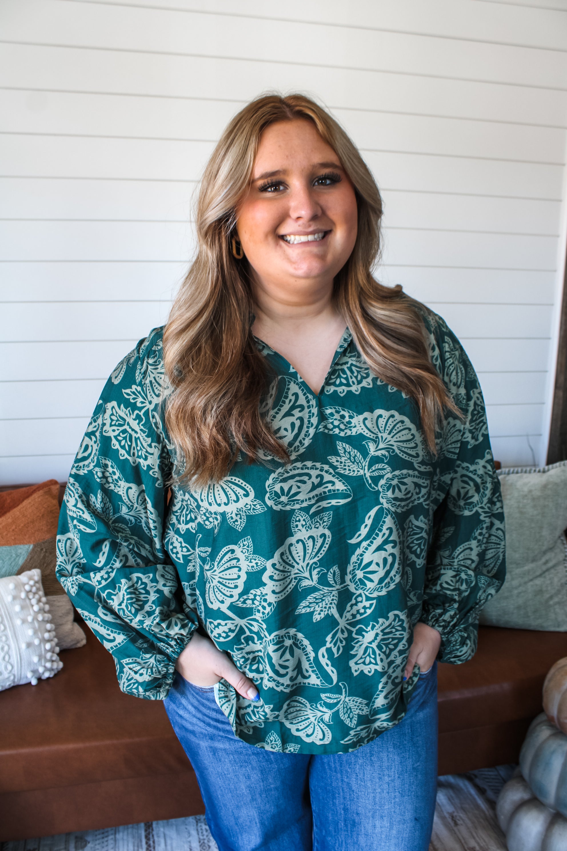 Step into fall with effortless silhouettes and striking prints. Fabricated in a textured woven and featuring a v neckline, balloon sleeves and flowy fit. In a seasonless paisley floral print, this eye-catching top can be dressy or casual depending on how you style it.
