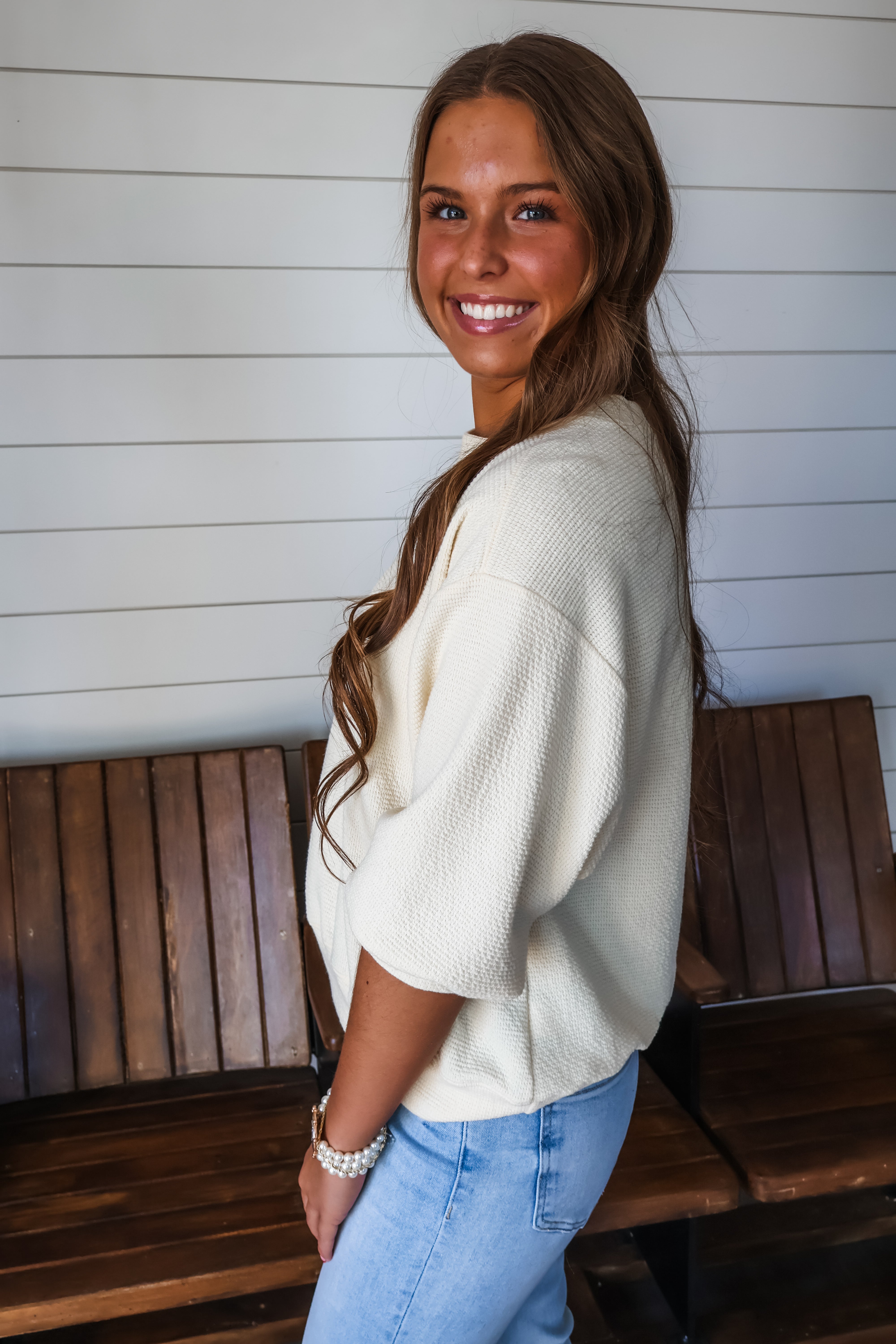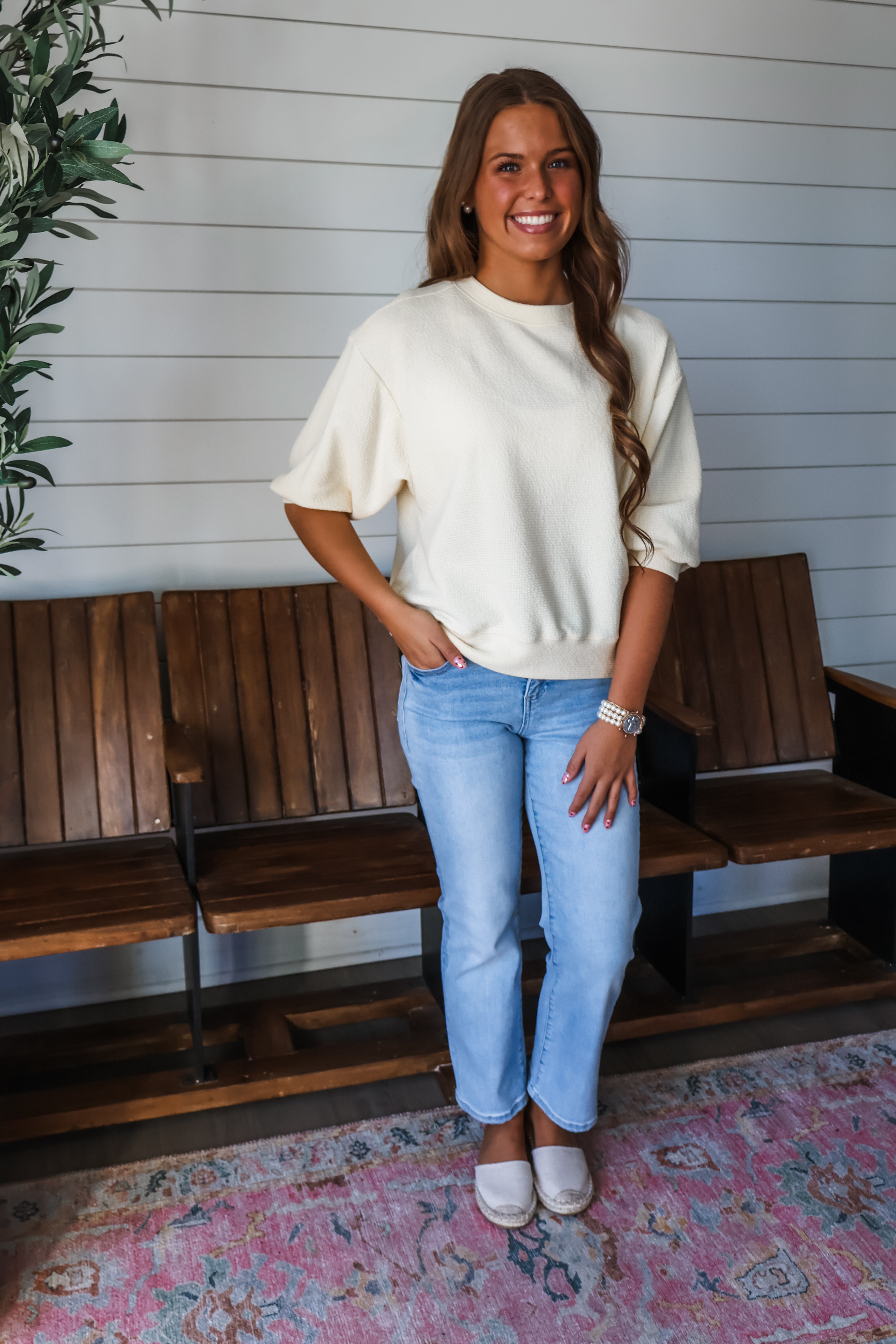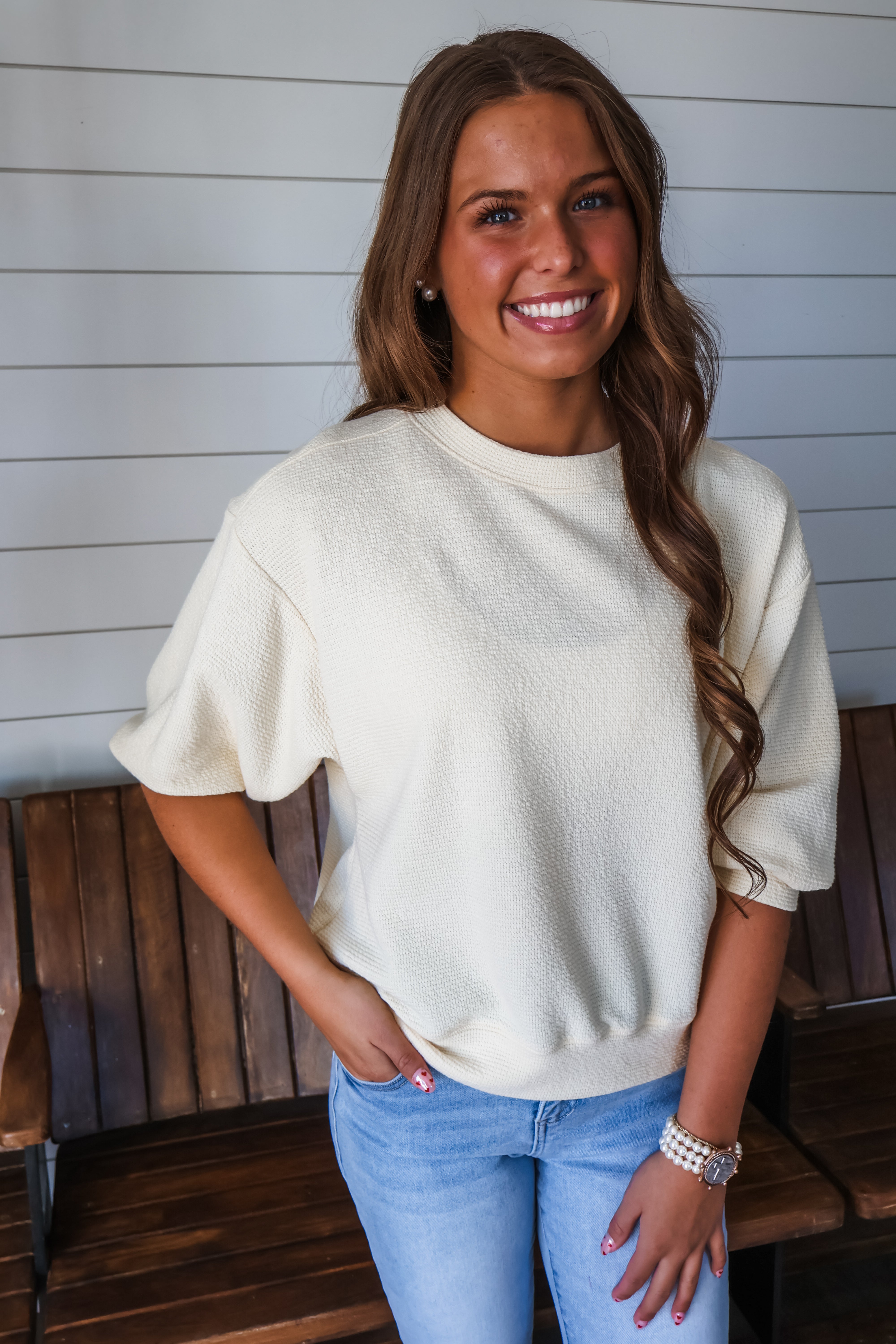 Refresh your spring style with a pop of color! This easy and essential top features drop shoulder elbow length sleeves, a classic crewneck and banded hem. Fabricated in a soft textured knit with a relaxed silhouette that drapes over the body.