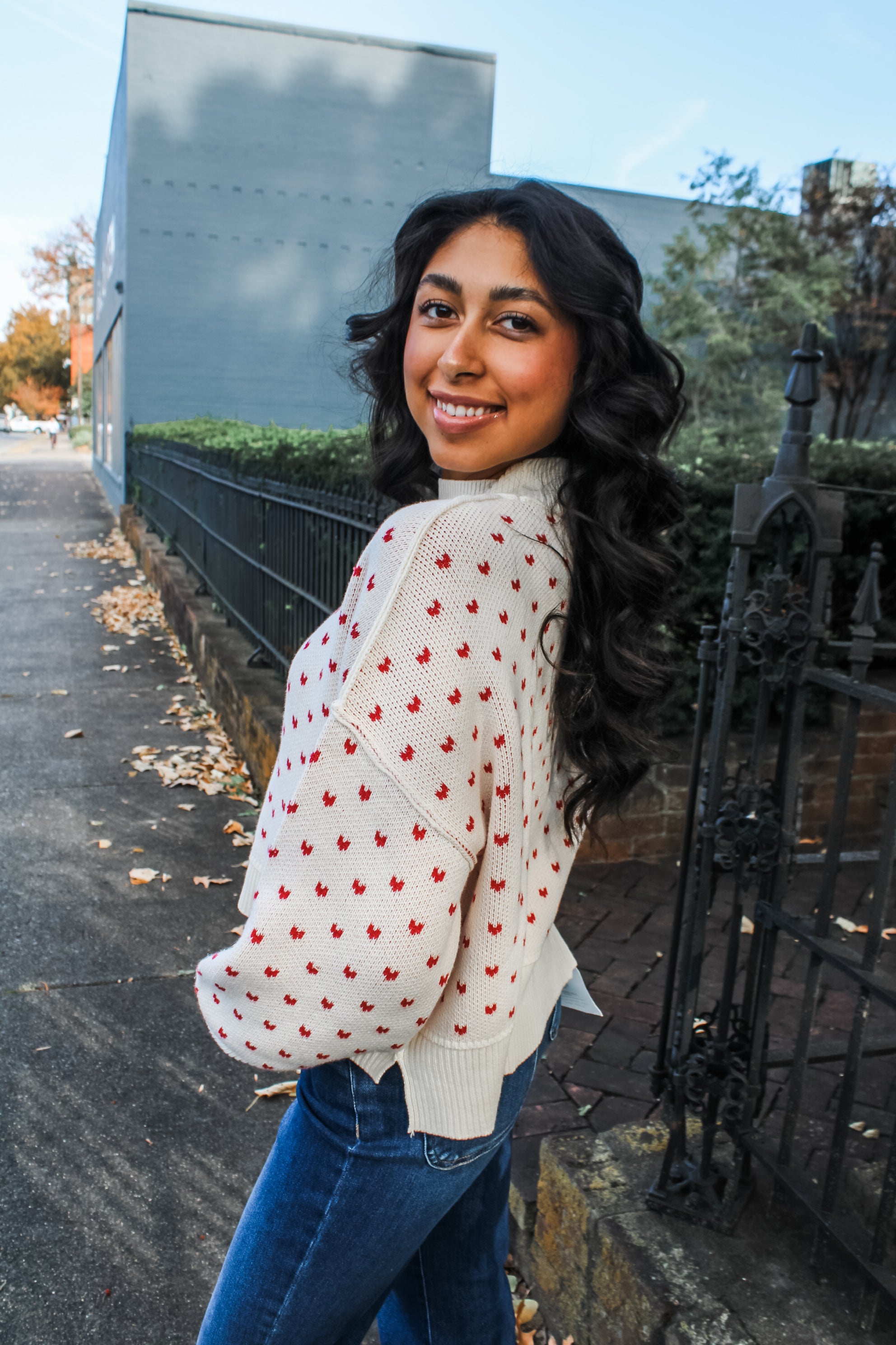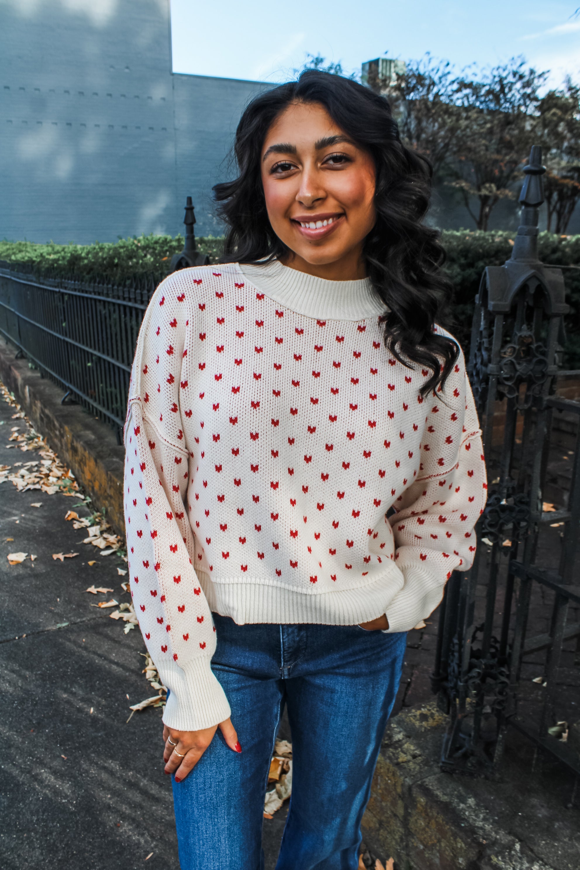 This super cute sweater is a playful refresh for your holiday wardrobe! The heart-inspired pattern gives it such a festive flair, while the slouchy silhouette provides an easy and comfy fit. With a mock neckline, exposed seam detailing, drop shoulder sleeves and a high low hem.