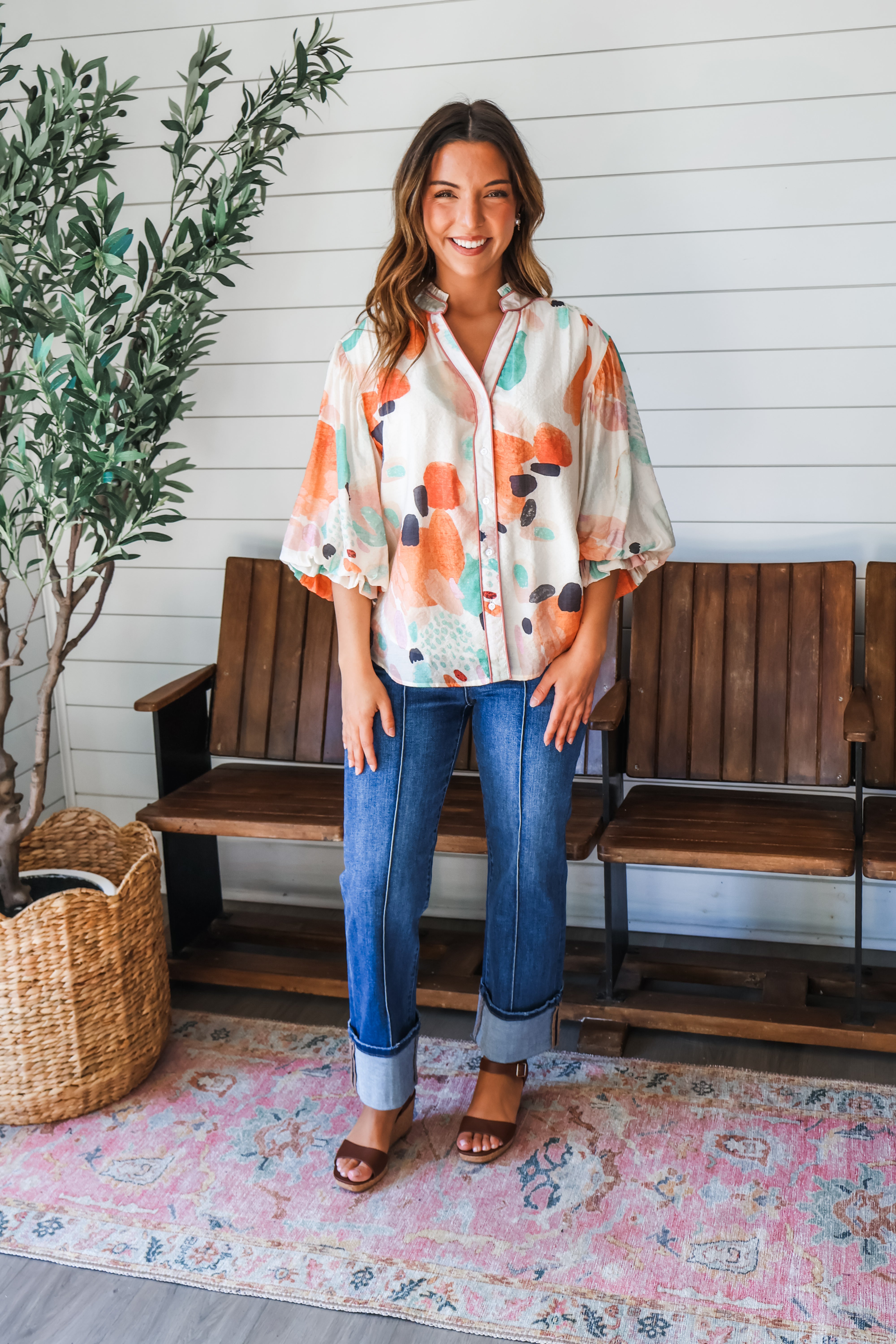 Let your spring style bloom with this beautiful printed top! The painting-inspired motif gives it an eye-catching appeal, while the piping trim detailing and puff sleeves add contrast and charm. Featuring a ruffle trim neckline with a button up front, and gathered fabrication creating a flowy fit. Crafted from a textured woven with full lining, it’s an effortless look that makes a statement.