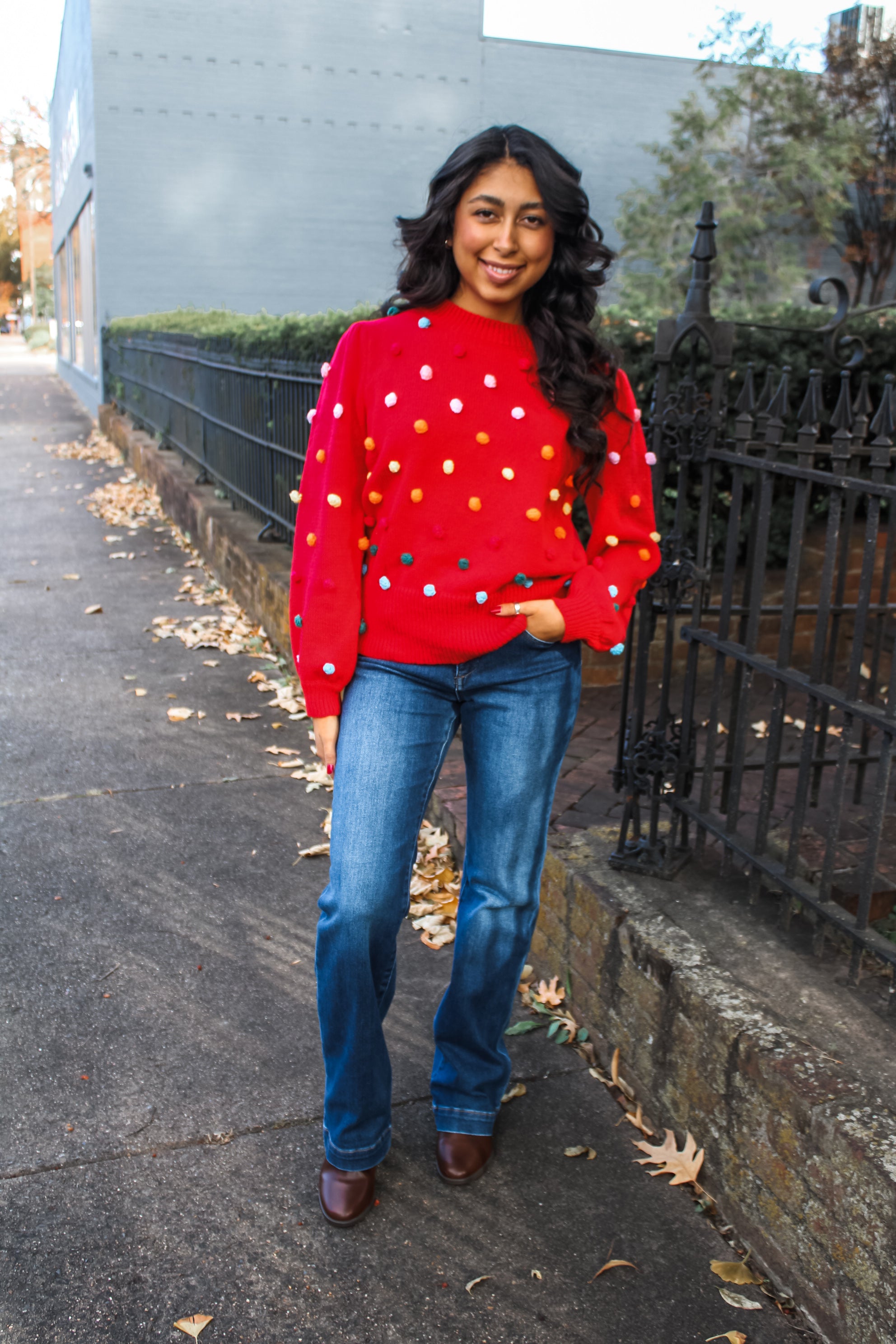 Have a fun and festive style for the holidays! This super cute statement-maker features multicolor pom embellishments that stand out against the cozy red knit for a playful yet polished style. With a crew neckline, puff sleeves, ribbed up hem and a relaxed silhouette.