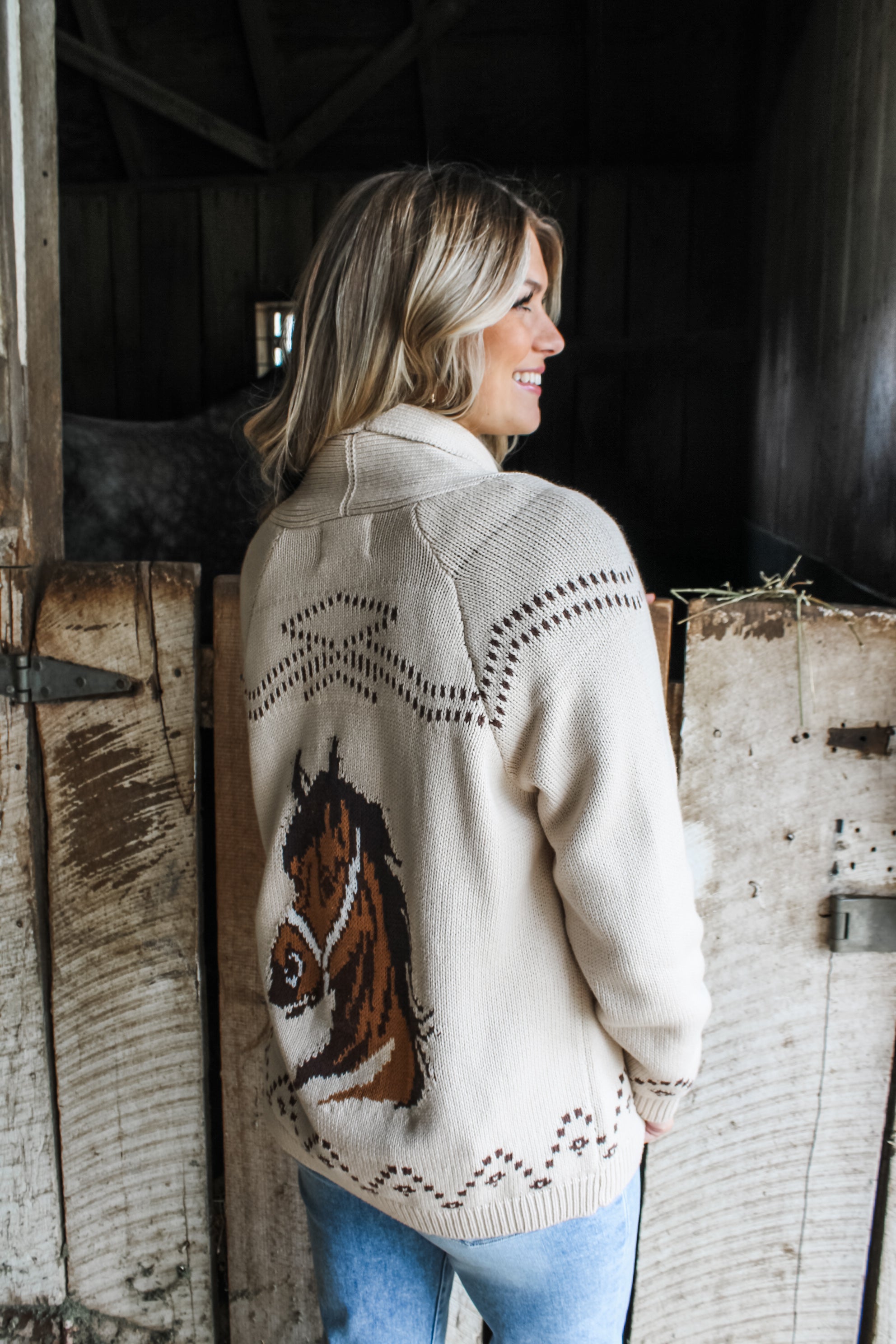 Statement-making pieces to elevate your wardrobe for the holidays and beyond. This beautiful cardigan sweater is featured in a classic open front silhouette with a shawl collar and relaxed fit. The border print design adds a timeless flair and knitted horse on the back gives it a trendy touch.