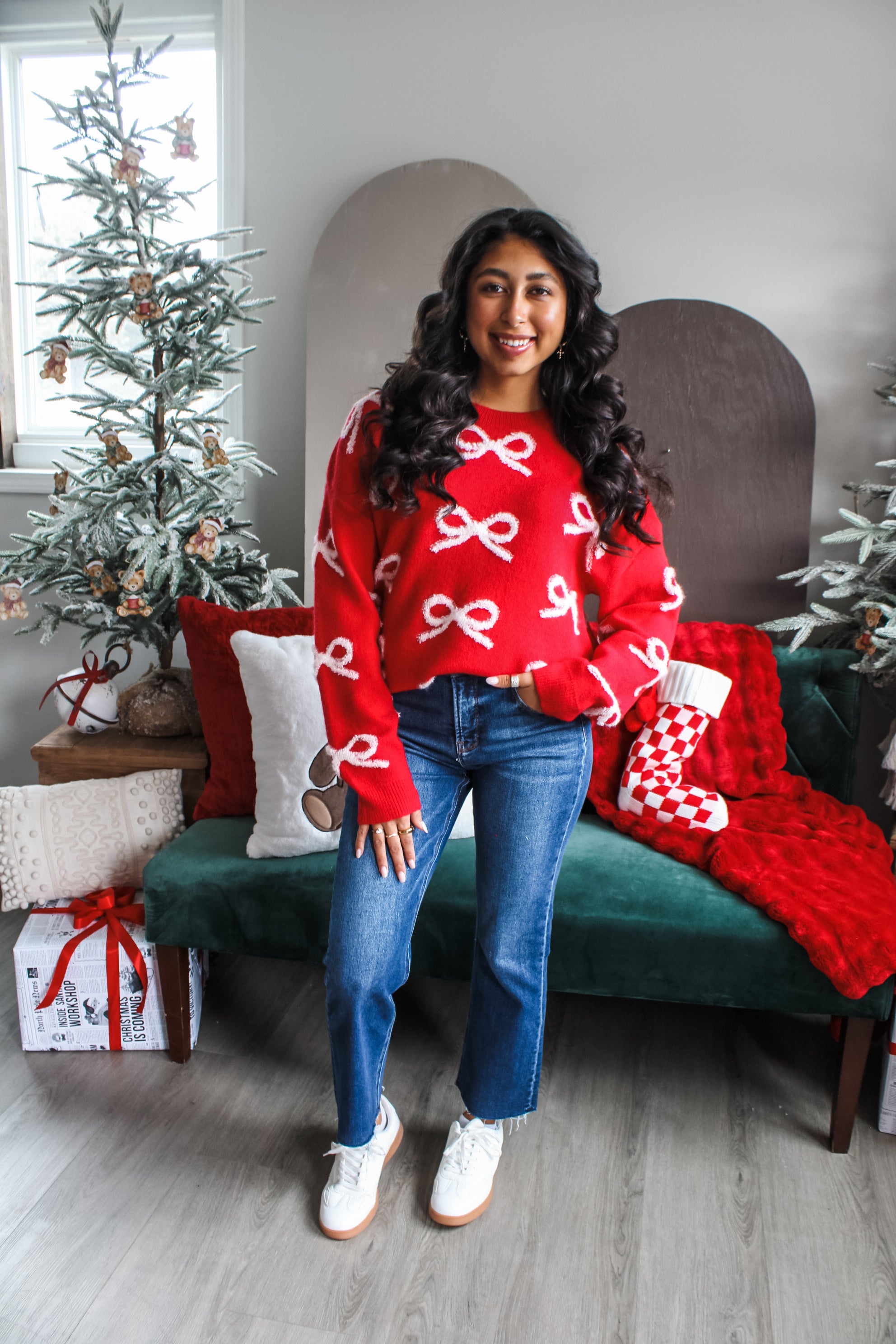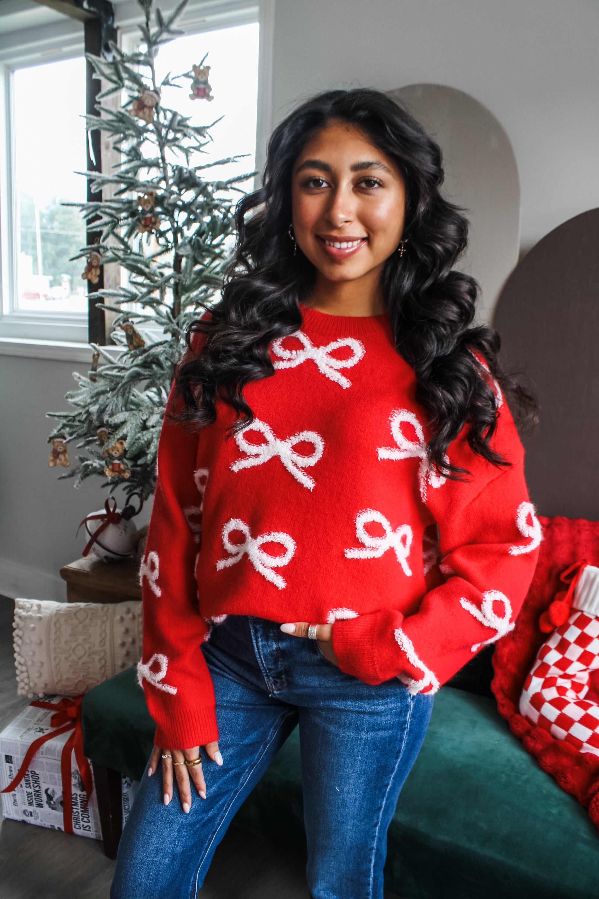 Dress to impress for the holidays! This cute and playful sweater will re-inspire your style with its sweet and trendy bow design! Fabricated in a soft knit with a crew neckline, drop shoulder sleeves and contrast rib finishing. With a slouchy silhouette for a comfy and cozy fit.