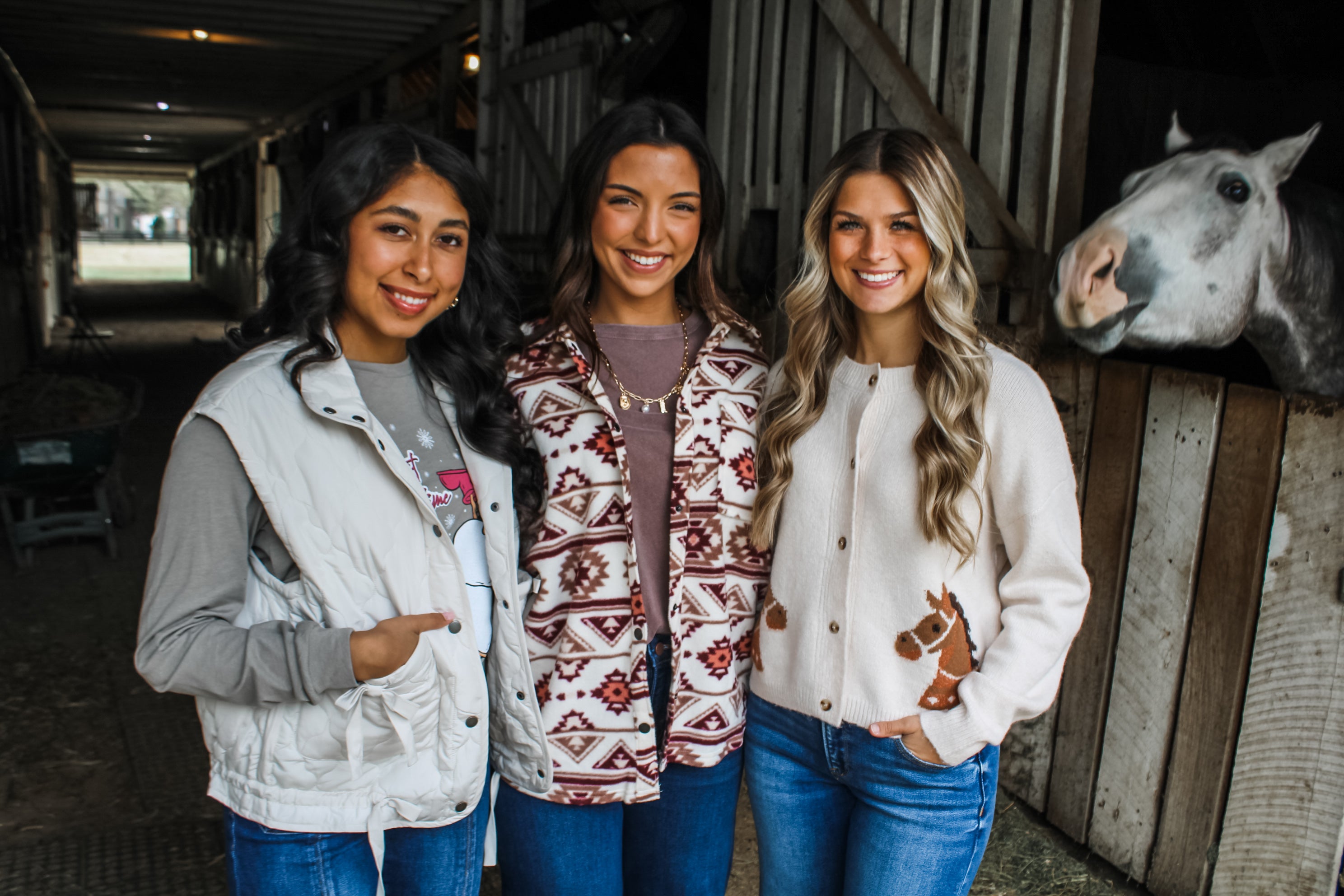 Statement-making pieces to elevate your wardrobe for the holidays and beyond. This playful look is crafted from a soft and cozy brushed knit with a cute and trendy horse print. Featuring a crew neckline, drop shoulder sleeves, contrast rib finishing and a relaxed silhouette.