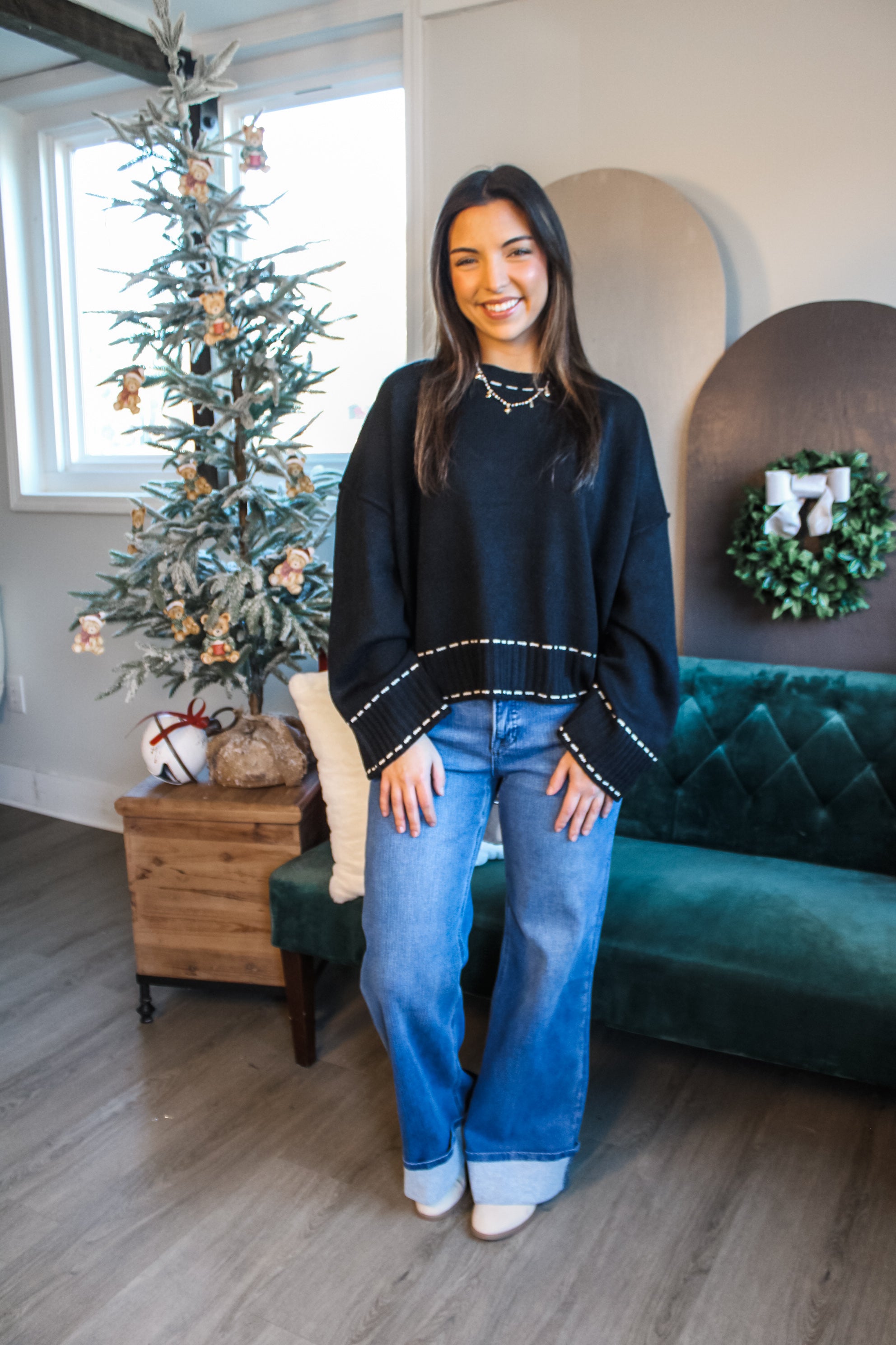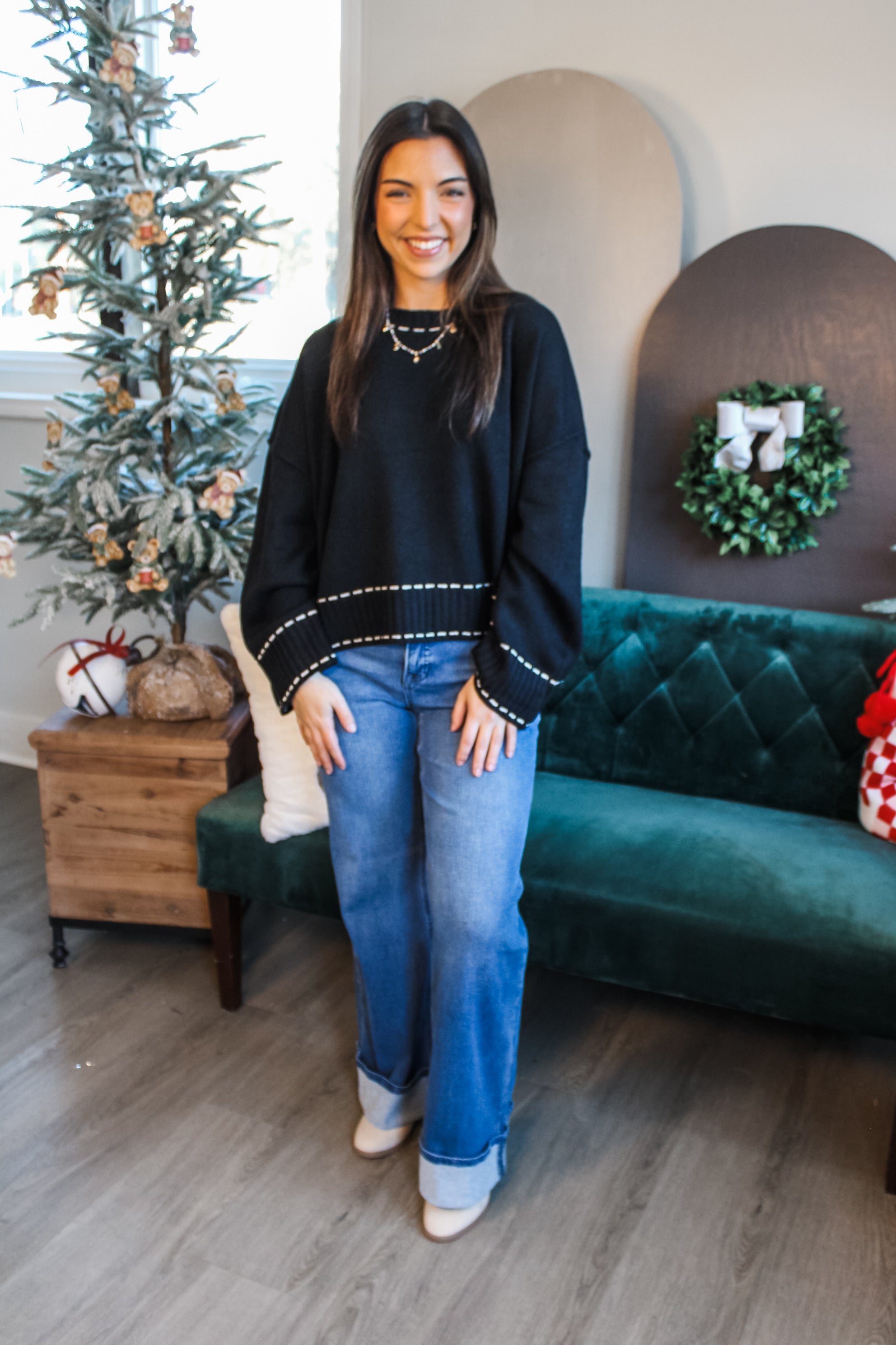 So chic and cozy, this sweater will become your new style favorite! We love the dash stitching design, it gives this look a playful yet sophisticated flair. Fabricated in a soft braided knit that drapes over the body for that perfectly slouchy fit. Featuring a crew neckline, wide sleeves and contrast rib finishing. It’s a versatile look you can dress up or down season after season.