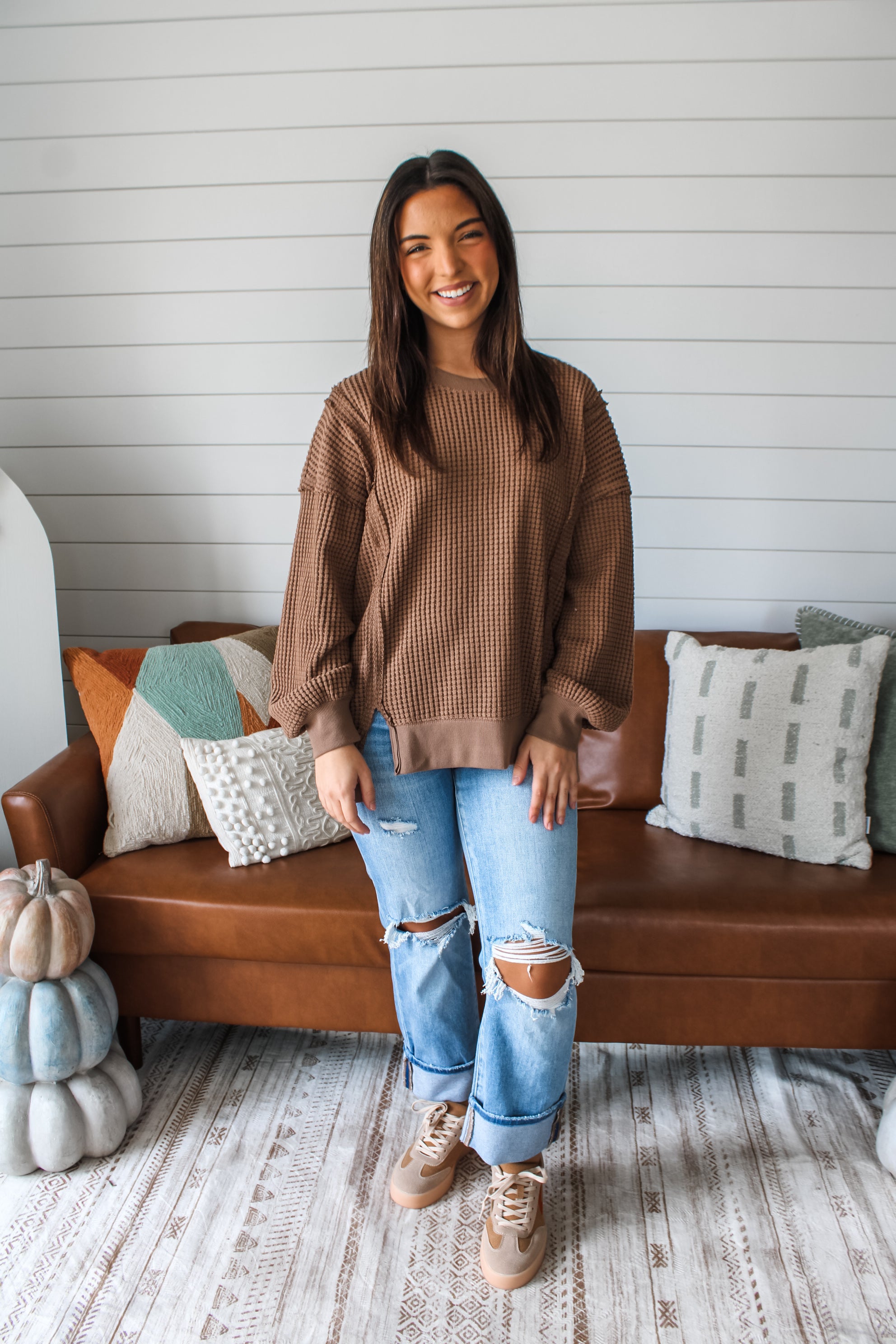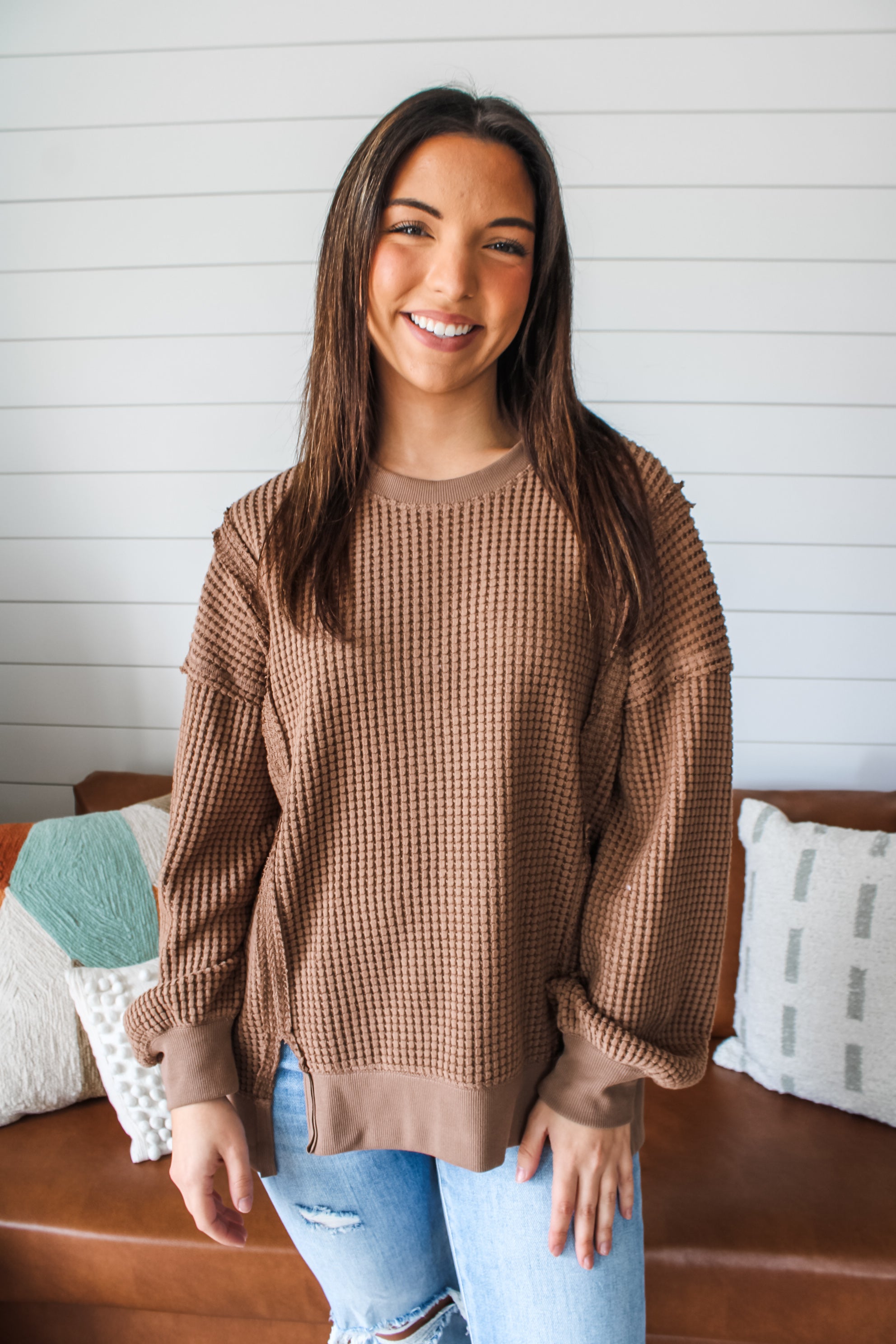 Introducing the Long Weekends Pullover — a classic crewneck staple with a cool edge. This current essential is fabricated in a textured waffle knit with an easy loose fit for endless styling season after season. With exposed seaming, drop shoulder sleeves, rib contrast finishing and a front slit hem.