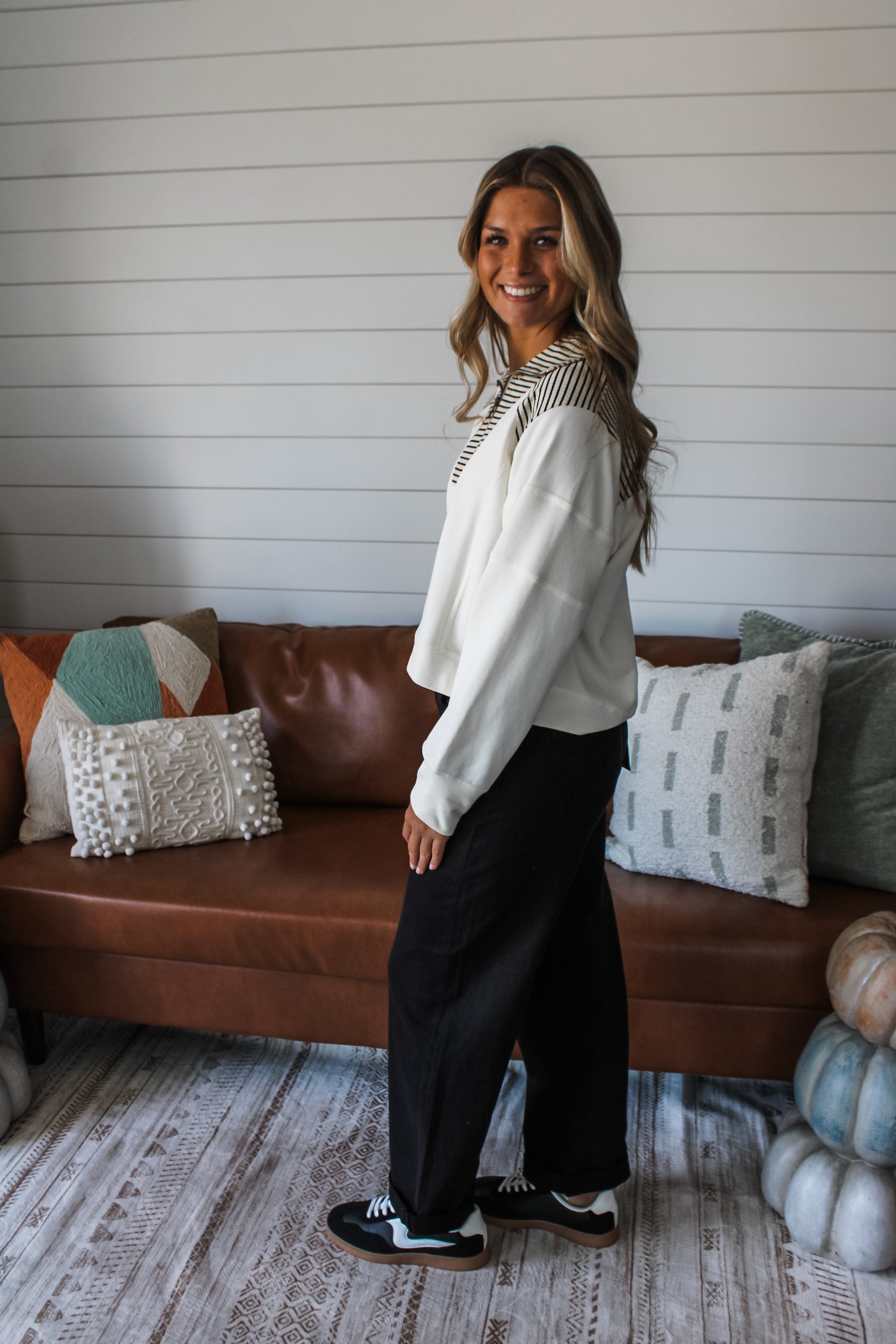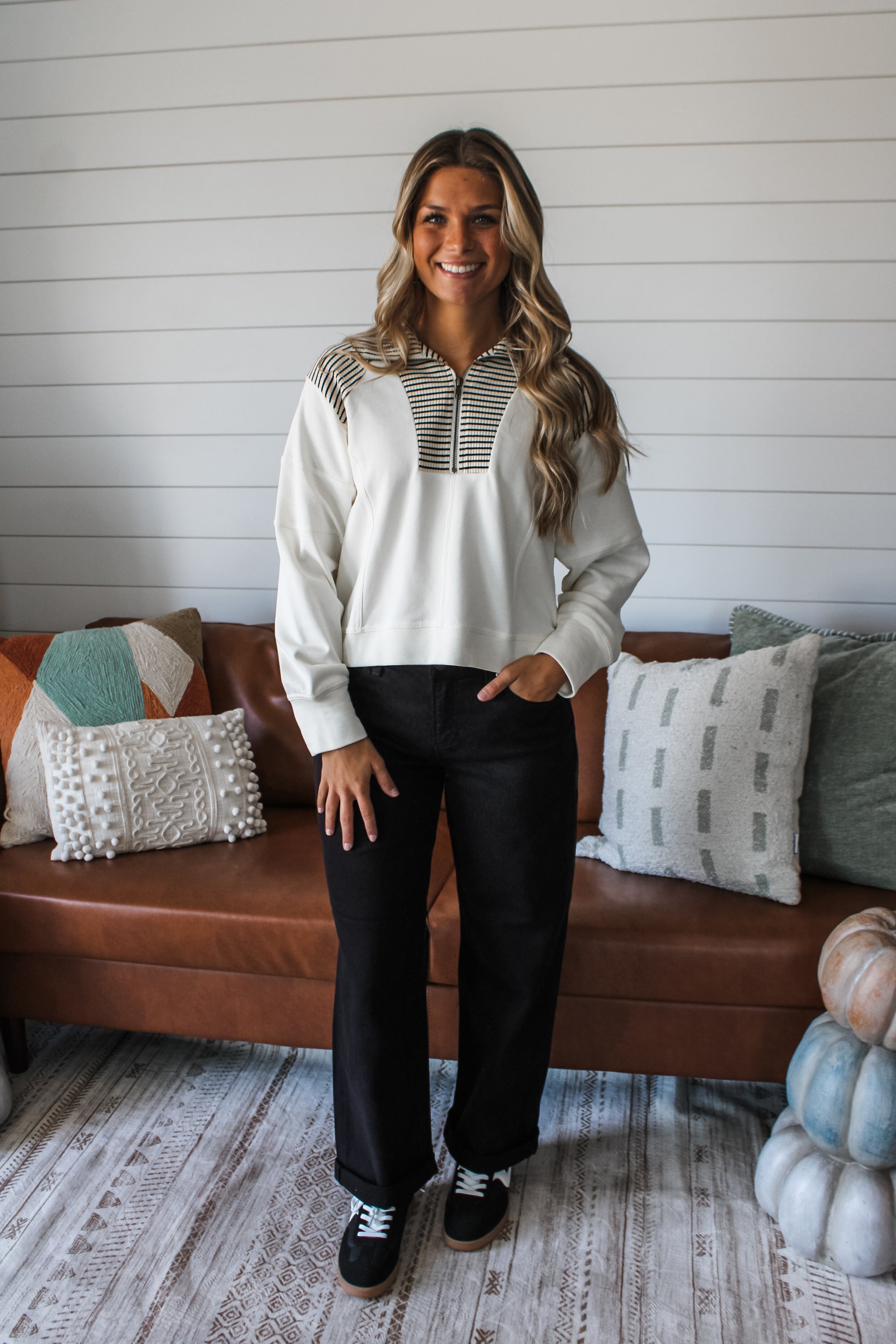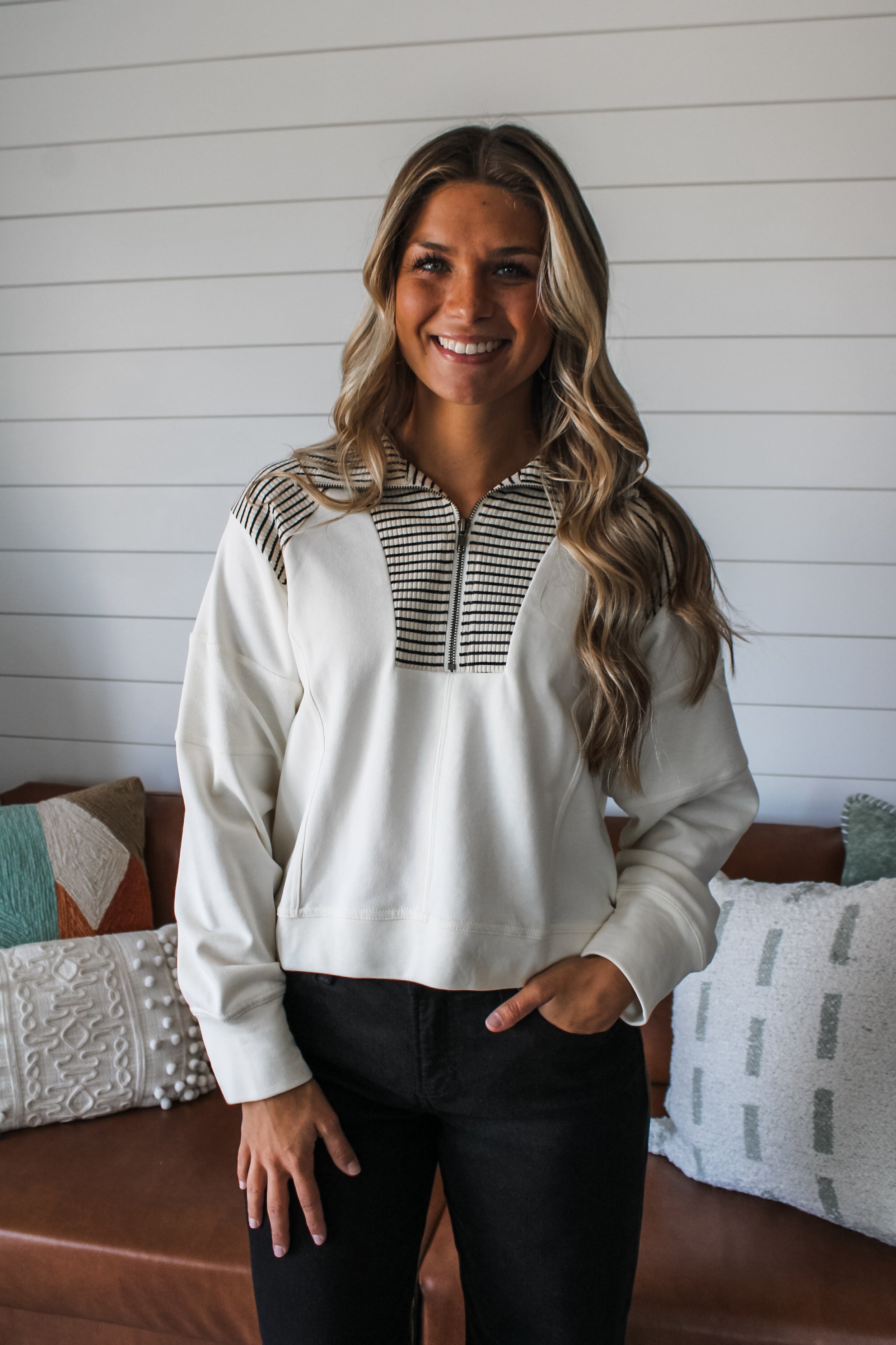 Stylish essentials with a sporty twist. This trendy take on the half zip pullover features a retro-inspired look with striped contrast details. With a collared neckline, defined seaming, drop shoulder sleeves and a relaxed silhouette.