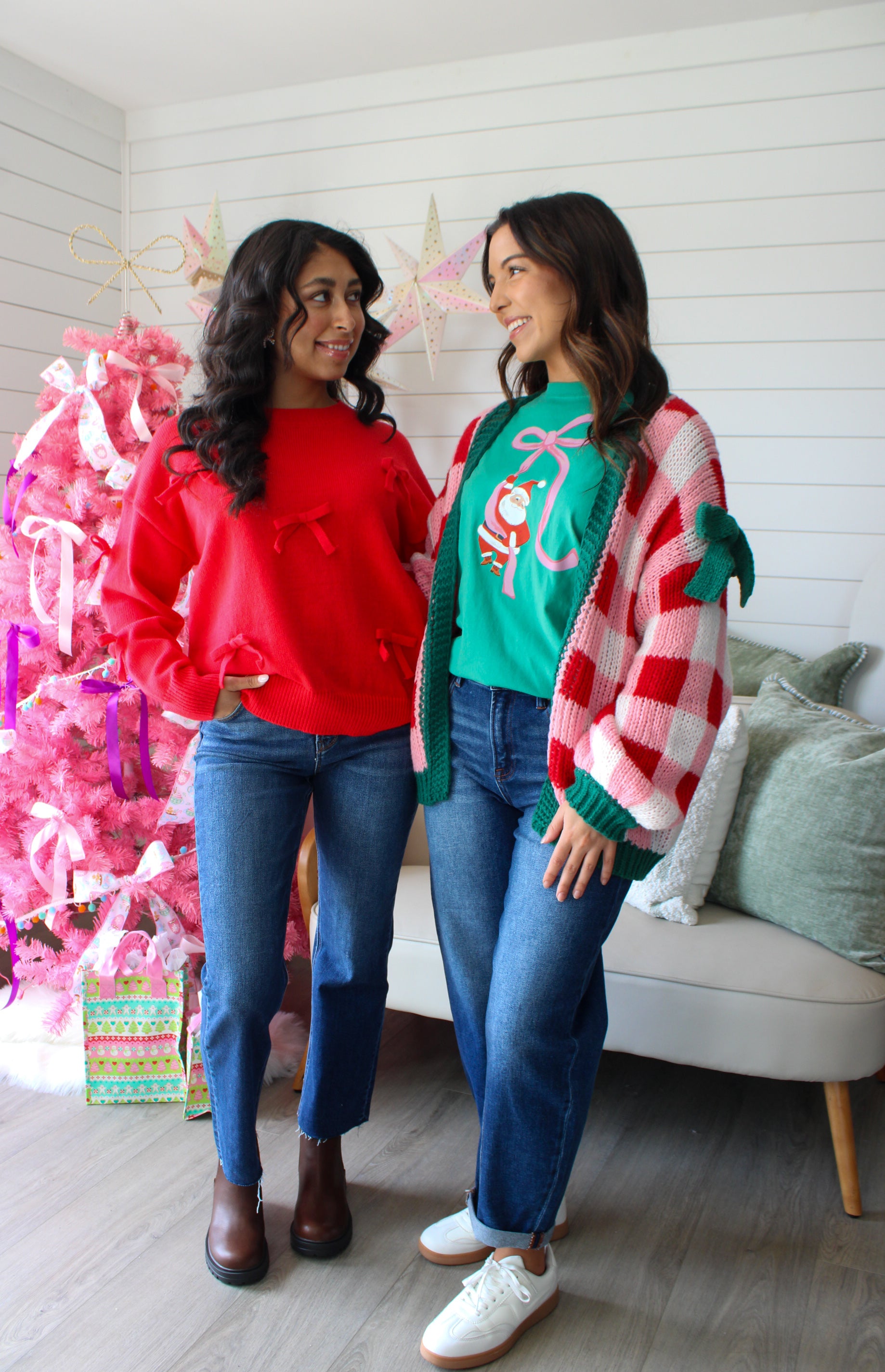 Pretty and playful, this red sweater will re-inspire your holiday style! A super cute update to the cozy classic, it features bow tie details for a trendy twist! Fabricated in a soft knit with a crew neckline, drop shoulder sleeves and contrast rib finishing.