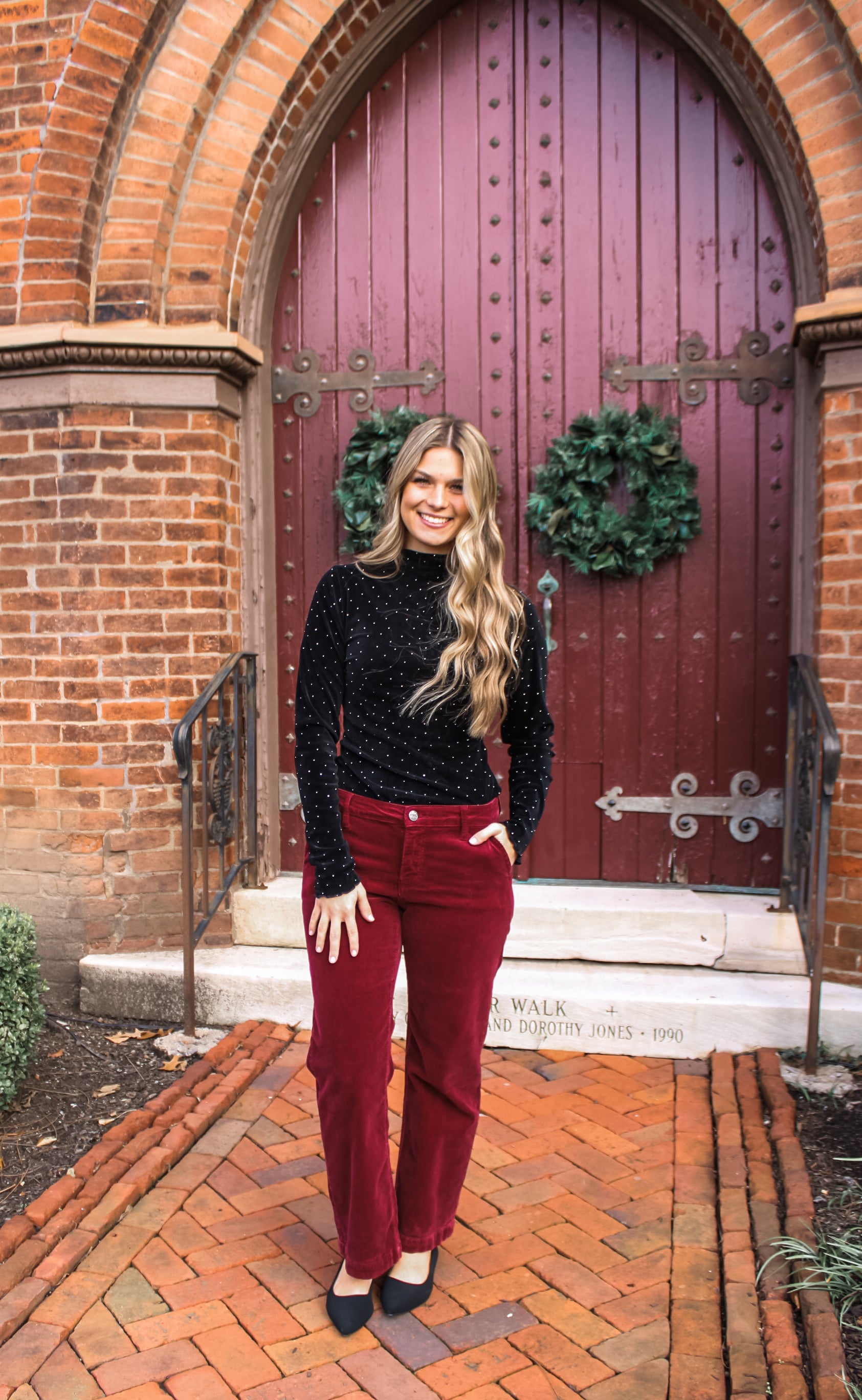 ‘Tis the season to sparkle! This embellished top is a classic yet eye-catching look for the holidays and beyond! Crafted from a rich velvet fabrication, with a mock neckline, lettuce hem finishing and a simple silhouette.