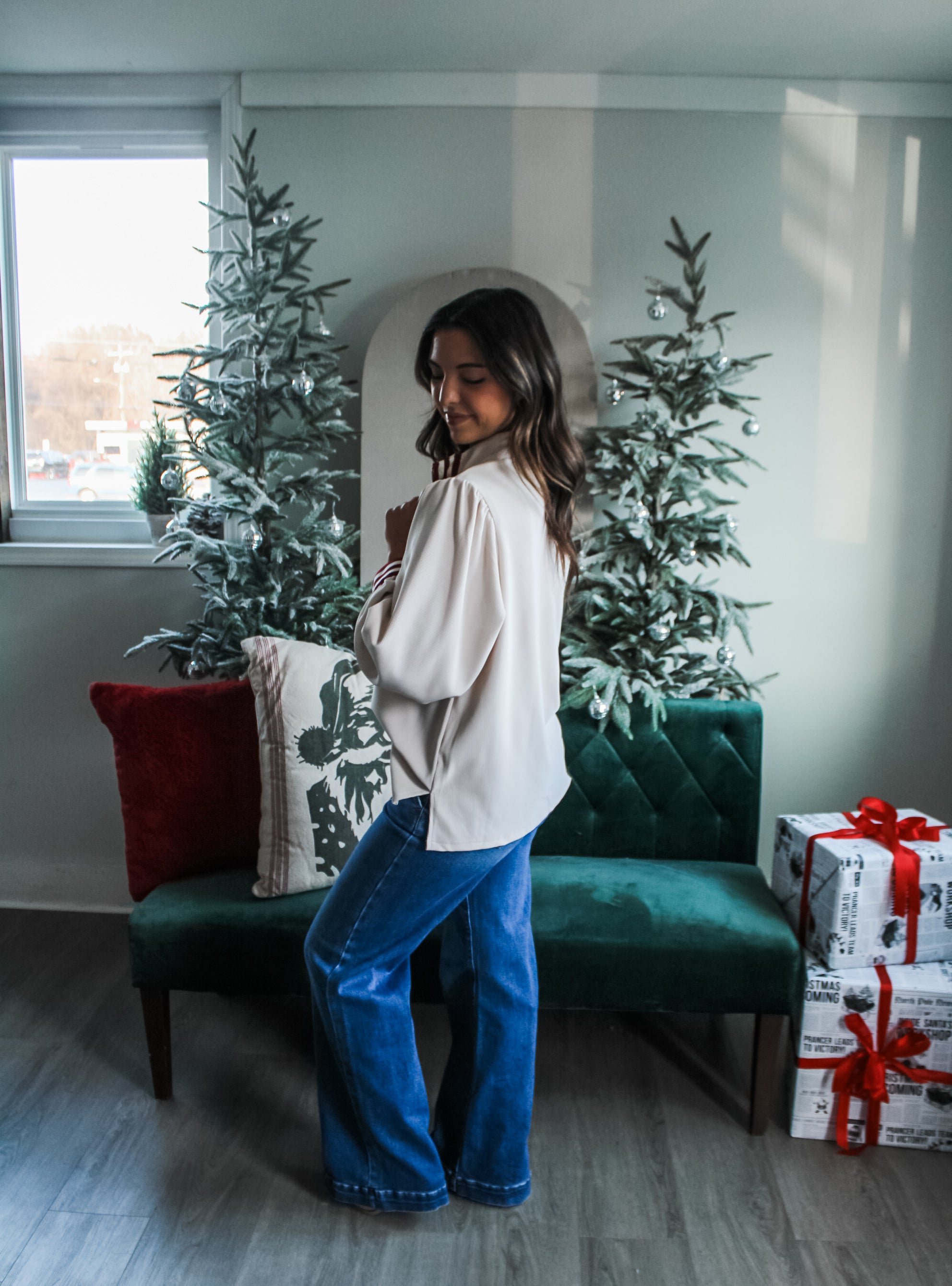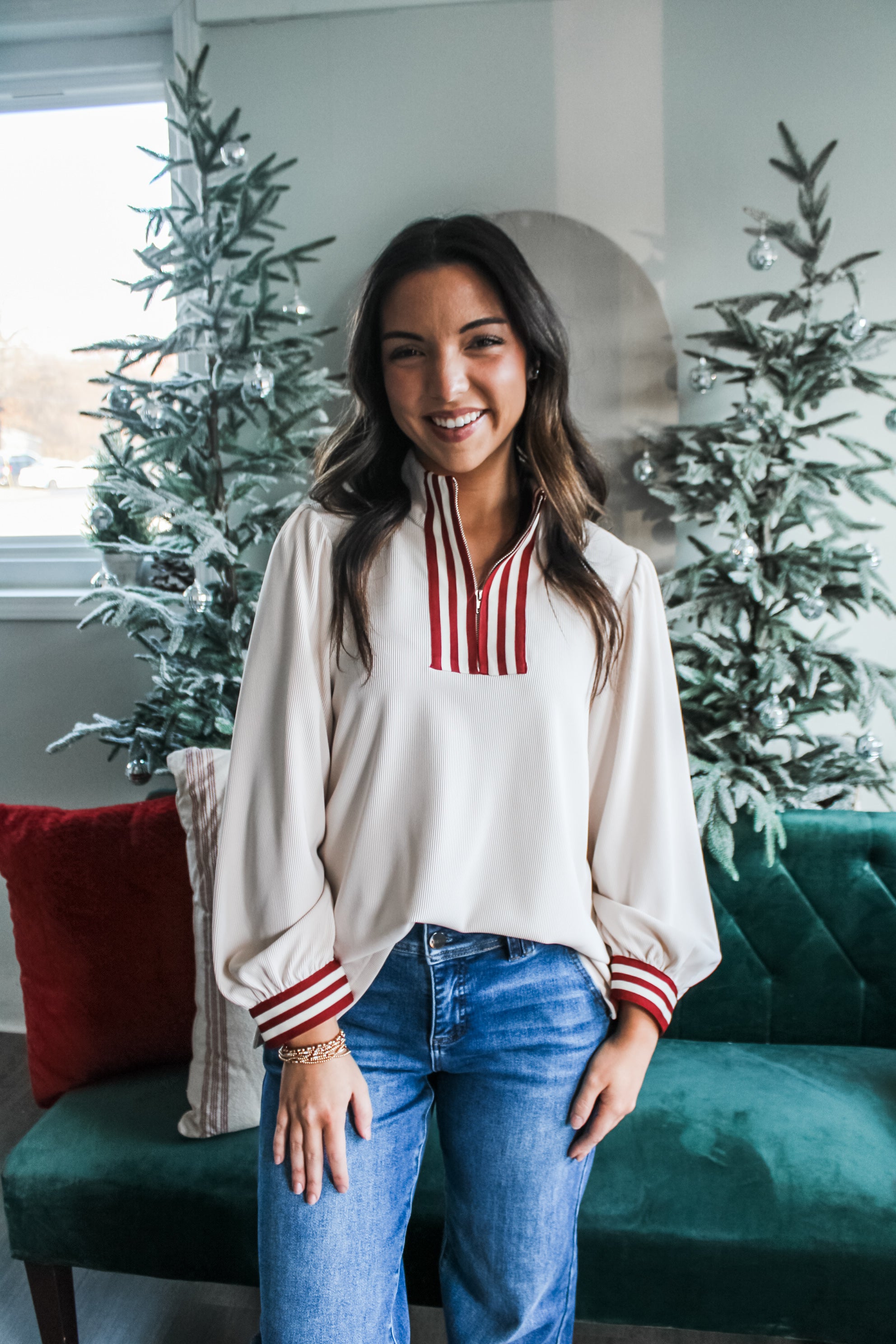 Effortlessly sophisticated styles that make you stand out. Fabricated in a rib textured knit, this elegant blouse features an eye-catching striped contrast design, a half zip neckline and balloon sleeves. With a flowy silhouette that flatters all, this chic top can be dressed up or down for the holidays and beyond.