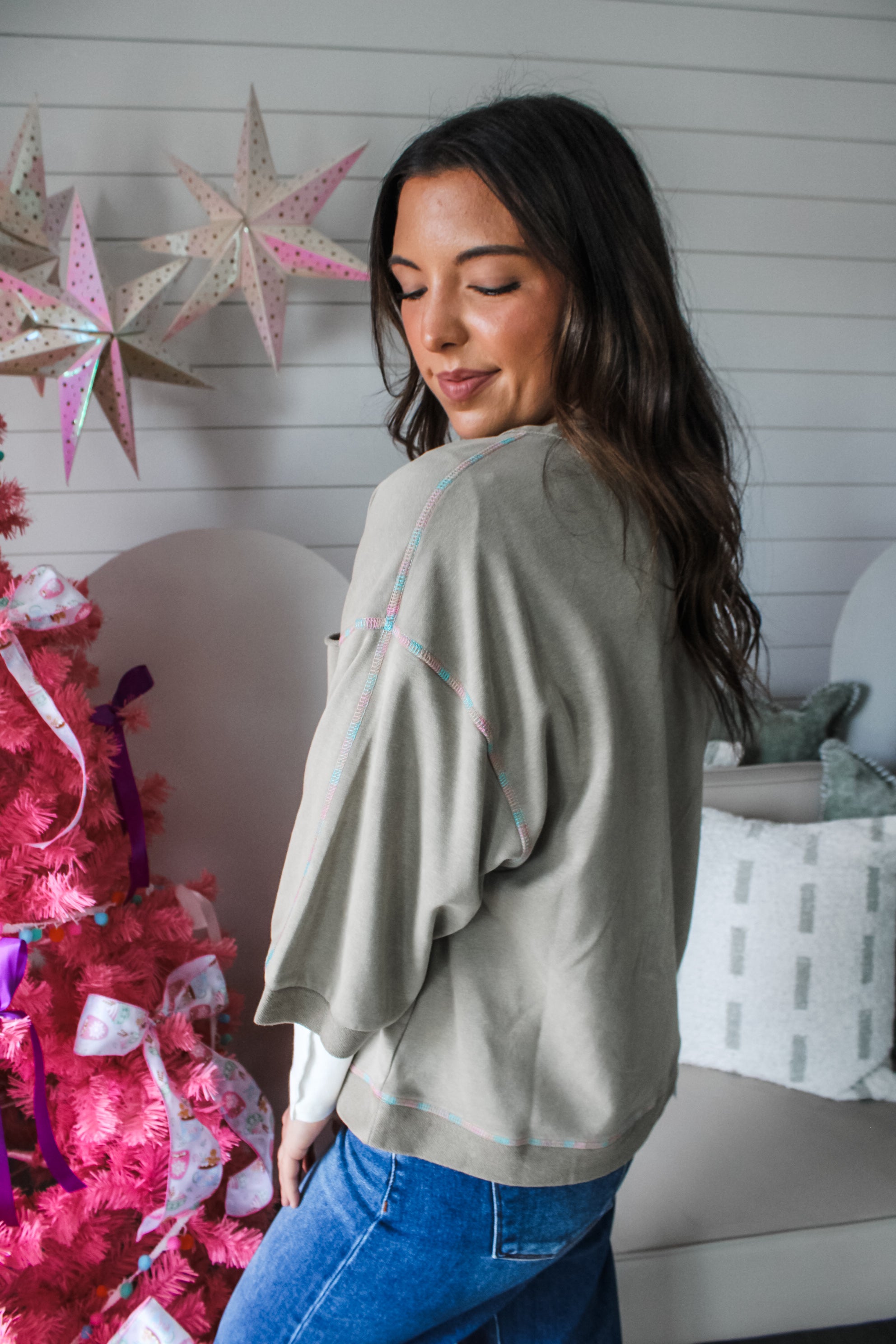 So cute and comfy, this cardigan top is a fun look you can wear on its own or layered over basic knits and graphic tees. Crafted from a soft terry cotton knit, with a crew necklline, colorful stitching details, chest pocket, elbow length sleeves and a breezy silhouette.