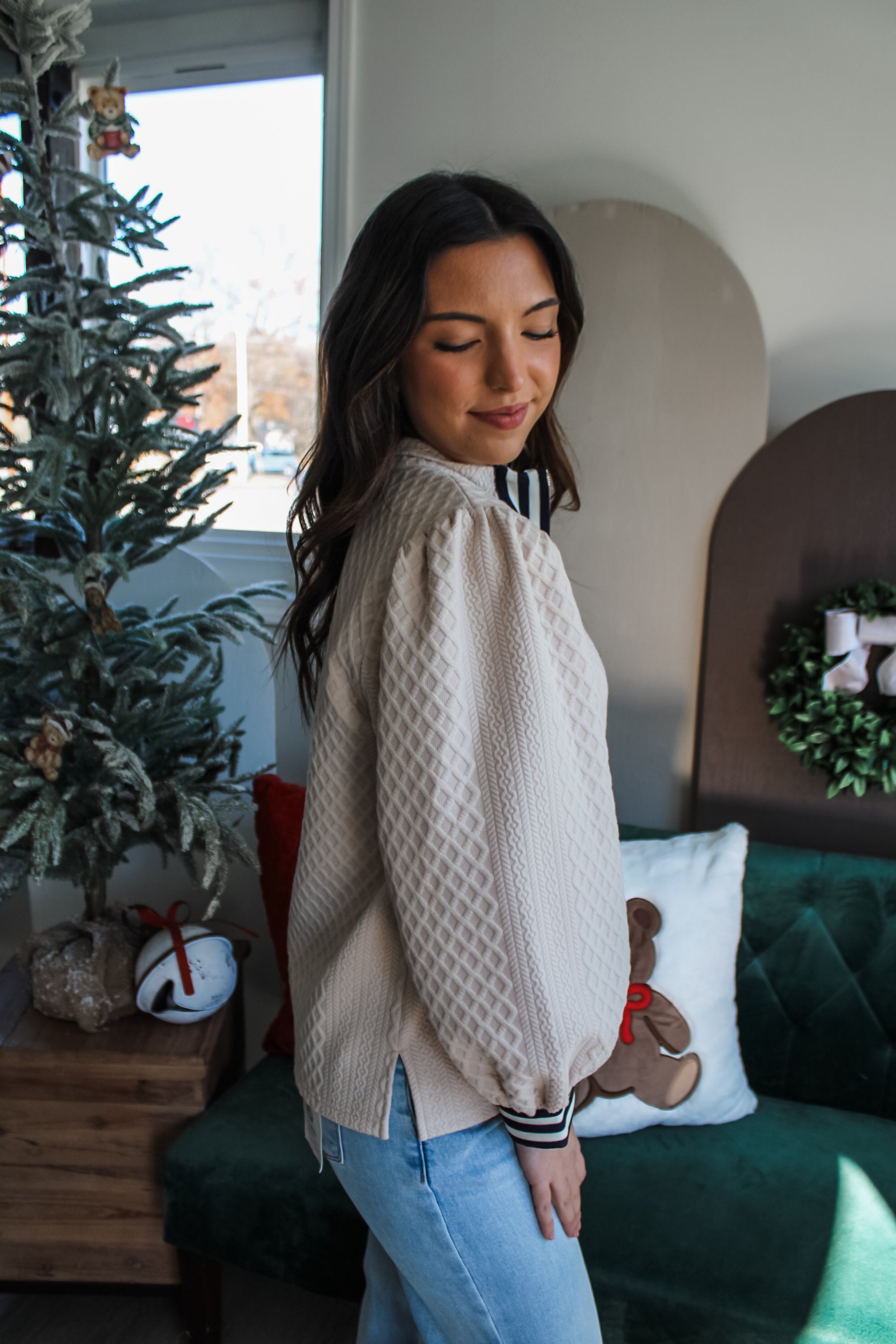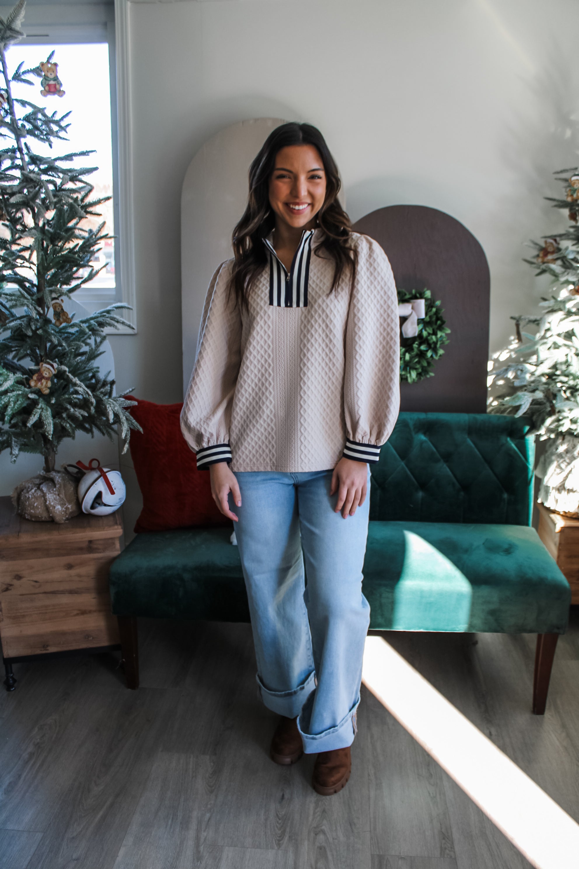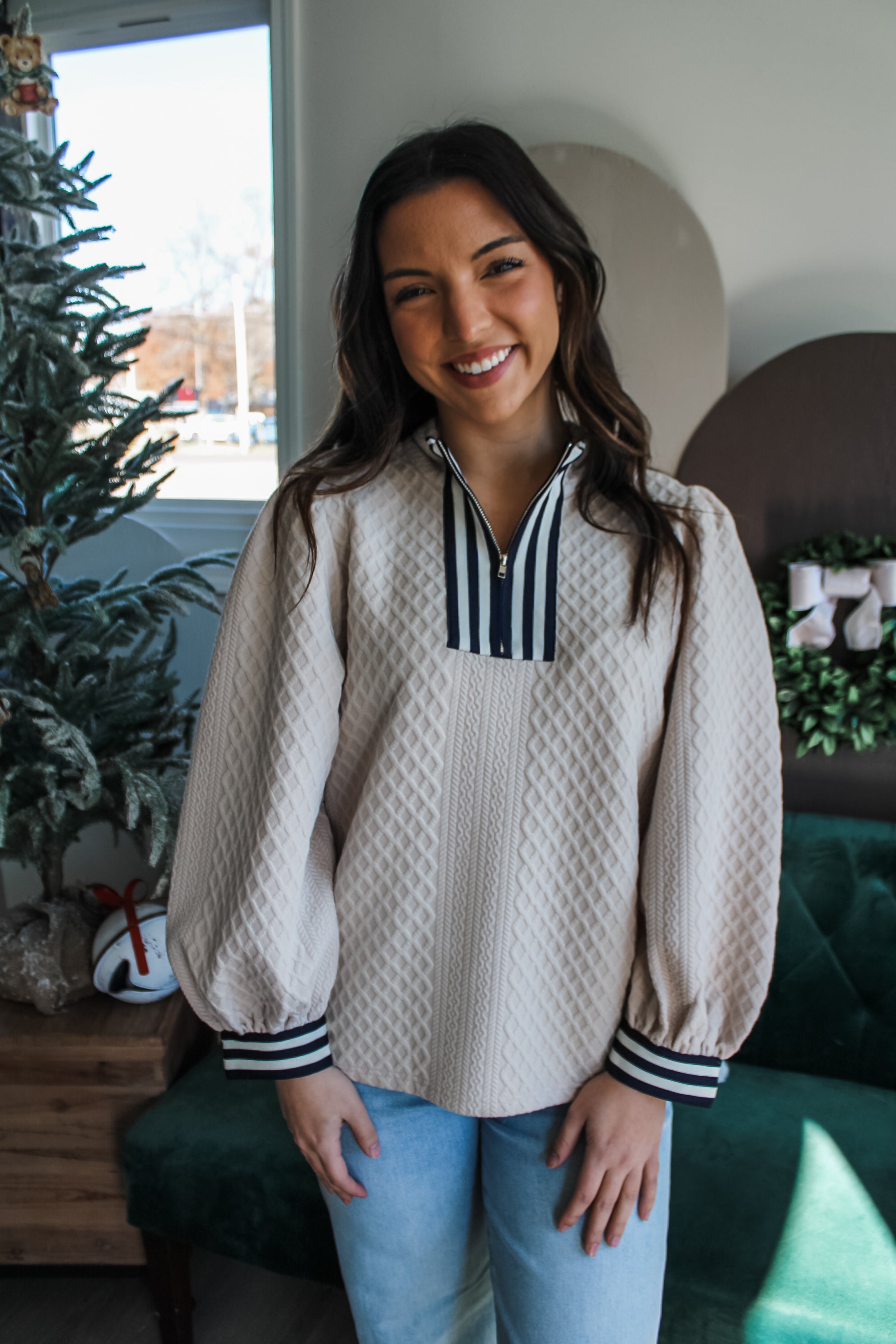 Equal parts trendy and timeless, this top is a chic neutral style for the holidays and beyond. Fabricated in an embossed texture knit, this chic look features an eye-catching striped trim design with a standing collar, zip neckline, lantern sleeves and a flowy silhouette. It’s a versatile piece that’s sophisticated enough for the office and stylishly festive for holiday gatherings.