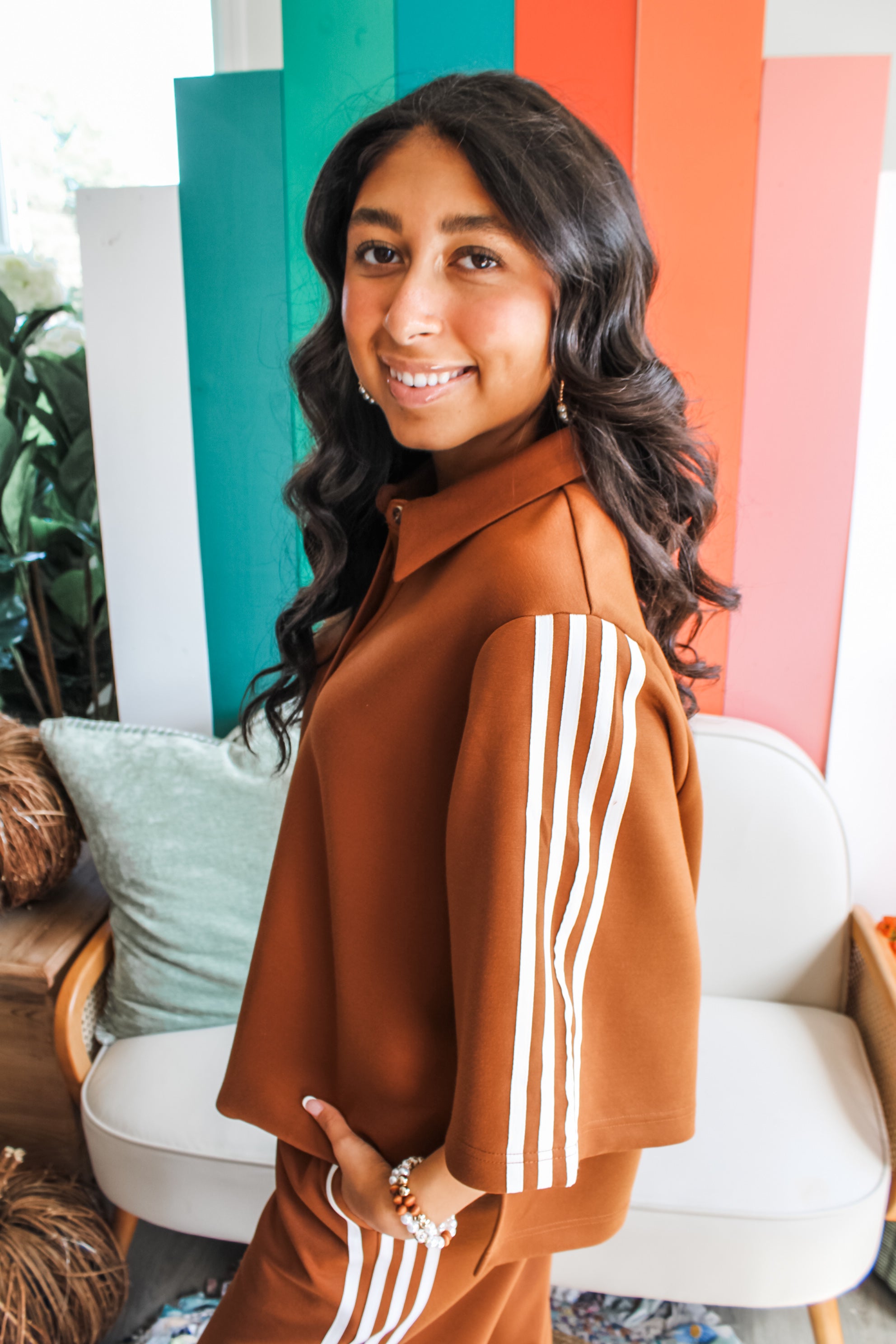 Luxe meets leisure in this super chic polo top. Smooth to the touch in a scuba knit fabrication, it’s an effortless look you can dress up or down all year long. Featuring a collared button up neckline, a relaxed silhouette and side stripe detailing for contrast and a sporty vibe.