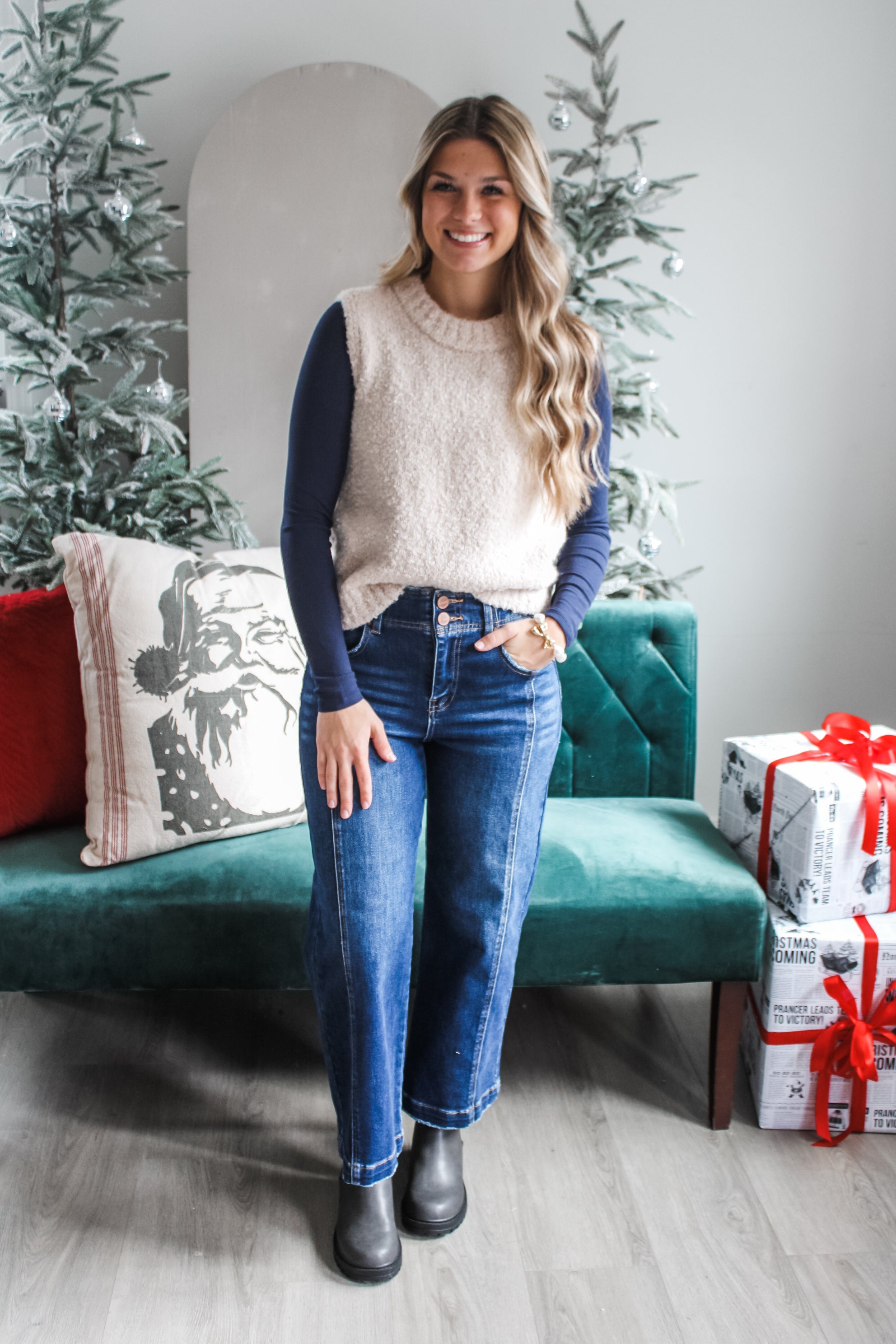 Add a chic and cozy feel to your winter wardrobe. This simple yet sophisticated sweater vest is fabricated in a soft boucle knit for a beautifully textured style you can toss over button ups, basic bodysuits and printed mesh knits. With a classic crewneck, rib contrast hem and a relaxed silhouette silhouette.
