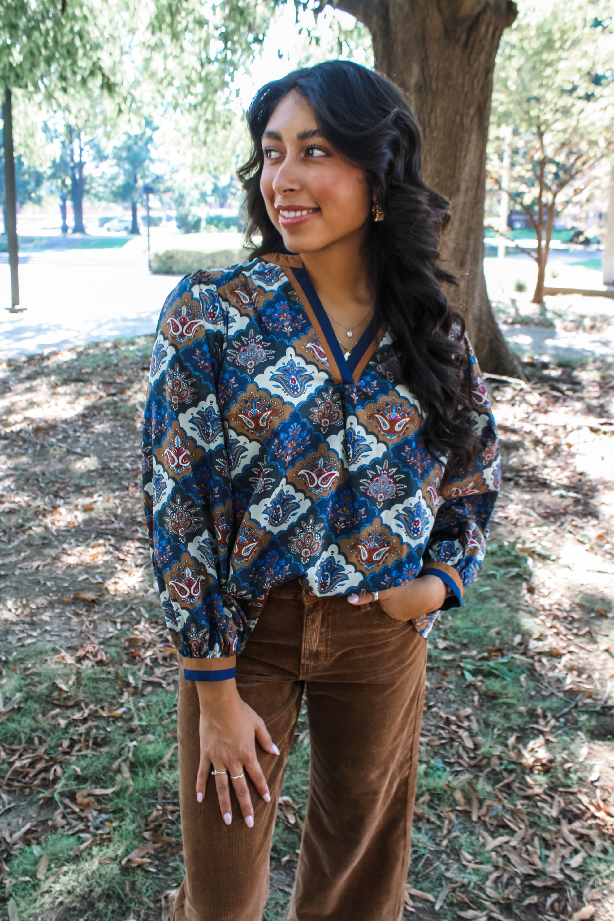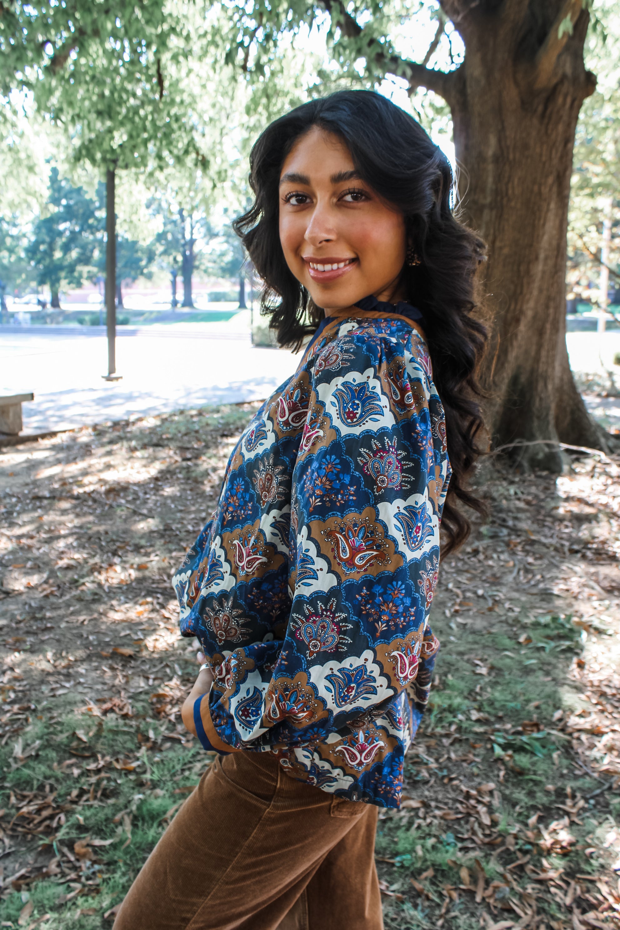 Elegant prints and sophisticated colorways for a stylish wardrobe. This woven blouse is an eye-catching look with its floral paisley print and striped contrast trim detailing. Featured in a flowy silhouette with a ruffle trim v-neckline and puff sleeves, it’s a chic and versatile look you can easily dress up or down.