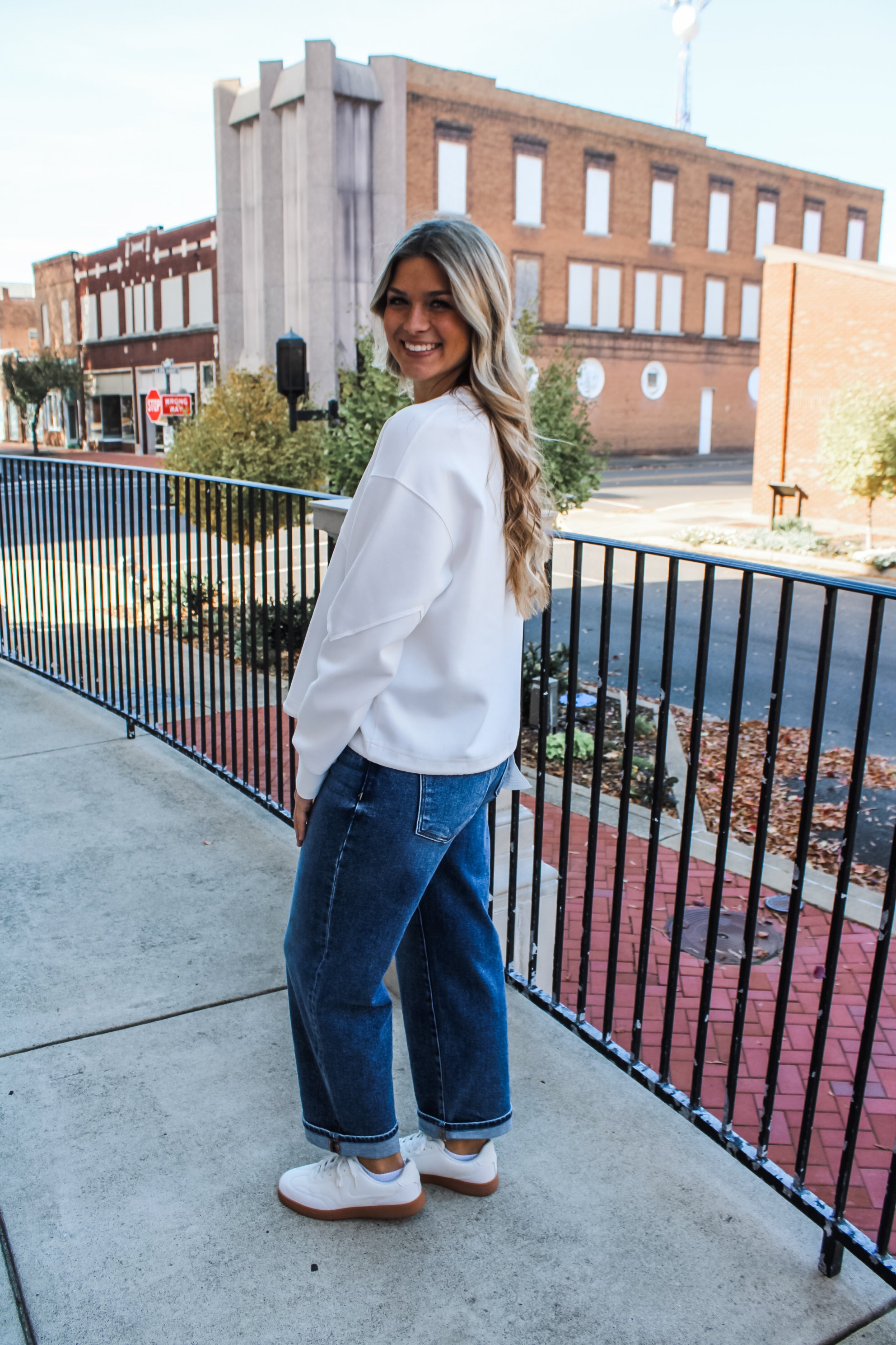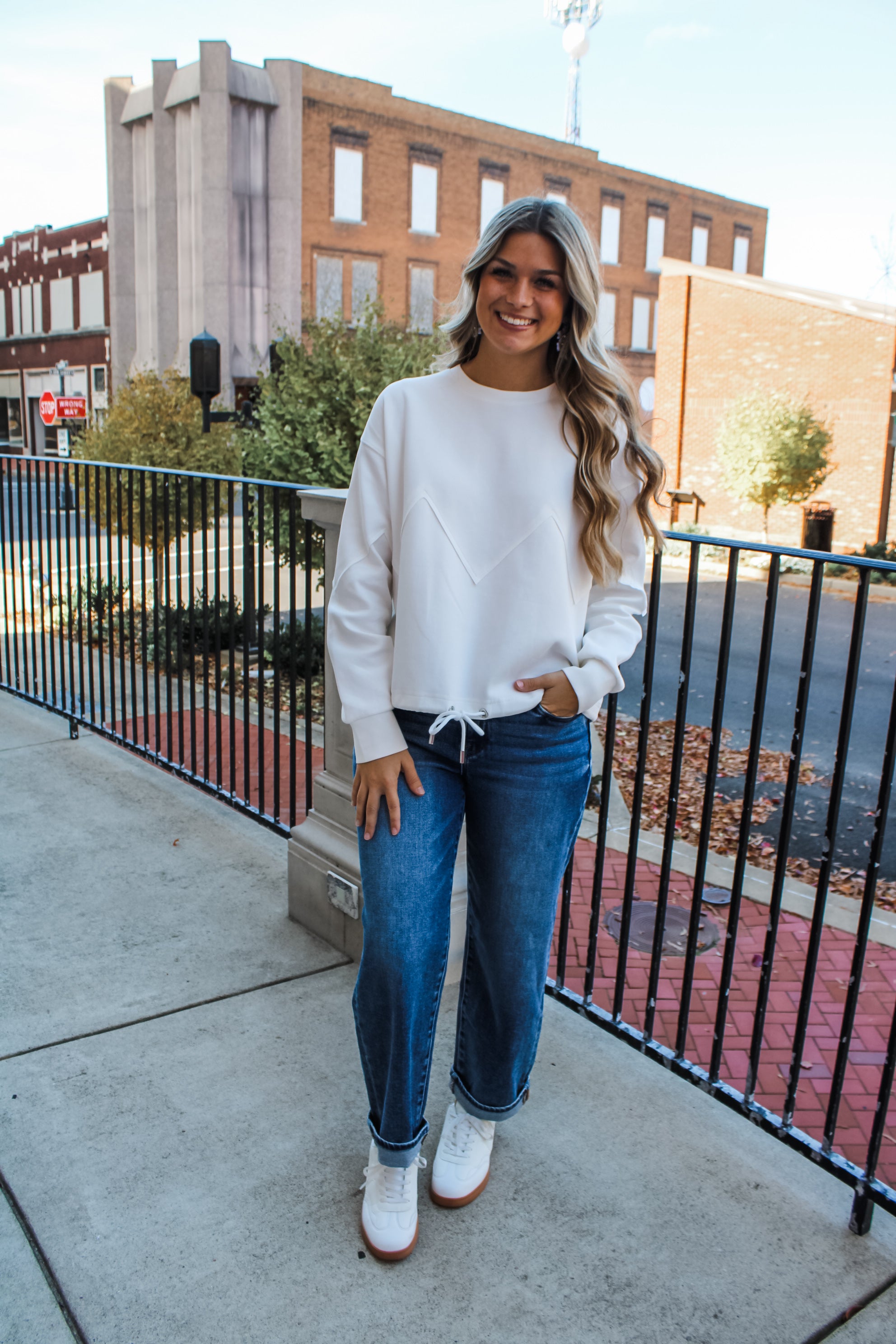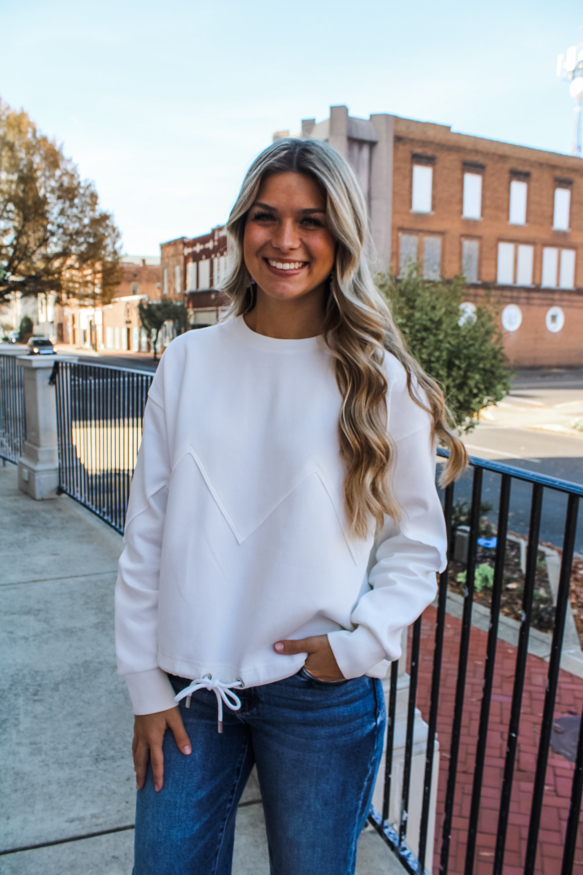 Elevated essentials to step up your holiday style! Featured in a modern loose silhouette for the comfiest fit and a cutout design for detail and dimension, this pullover is a simple look with a touch of flair. Crafted from a smooth scuba knit fabrication, this top can be dressy or casual depending on how you style it. With a crewneck, drop shoulder sleeves and a drawstring hem for styling options.