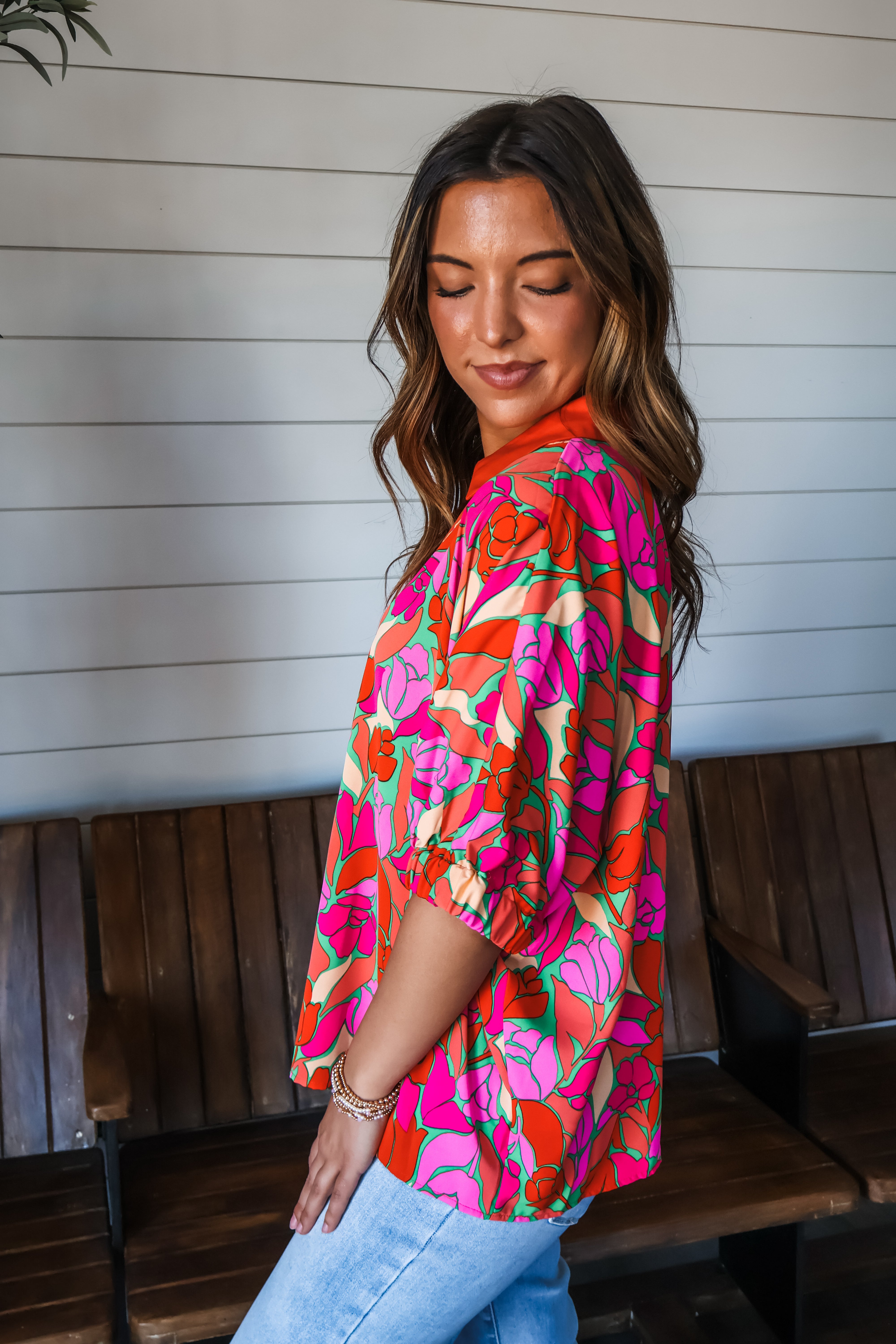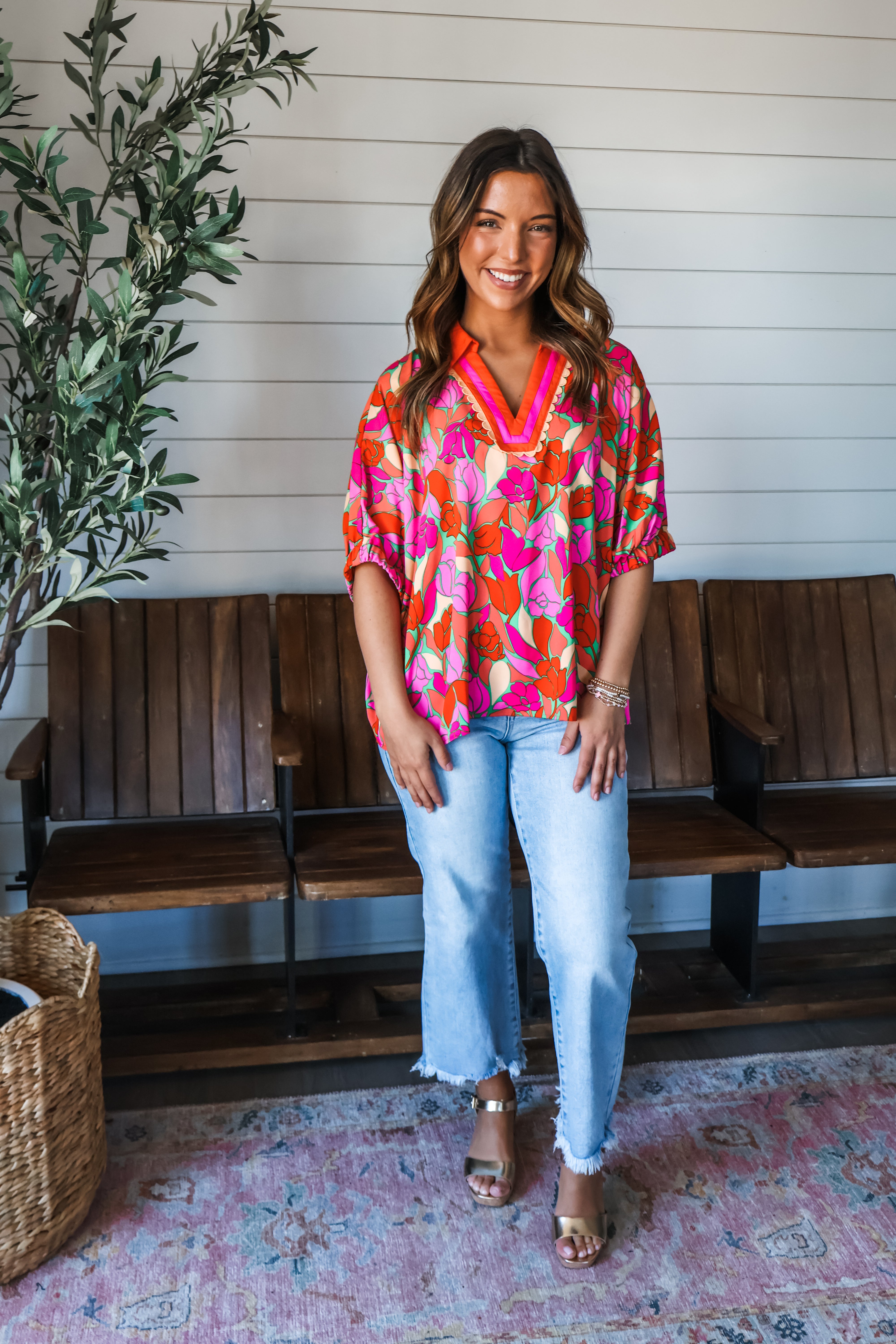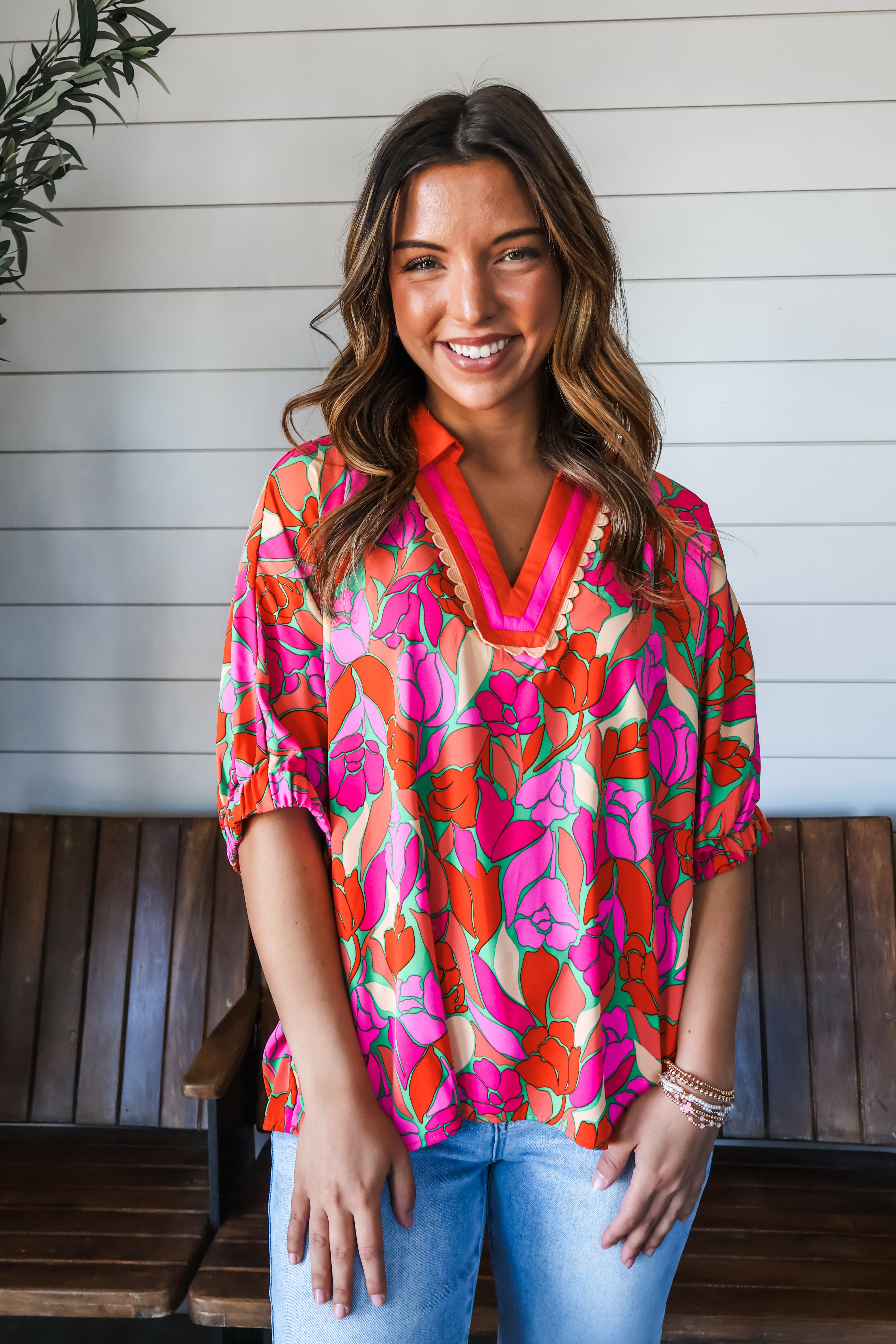 So striking in a bold floral print, this top is a standout look for work or play! The striped contrast trim and scallop lace detail give it an eye-catching flair, while flowy silhouette provides an easy flattering fit. Crafted from a smooth woven with a collared neckline and dolman sleeves.