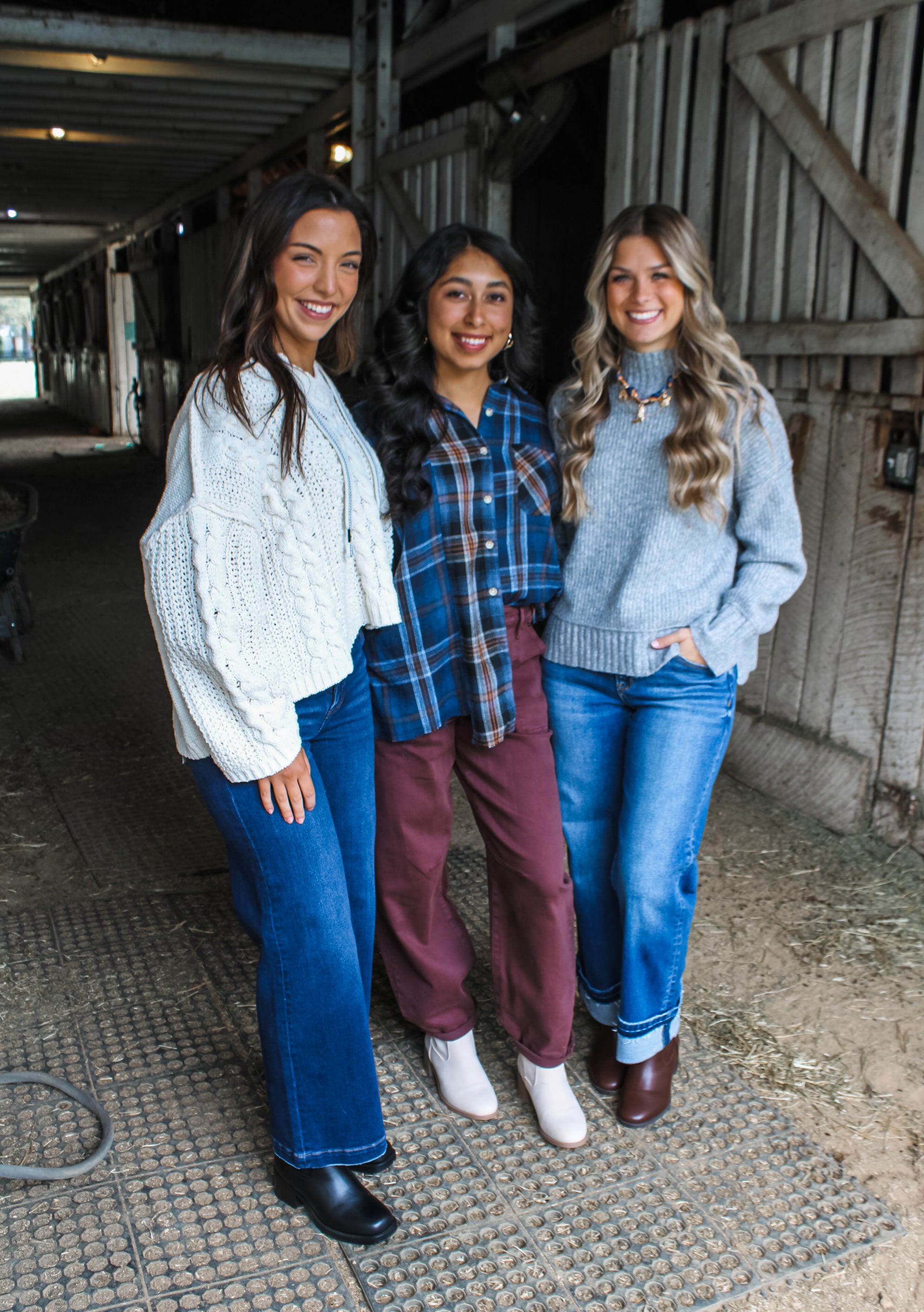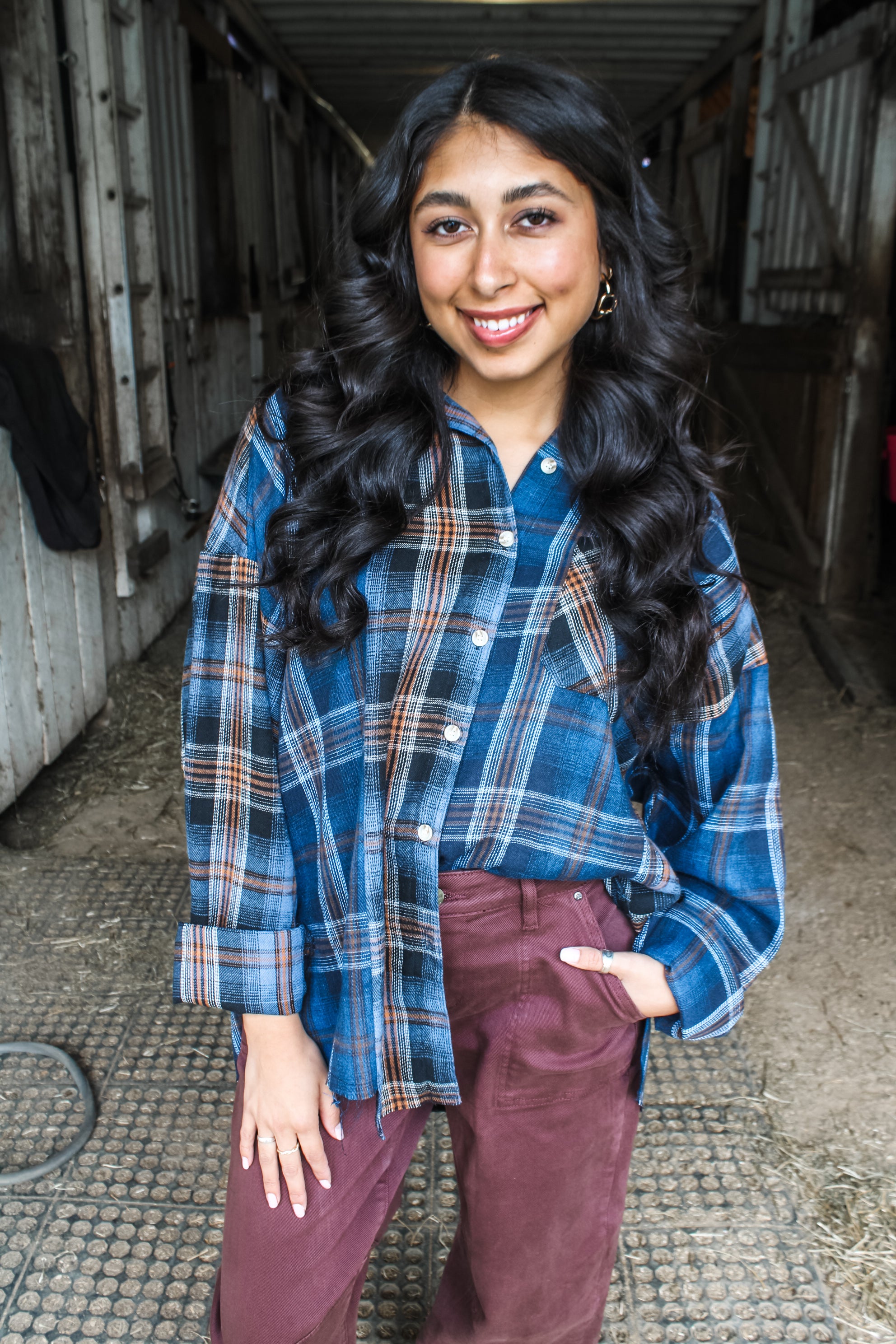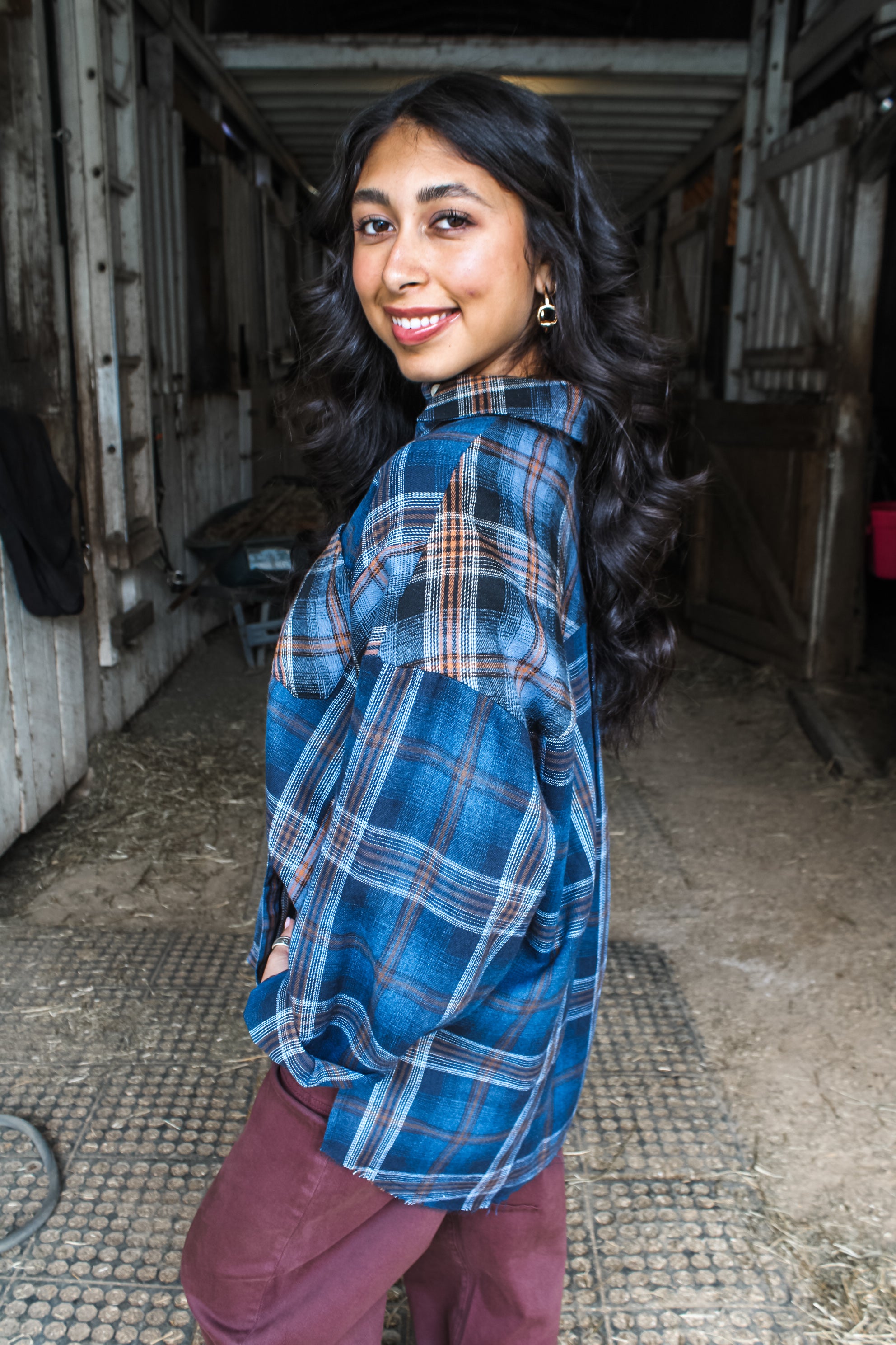 Classic plaid reimagined. This flannel shirt is such a sophisticated refresh on the quintessential style with its contrast print design and oversized silhouette. Fabricated in a soft brushed woven, it features a collared neckline, chest pocket detail, billowy sleeves and a stepped high low hem. The trendy fit gives off that cool relaxed feel and makes layering so easy. Wear on its own, or toss over basic knits, chunky sweaters and graphic tees.