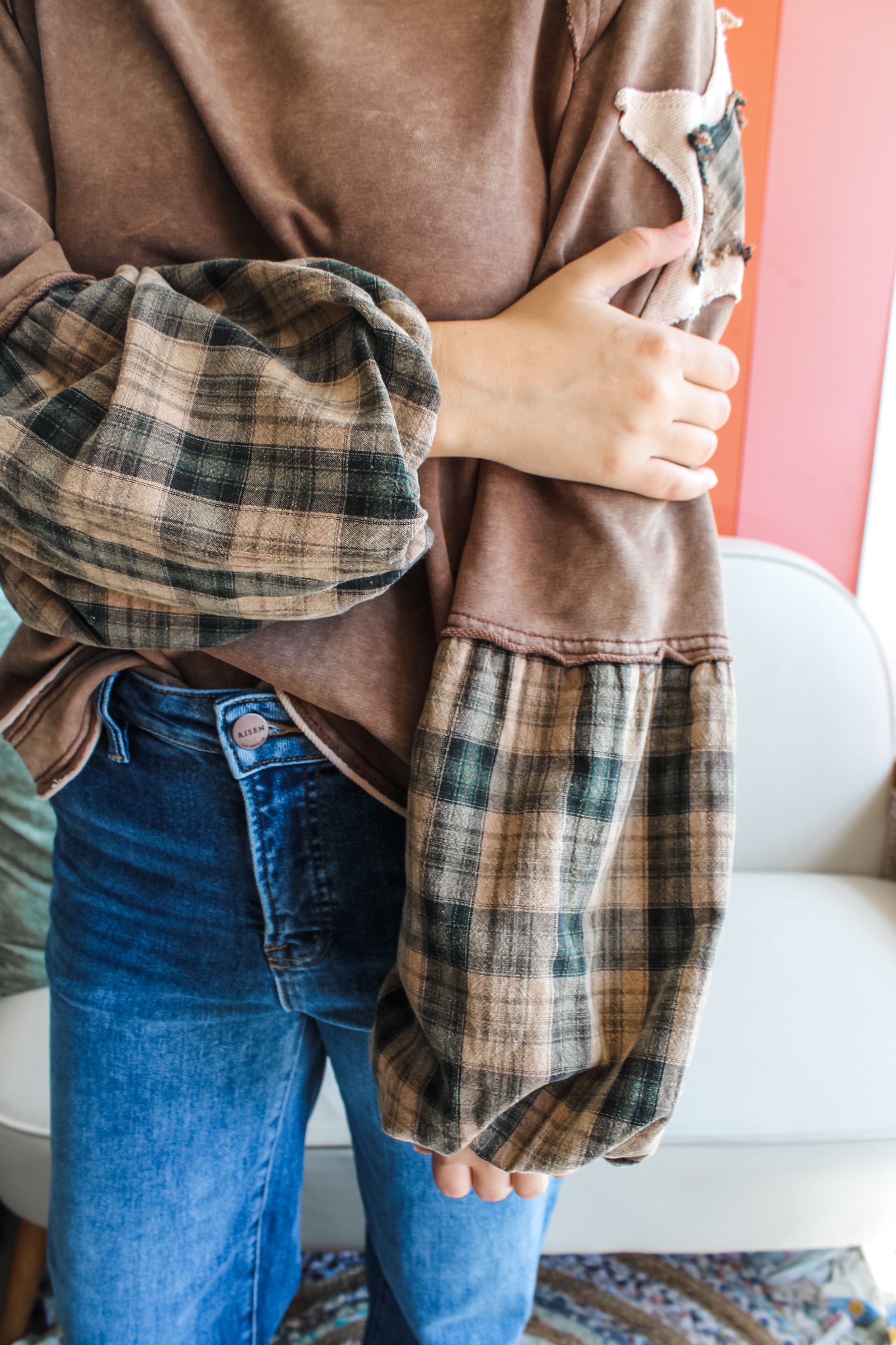 It’s plaid season and this patchwork top is a playful look for fall outings and weekend adventures! The layered stars design and printed contrast bubble sleeves are such eye-catching details, while the mineral washed knit gives it comfortable lived-in feel. With a crewneck, raw edge seaming,  contrast trim and a breezy silhouette.