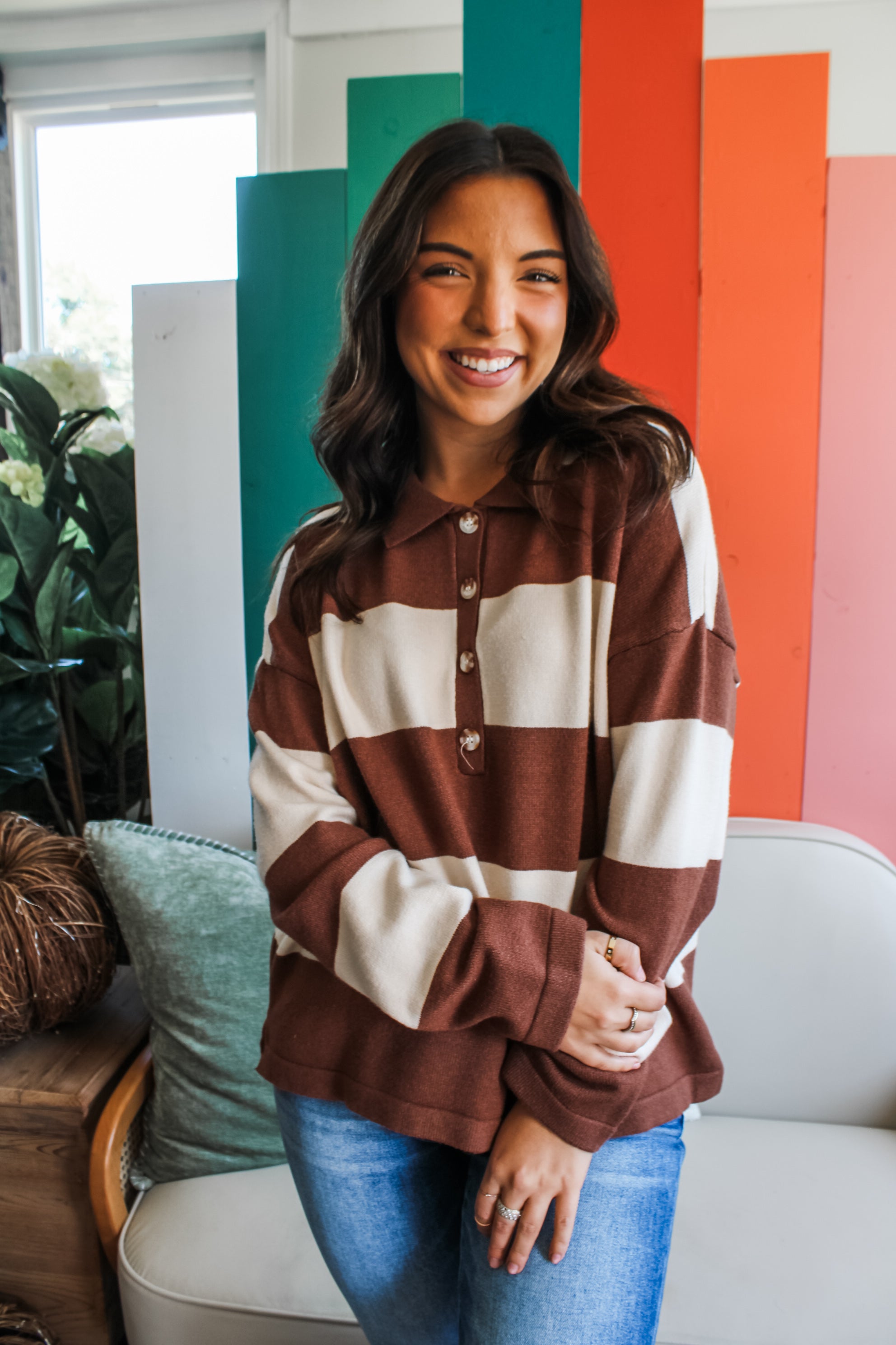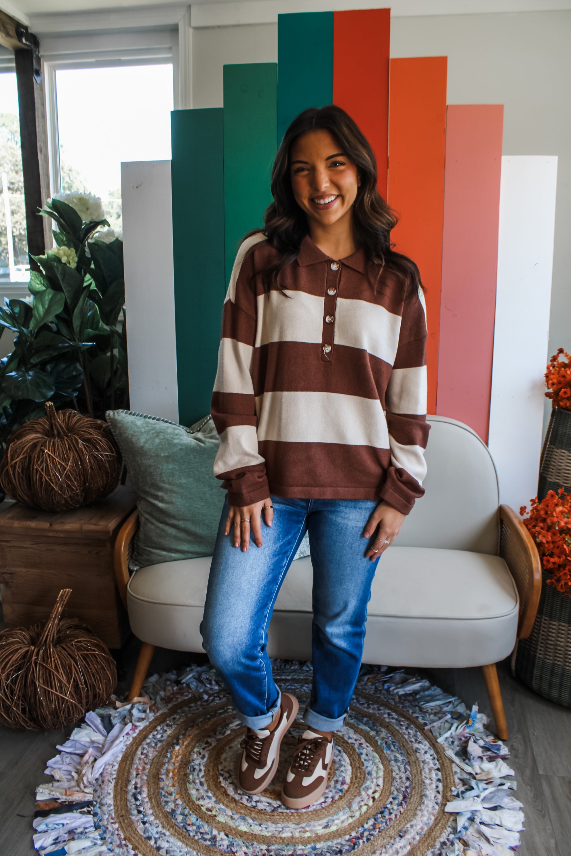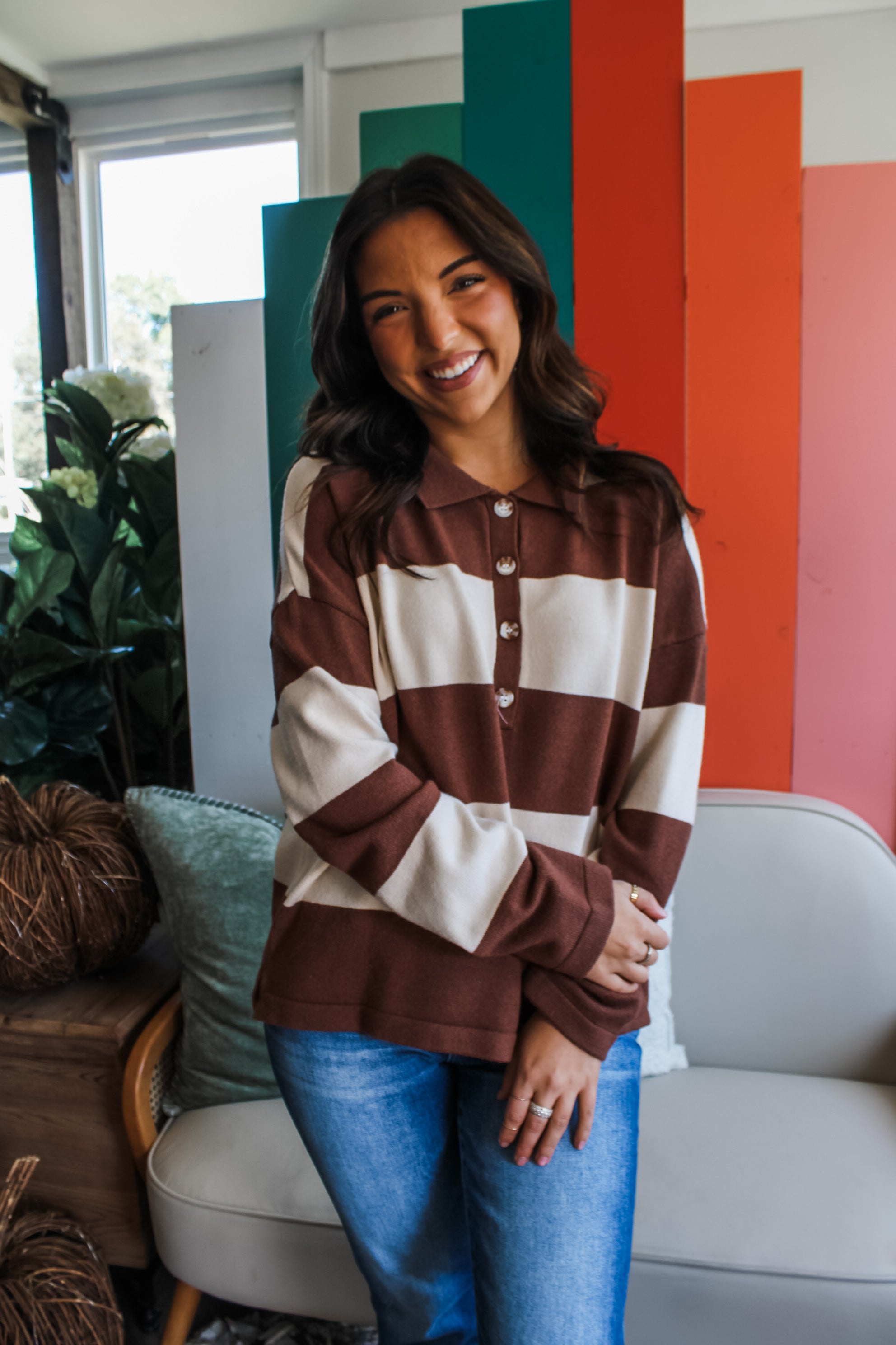 Striped essentials that never go out of style! This polo sweater is a preppy classic you’ll keep wearing over and over. Crafted from a soft knit that drapes over the body, with a modern loose silhouette. The sophisticated colorway adds it to its timeless appeal, making it a stylish staple for every wardrobe.