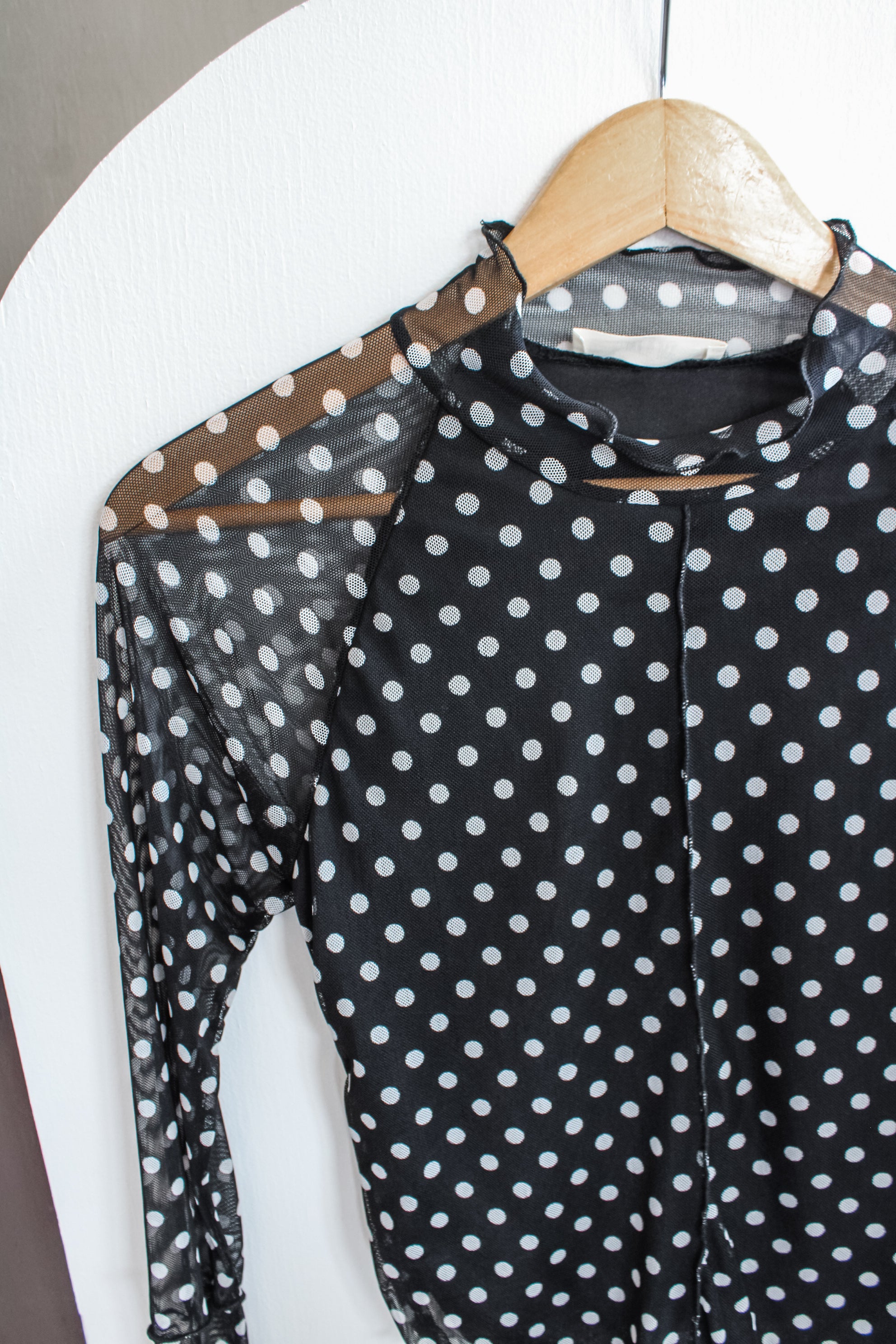 Worn on its own or stylishly layered, this polka dot top will add a fun pop of print to any look! Fabricated in a stretch mesh knit with a lettuce hem finishing and lined body.