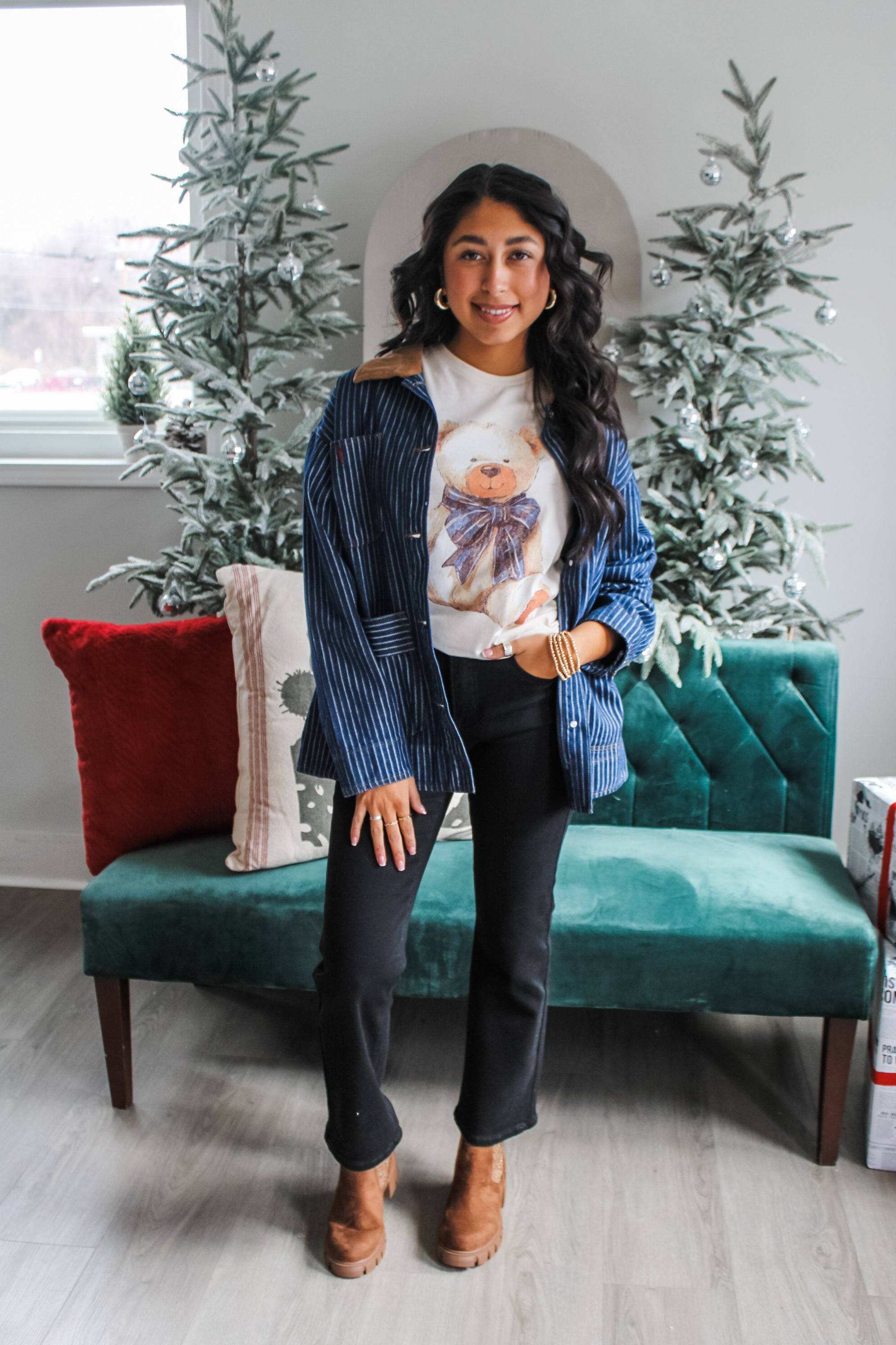 Styling tips: Toss over chunky knits, woven shirts, dresses, graphic tees… this look has endless styling possibilities for dressing up or down for the holidays and beyond.