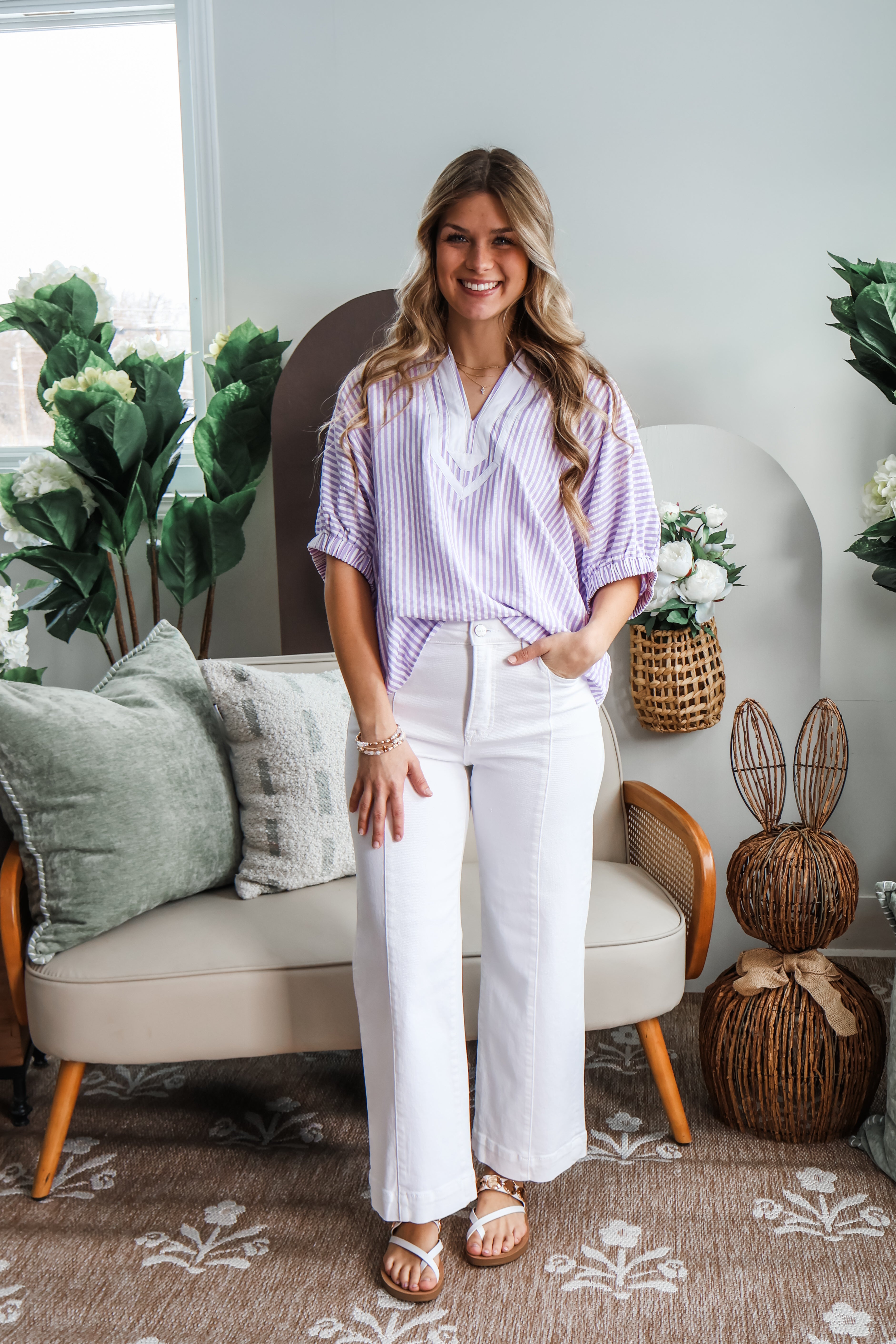 So lovely in lavender, this striped top is a standout look for work or play! The woven contrast design and dolmn sleeves give it a sophisticated flair, while flowy silhouette provides an easy flattering fit. Crafted from a smooth textured woven with a caftan-inspired neckline and a subtle high low hem.