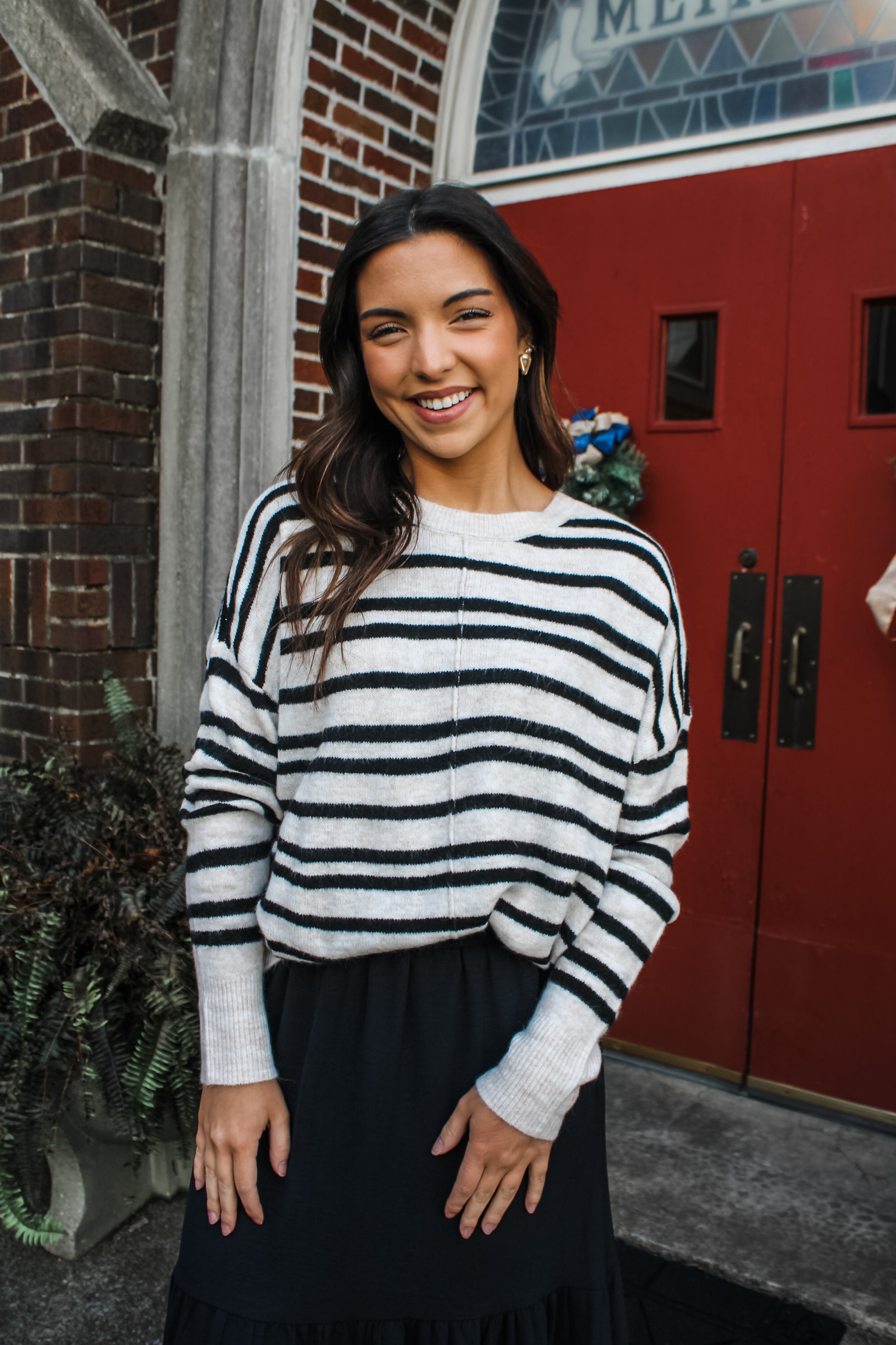 Refined essentials for a chic and cozy wardrobe. This striped sweater is fabricated in a soft brushed knit with a front seam detail, relaxed dolman silhouette and contrast finishing.