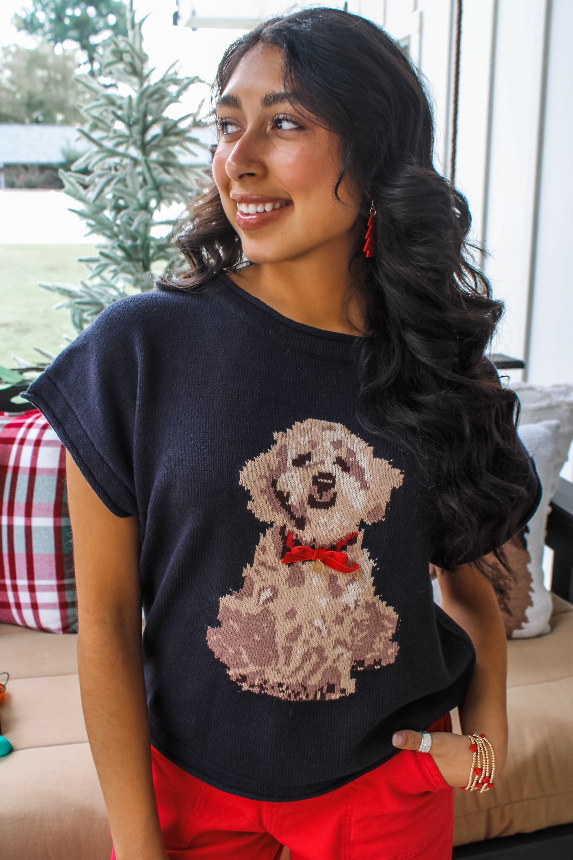 Put a playful twist on your holiday looks! So charming and classic, this puppy sweater evokes classic nostalgia in style! Crafted from a braided knit with a relaxed crewneck silhouette and rolled edge finishing. With a cute red bow for the perfect finishing touch.