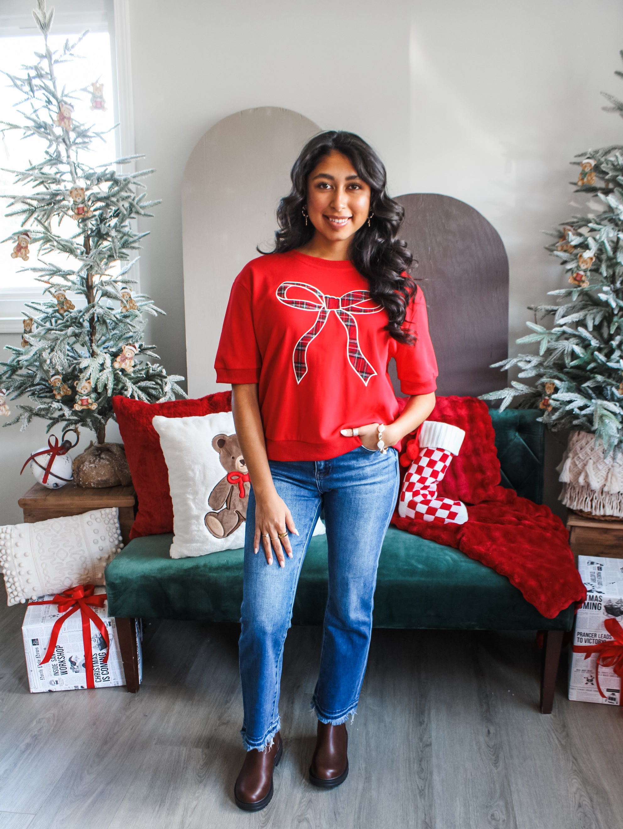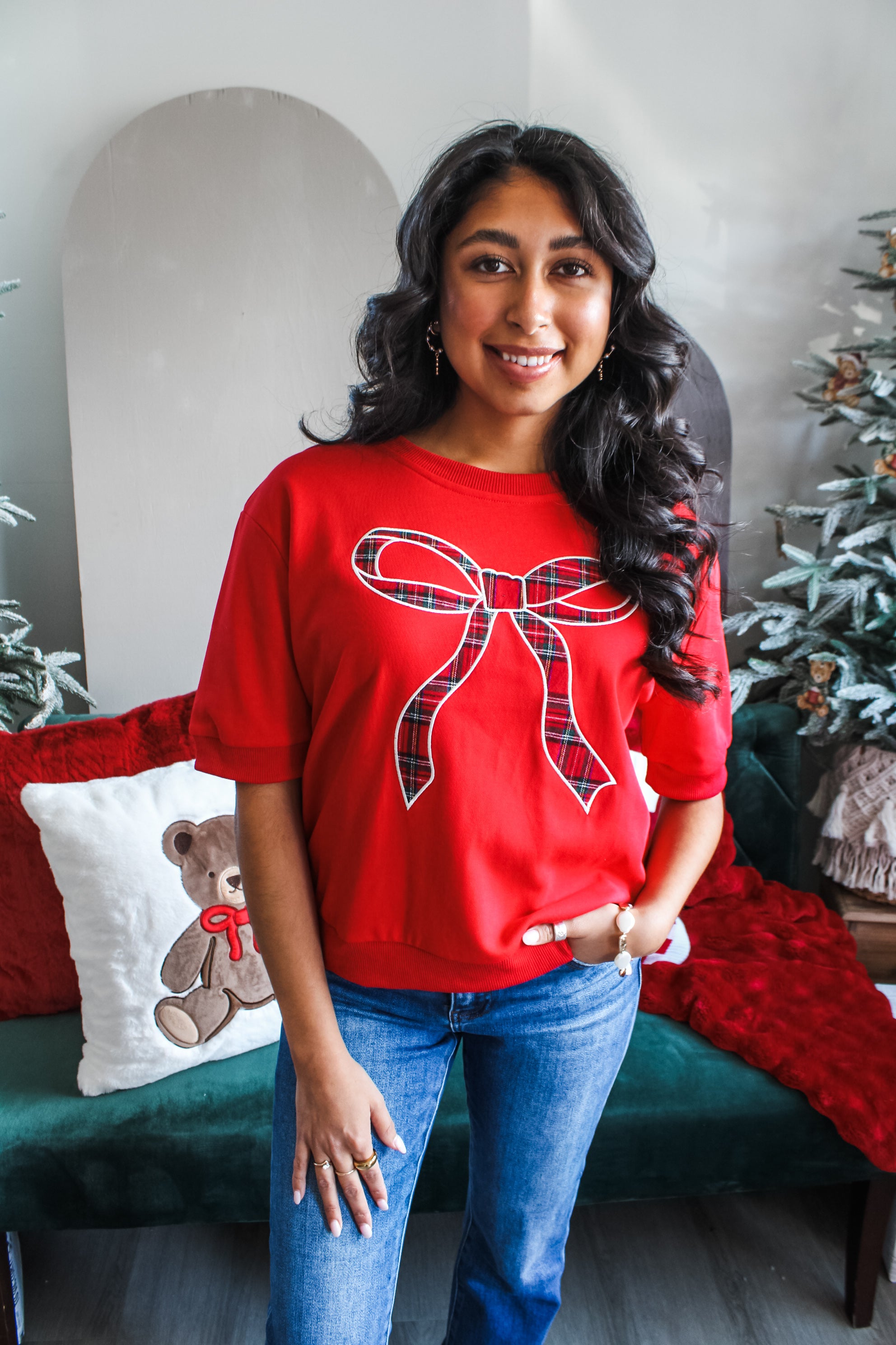 Polished and playful, this red top will re-inspire your holiday style! A chic take on Christmas classics, it features an embroidered plaid bow design for a trendy twist! Fabricated in a soft cotton terry knit with a crew neckline, drop shoulder sleeves and contrast rib finishing.