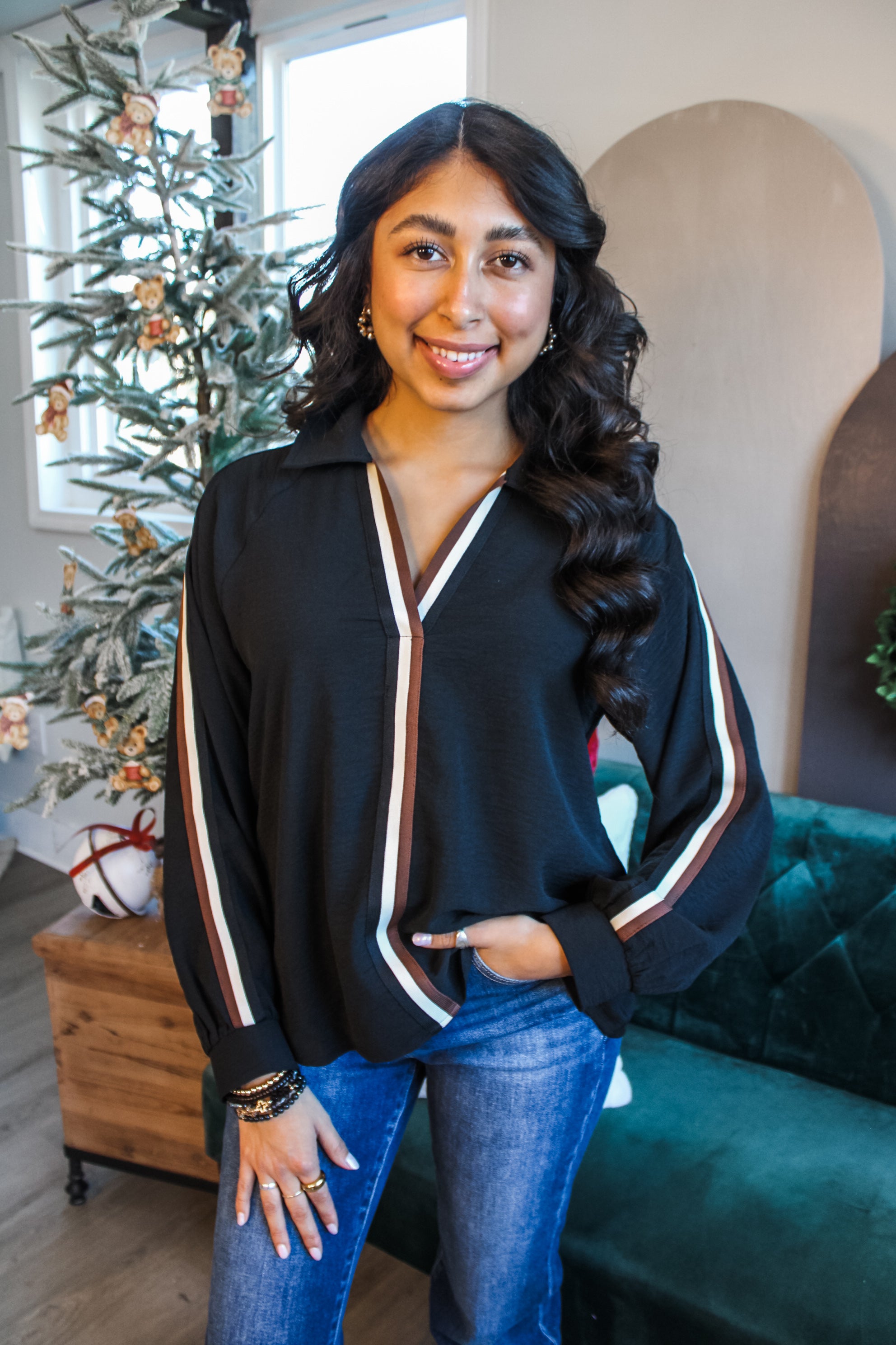 Effortlessly sophisticated styles that make you stand out. Fabricated in a textured crepe knit, this easy yet elegant blouse features striped contrast detailing, a collared v neckline and cuffed raglan sleeves. With a flowy silhouette that flatters all, this chic top can be dressed up or down for the holidays and beyond.