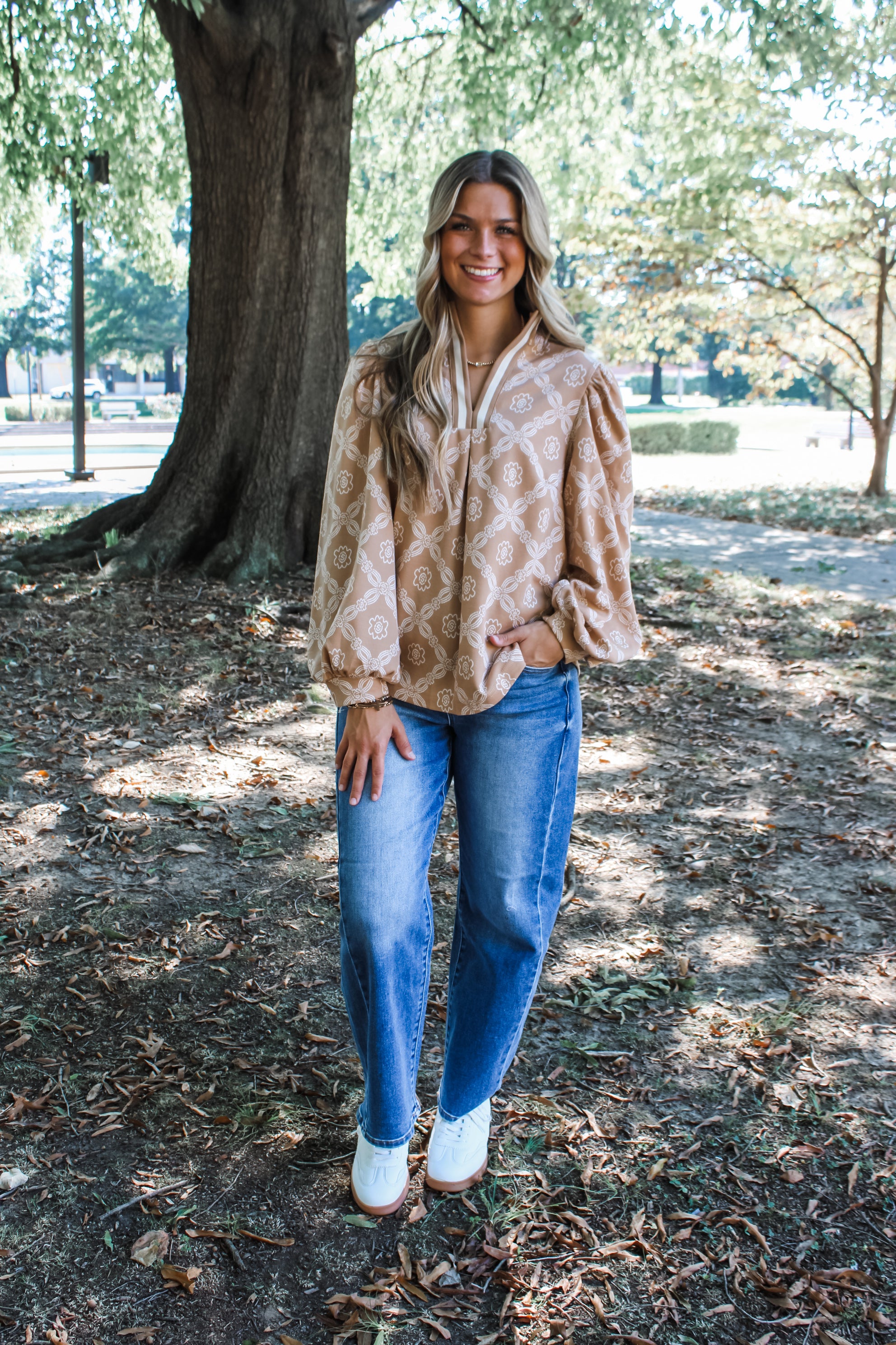 Trending details and sophisticated prints to elevate your style. This knit top is an eye-catching look with its striped contrast neckline and charming floral motif. Featuring a standing collar you can wear popped up or laid down, a front pleat detail creating a flowy fit and billowy puff sleeves.