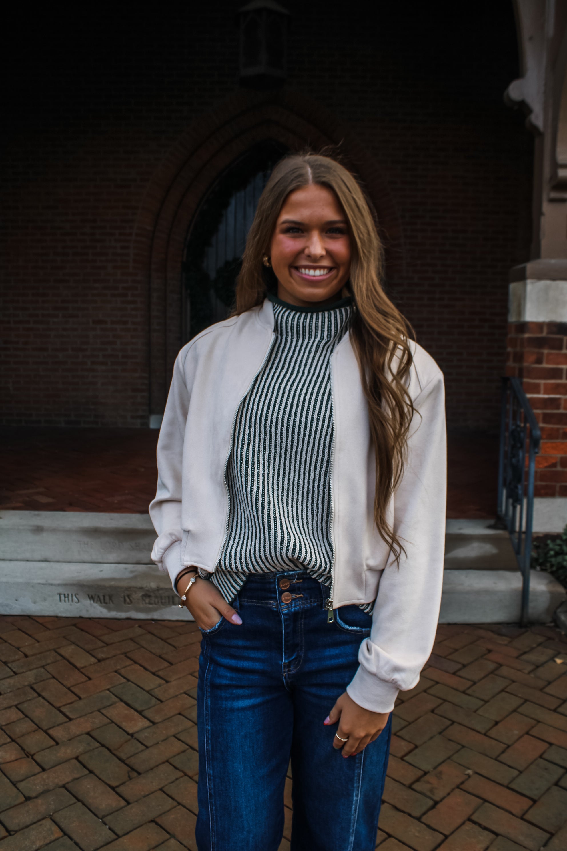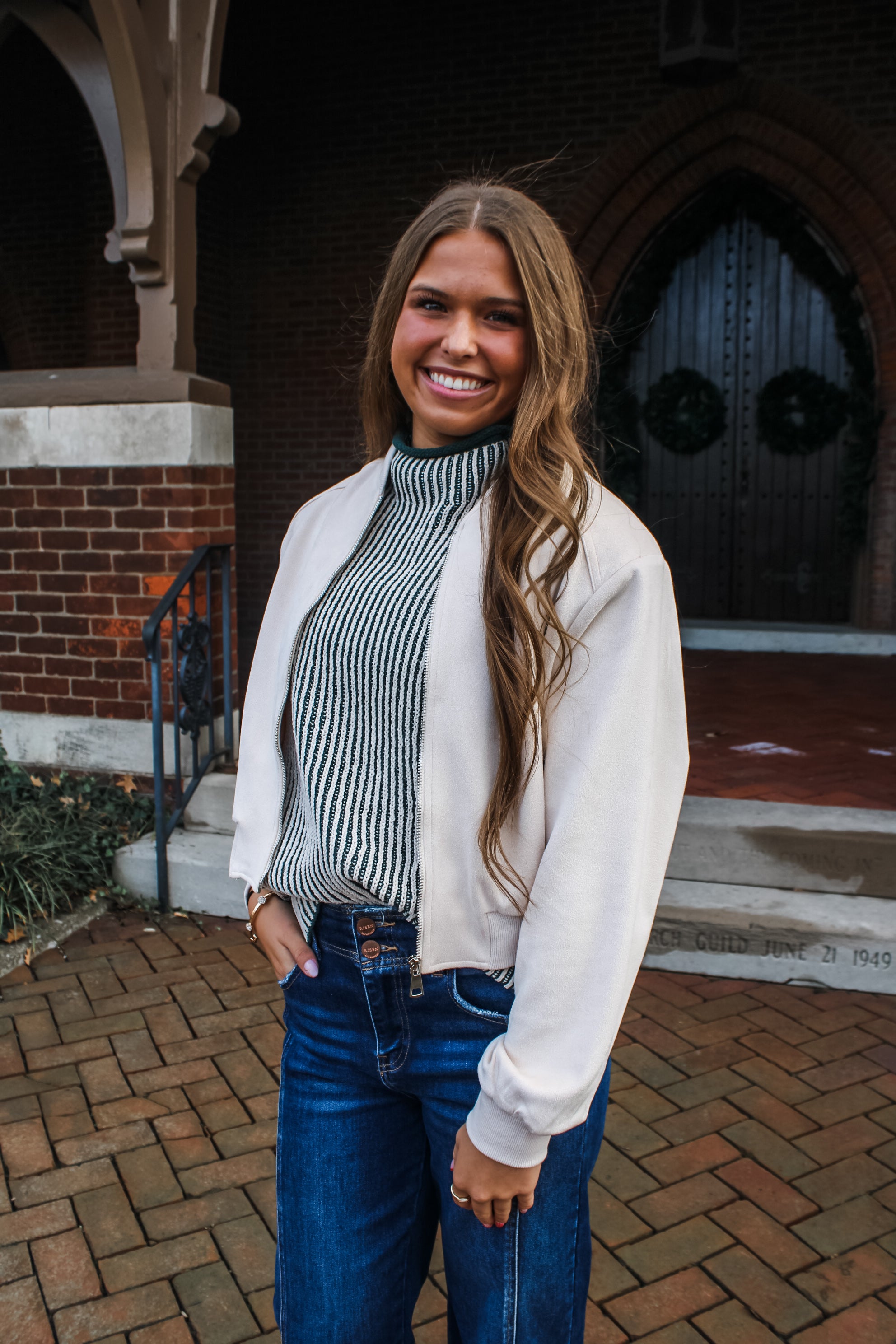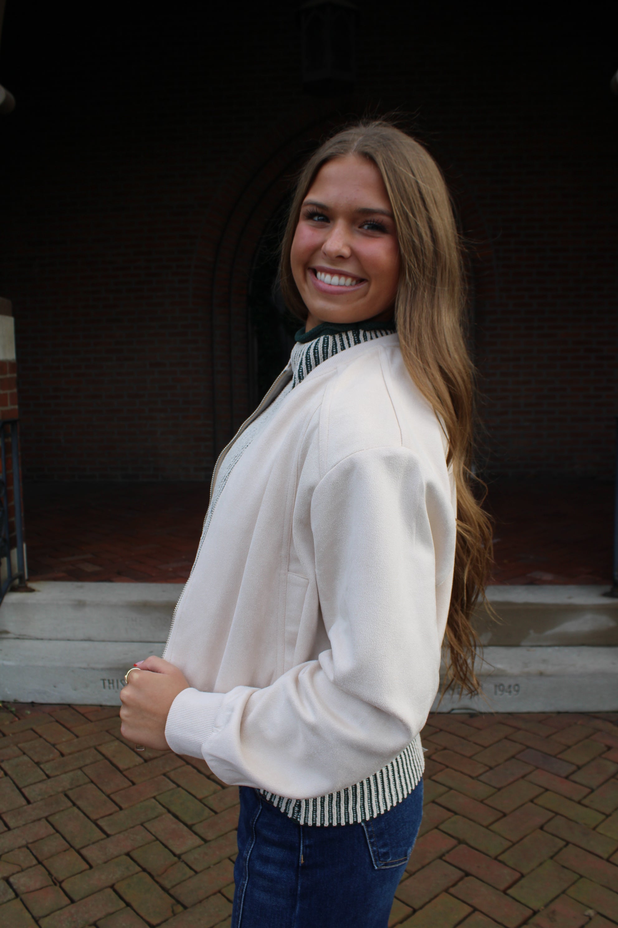 Layering pieces that make a statement. This so-cool jacket perfectly combines the timeless bomber silhouette with the luxe feel and texture of suede. In a sophisticated neutral with a collarless neckline, zip front closure, front pockets, rib contrast finishing and a relaxed fit.