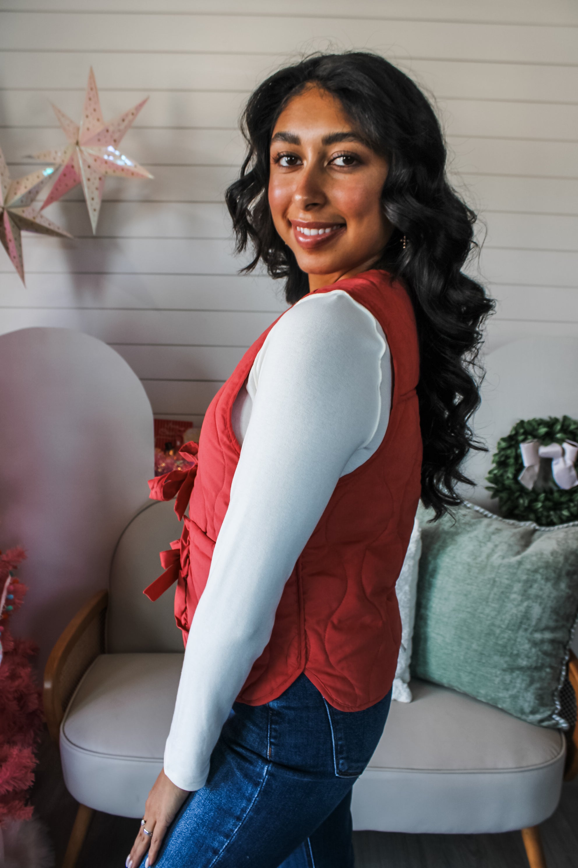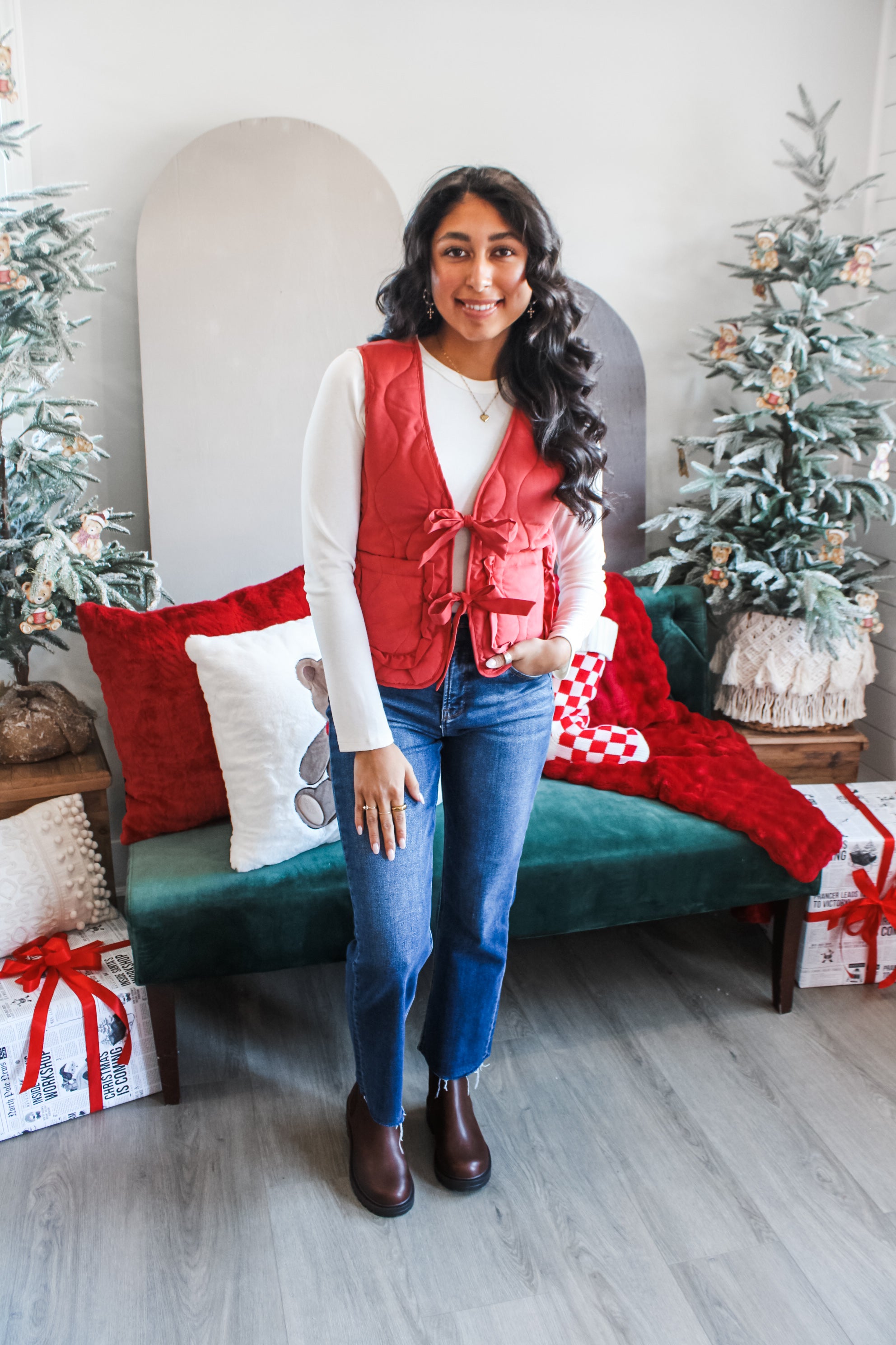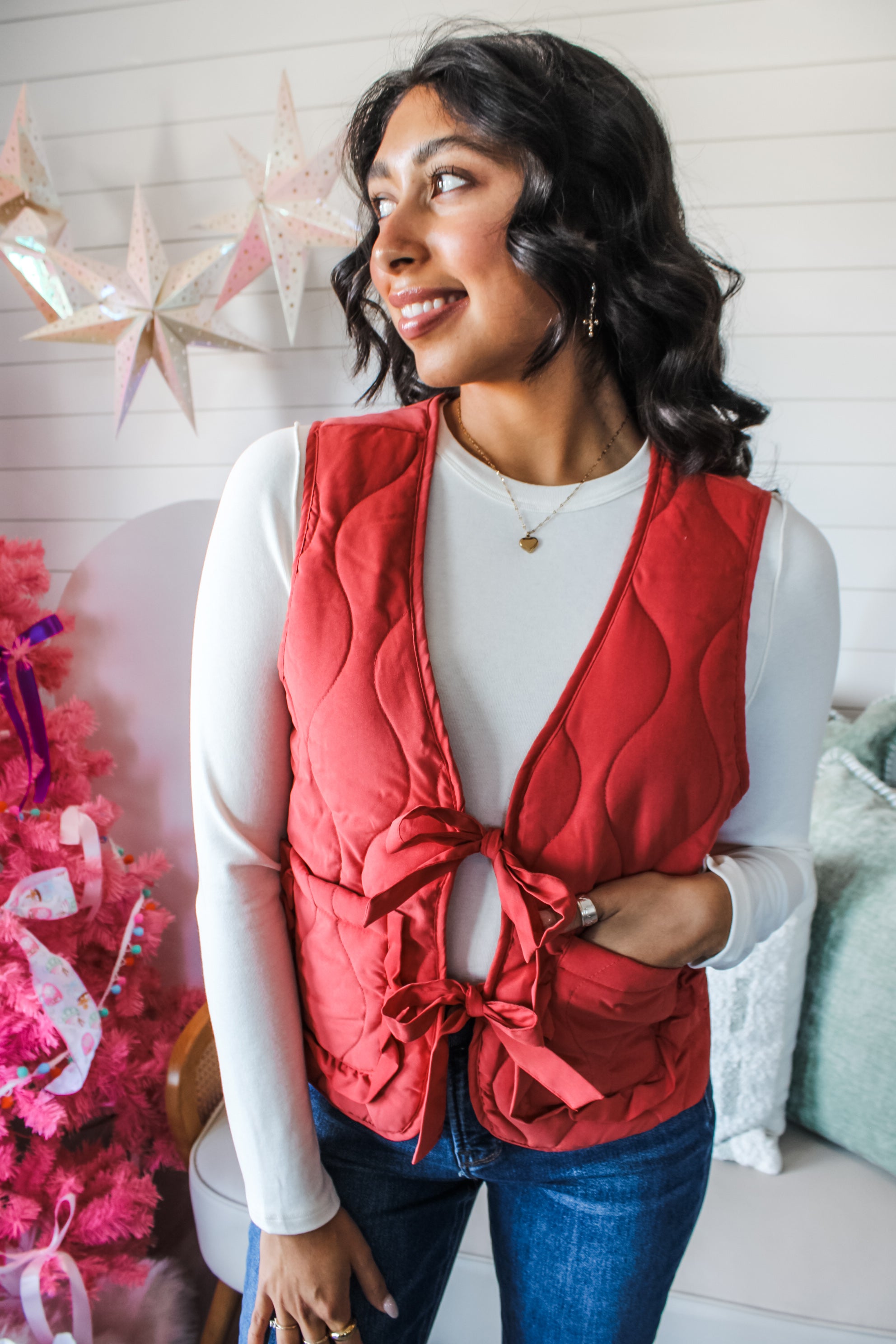 Elevate your holiday wardrobe with effortless layers and cozy charm. Crafted from a quilted fabrication, this sweet vest is a versatile look with many styling possibilities. Featuring an open front with a bow tie closure, double pockets with ruffle trim detailing, and an easy fit for style and layering.