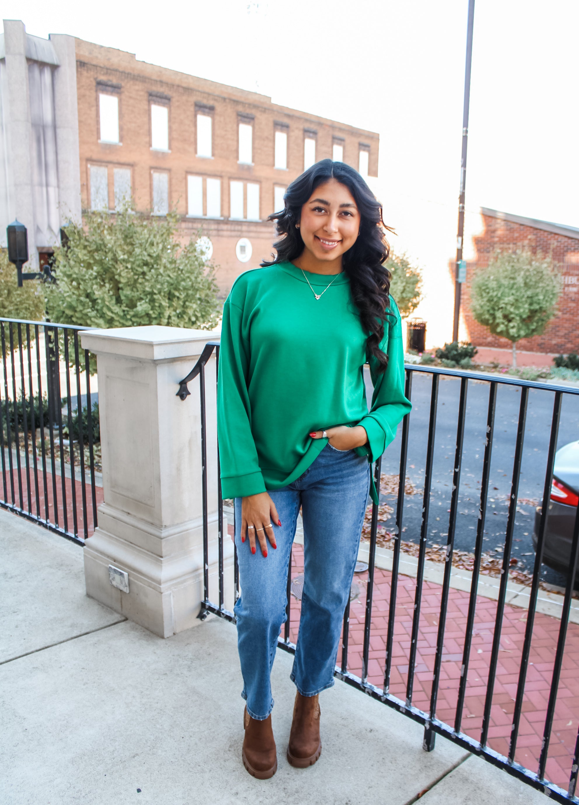 So easy and essential, this top is a versatile look for the holidays and beyond. Featured in a modern loose silhouette for the comfiest fit, while the scuba knit fabrication provides a soft and smooth feel. With a classic crewneck, side slit hem and a back button closure for easy on/off.