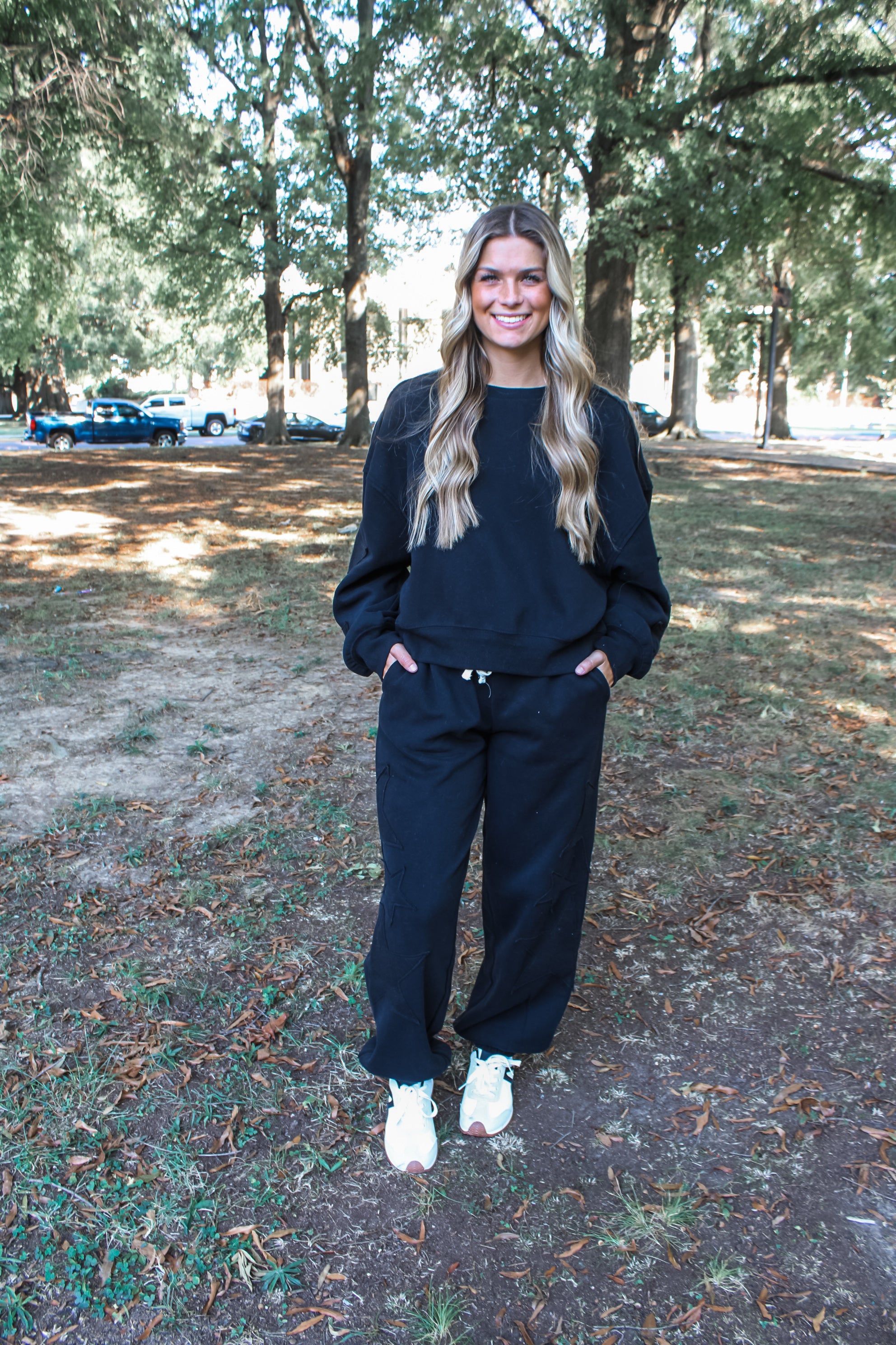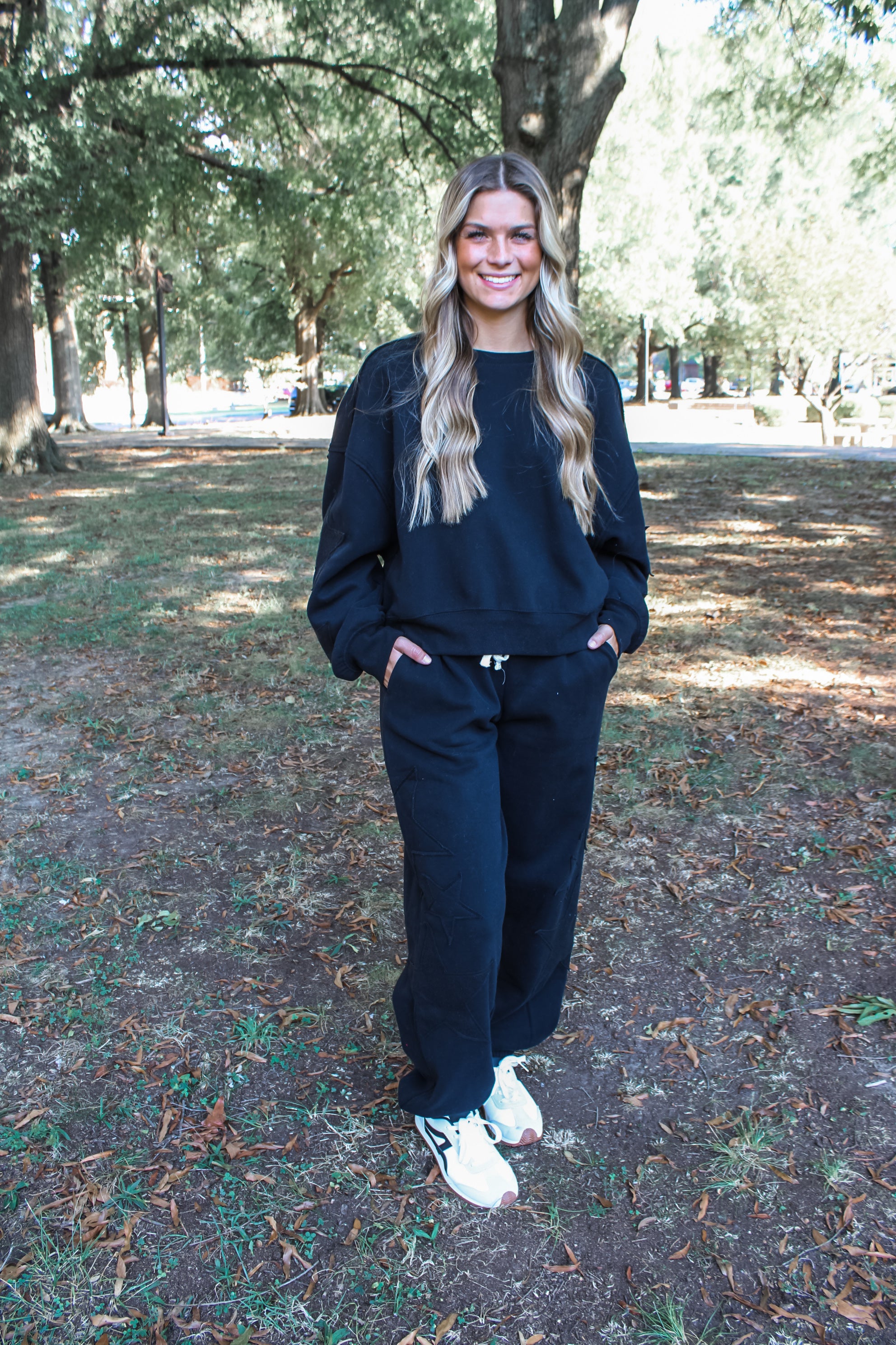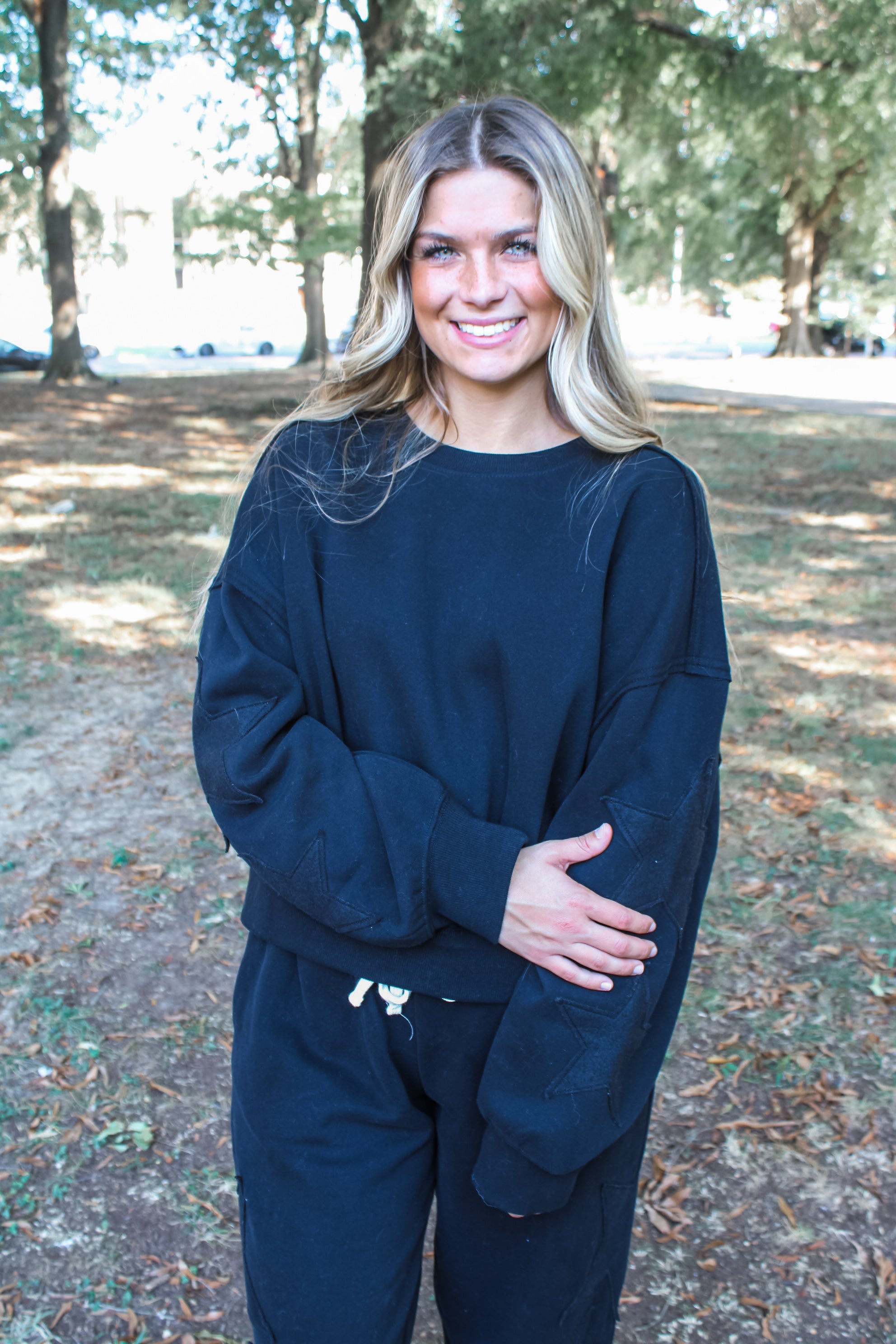 A cool take on the crewneck essential, this pullover features a star patch design for a playful twist. The soft fleece knit fabrication provides a layer of warmth for the coziest feel, and the dolman silhouette gives it an easy fit that’s so cute and comfy. With exposed seaming, drop shoulder sleeves and rib contrast finishing for stretch and recovery.
