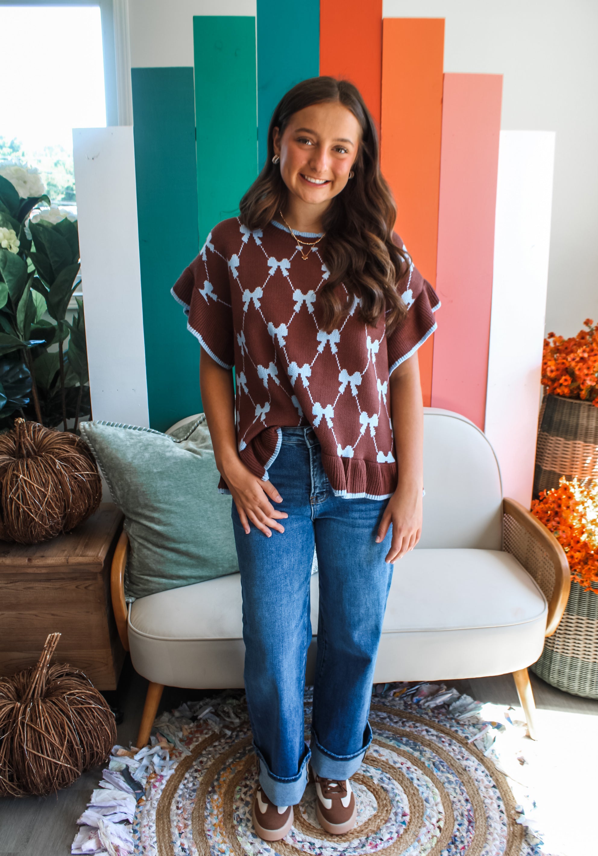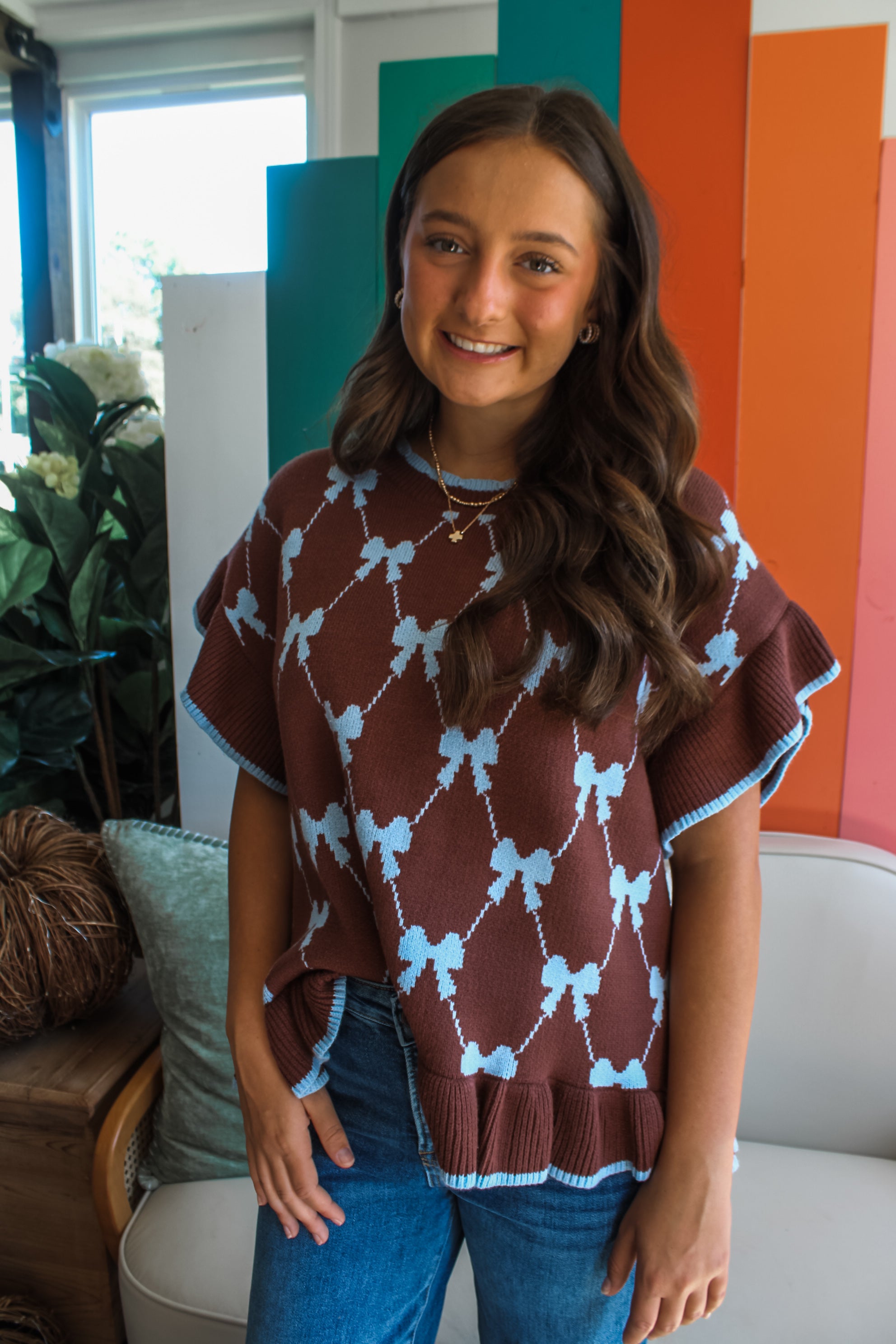 So sweet and on-trend, this sweater is a pretty look for work or playThe soft knit lays comfortably over the body and the relaxed silhouette gives it a comfy modern fit. Featuring a scalloped crew neckline and a trellis bow design, with ruffle trim sleeves and hem.