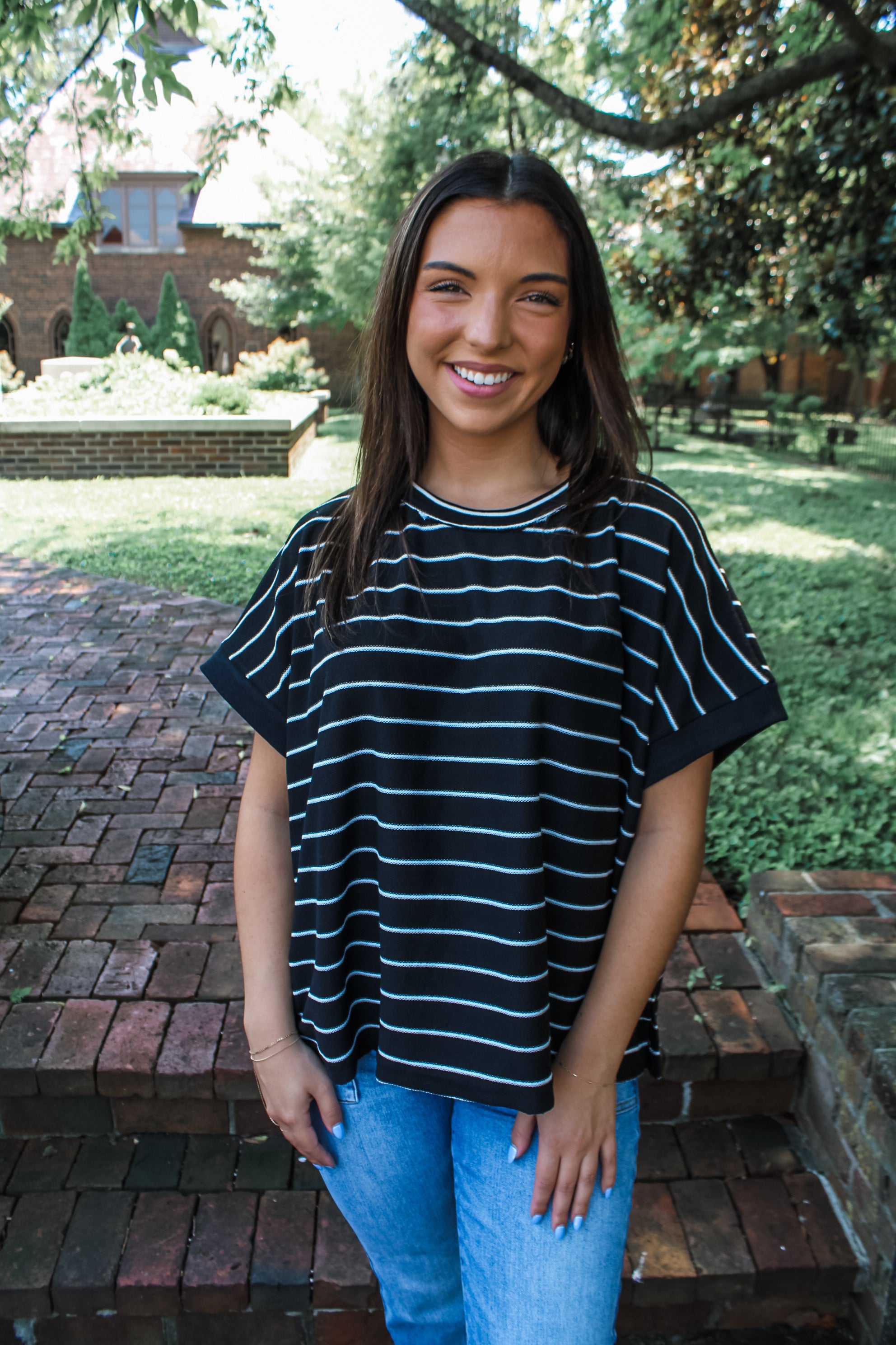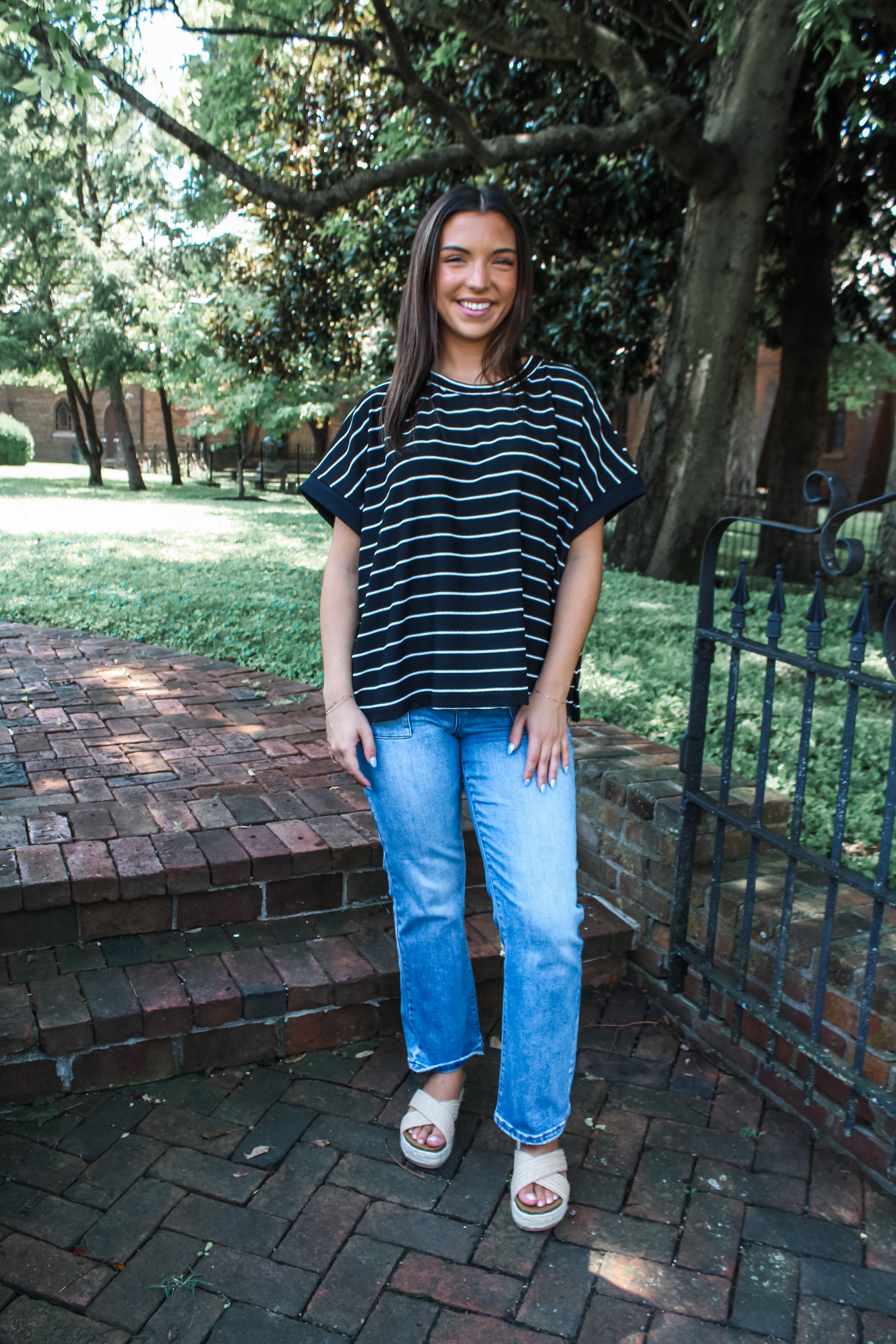 We love an everyday top! One to pair with our favorite jeans and feel put together and comfortable. Umgee does it again with this terry striped top. Runs loose throughout. Raw hem details around the neck, hemline and arm. Vented bottom. Small 0-6 medium 6-10 large 10-14. Model is wearing the small and is 5”5. 60 cotton 40 polyester