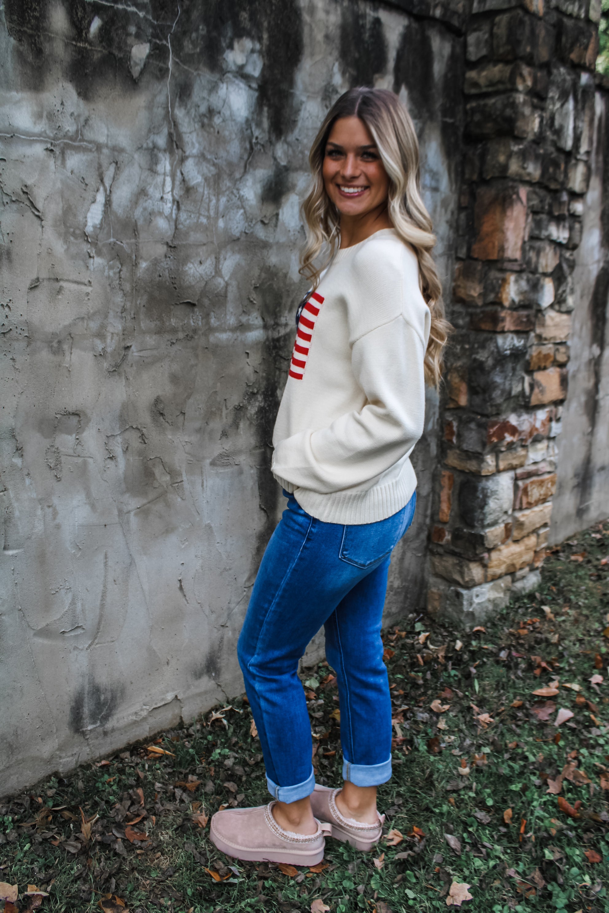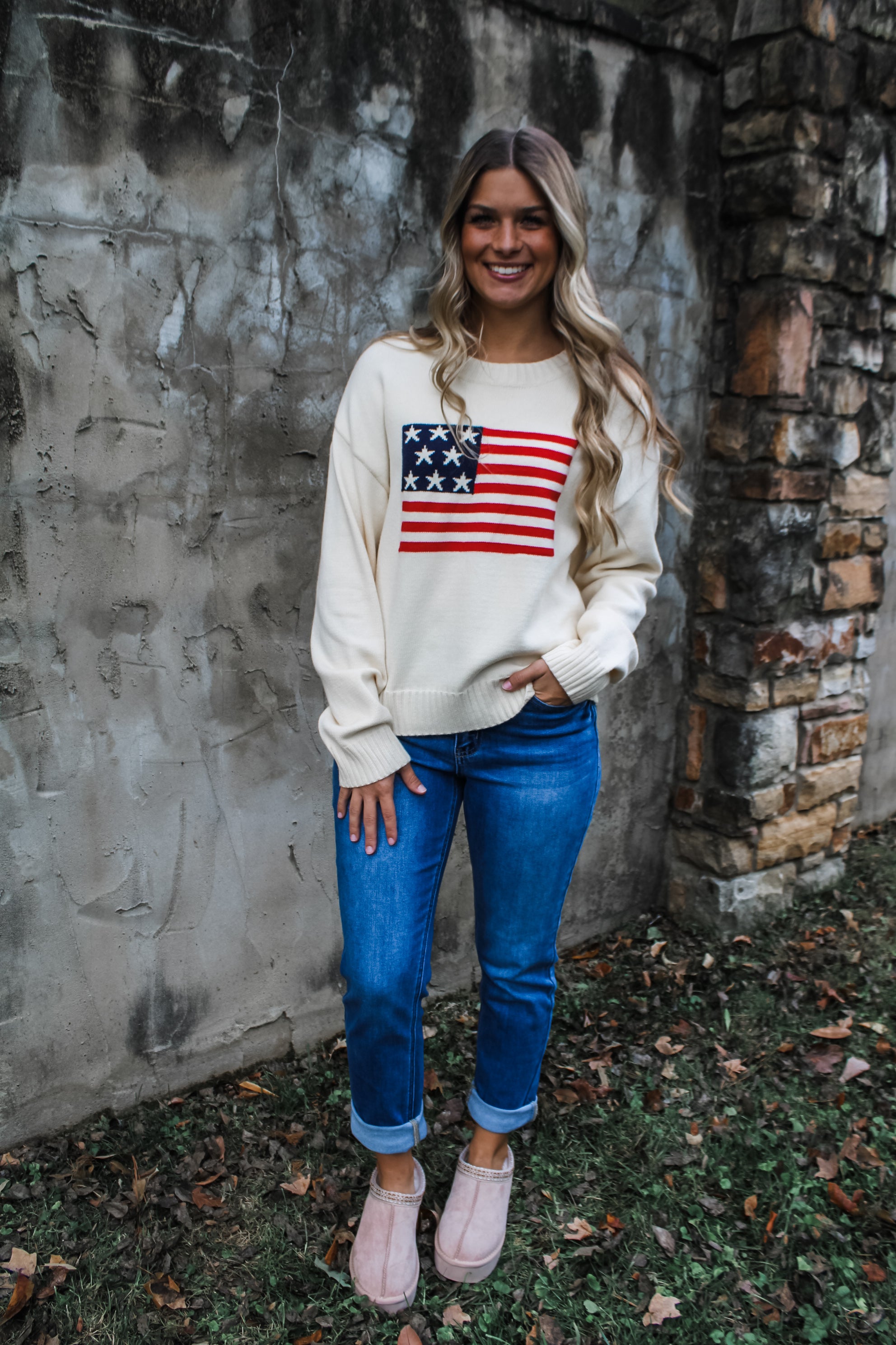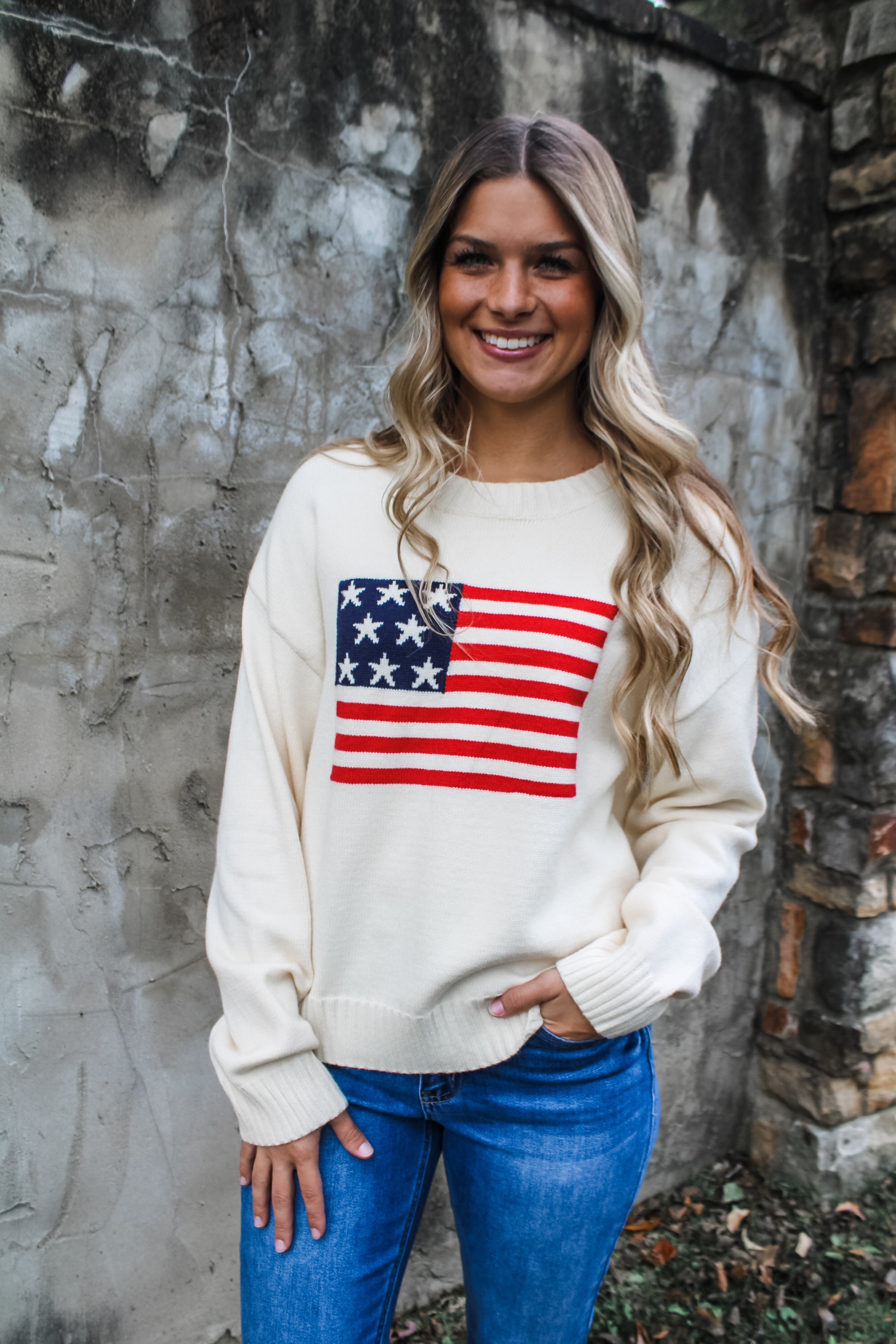 Have an Americana Christmas! Crafted from a soft braided knit, this sweater is a classic look for any season. Featured in a relaxed silhouette with a crew neckline, drop shoulder sleeves and contrast rib finishing.