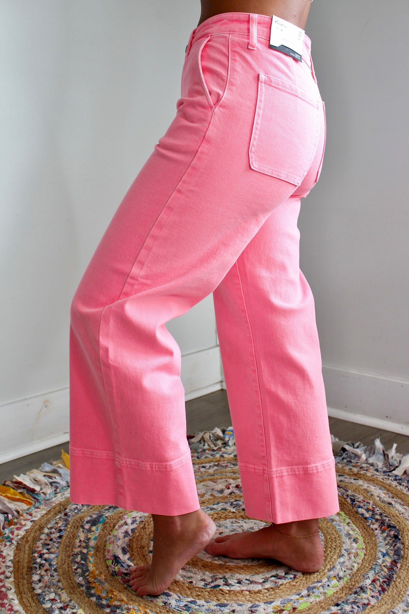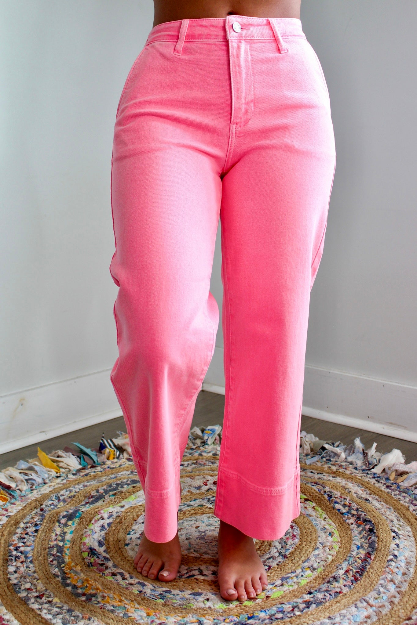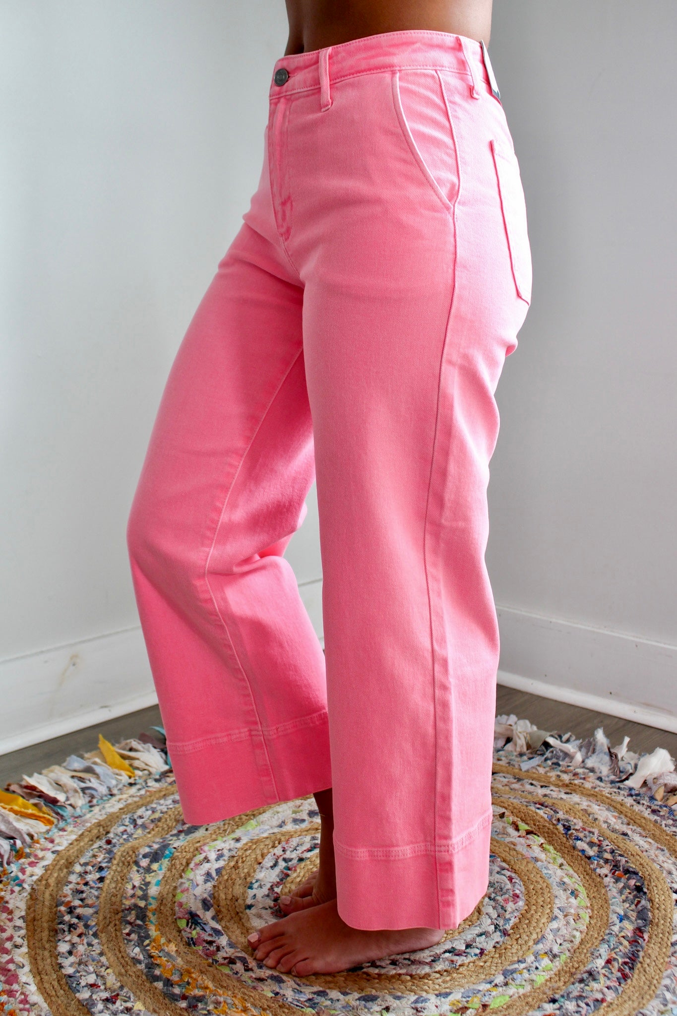 In a wide leg silhouette that’s so cool and current, our Anastasia Jean will make a statement wherever you go. The non-rip denim fabrication offers a fresh and clean look you can easily dress up or down, while the neon pink wash is such a fun color that’s sure to turn heads with every wear. Sits just above the waistline as it hugs your curves and flares down the leg, with a tall hem and an ankle crop length that’s perfect for showing off your kicks.