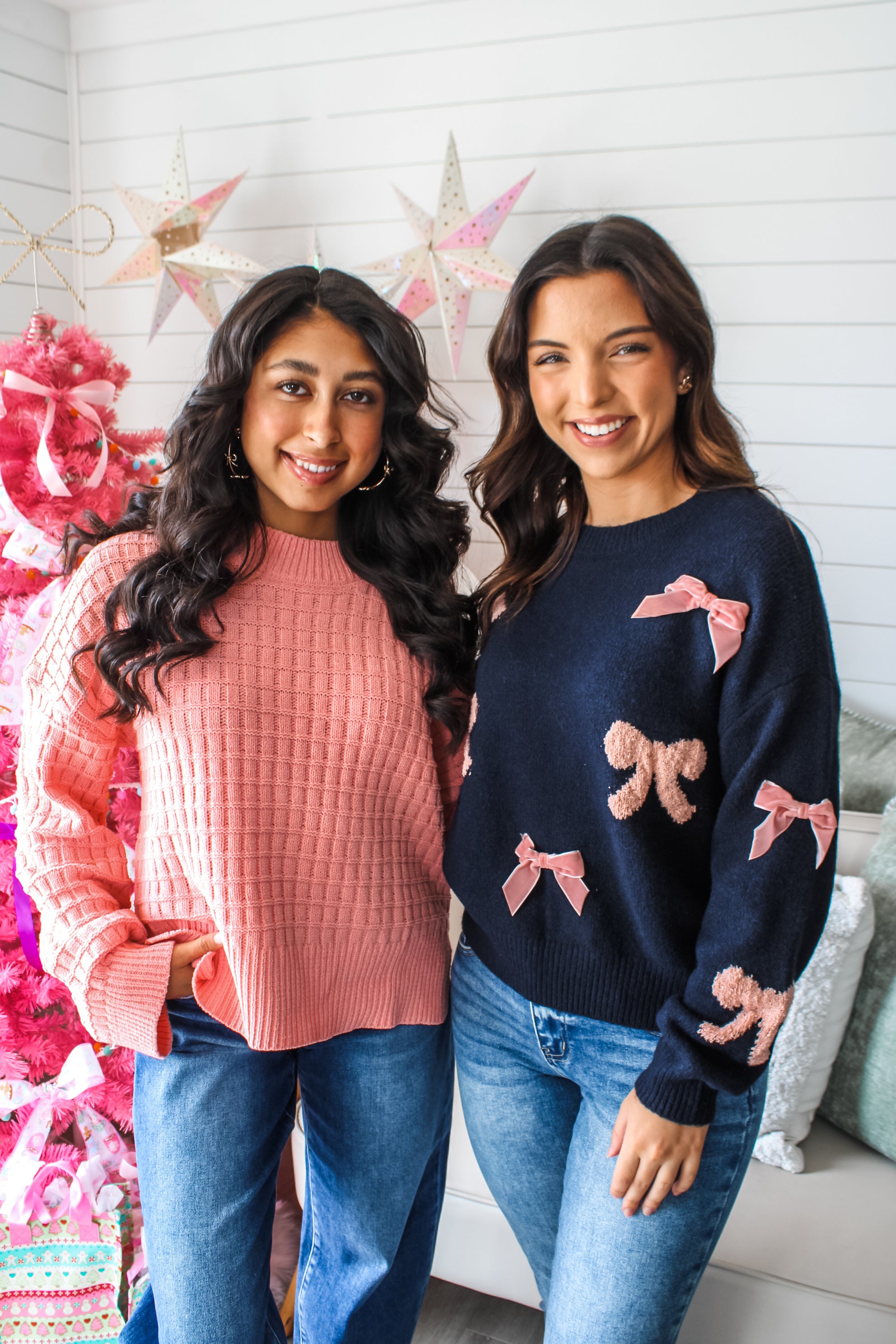 Dress to impress for the holidays! This sweet statement-maker features a contrast knit bow design and velvet bow embellishments for a playful yet polished look. Fabricated in a cozy knit with a crew neckline, drop shoulder sleeves and a relaxed silhouette.