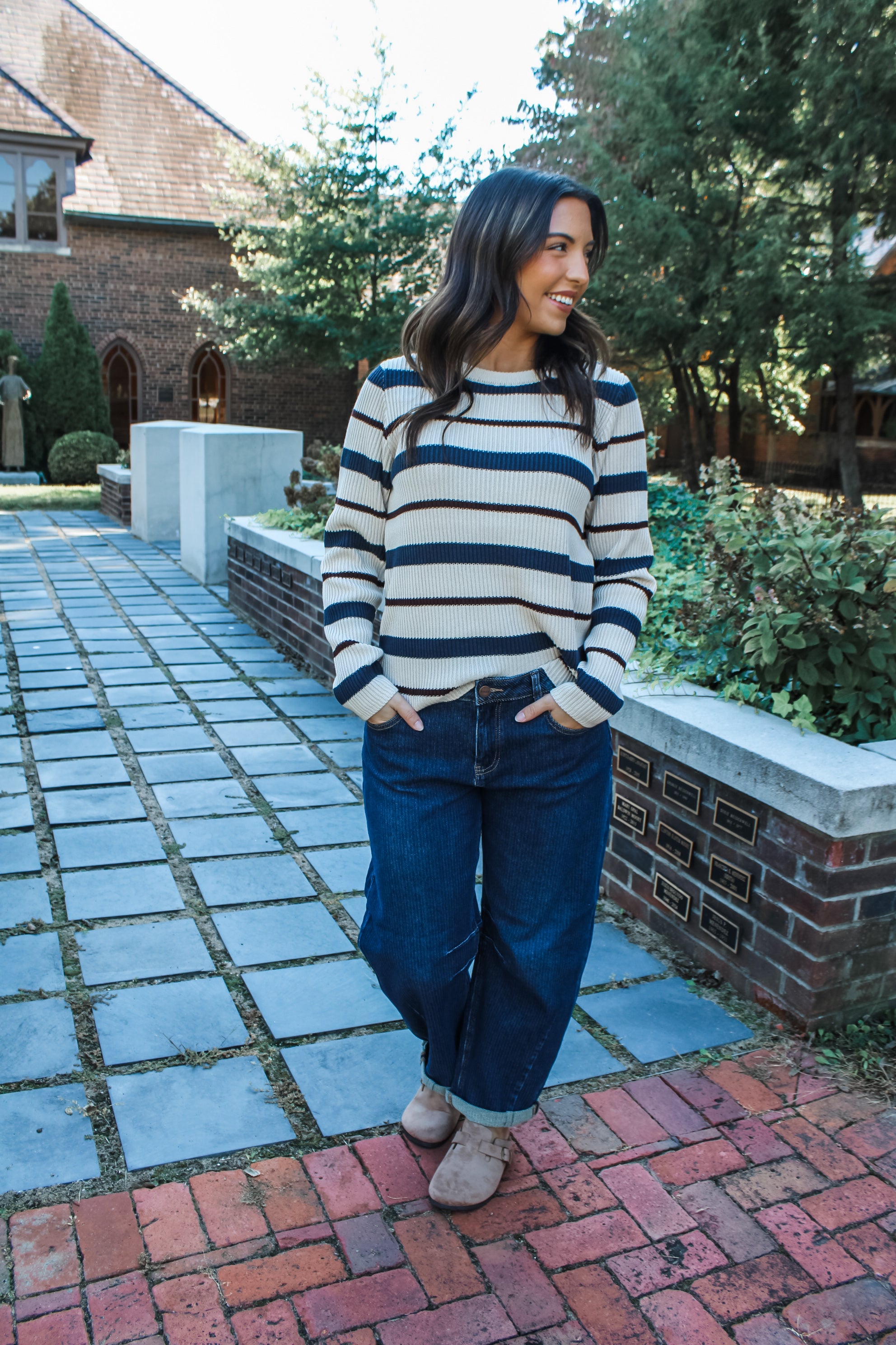 Striped essentials that never go out of style! This chic sweater is a laidback classic you’ll keep wearing over and over. Crafted from a rib textured knit with a relaxed crewneck silhouette. The sophisticated colorway adds it to its timeless appeal, making it a stylish staple for every wardrobe.