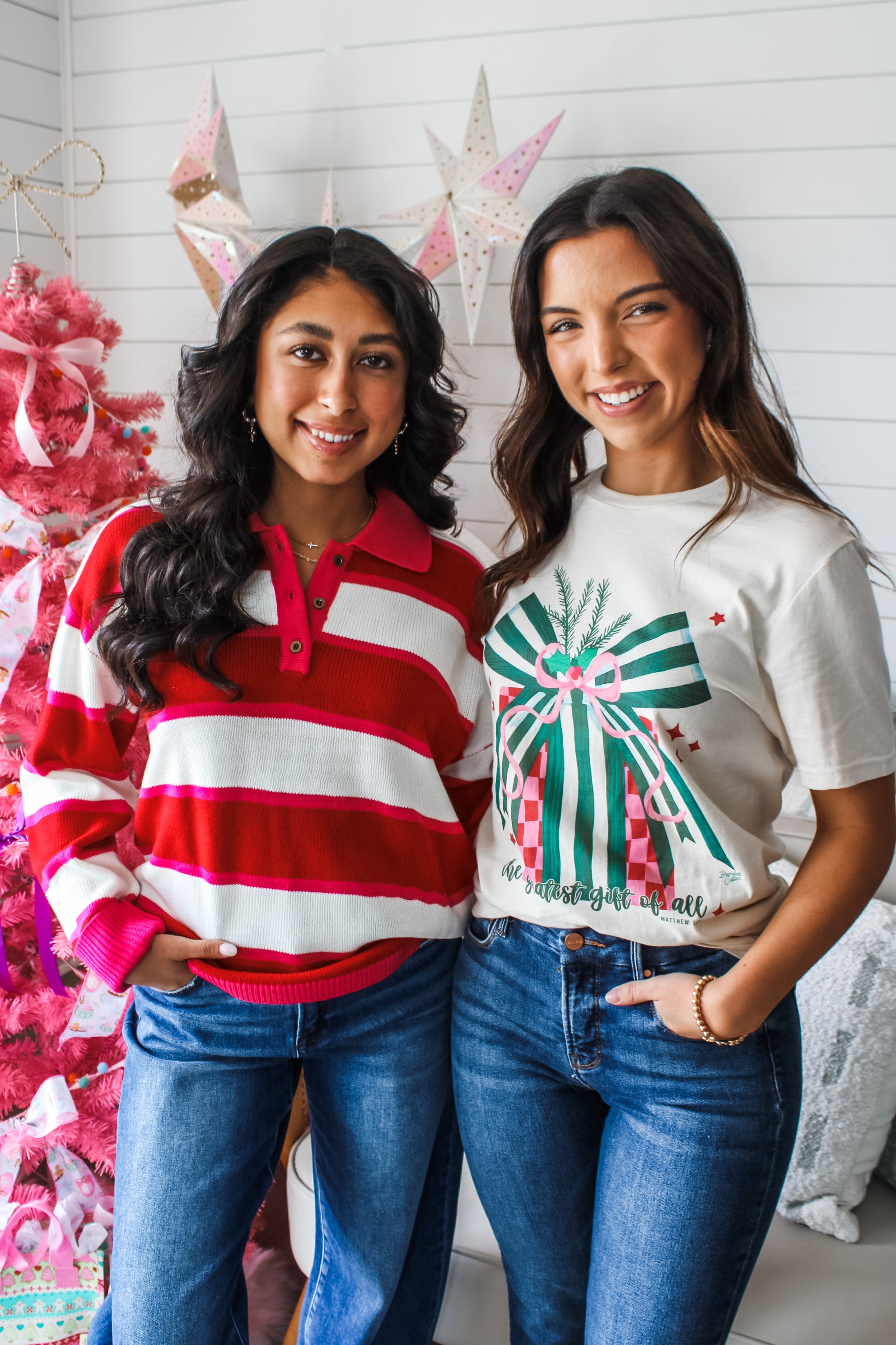 Strikings stripes for a cute holiday style! This polo sweater is a playful classic you’ll keep wearing over and over. Crafted from a braided knit that drapes over the body, with a modern relaxed silhouette. The pink and red colorway makes it so eye-catching, while the ribbed collar and henley neckline gives it a preppy feel.