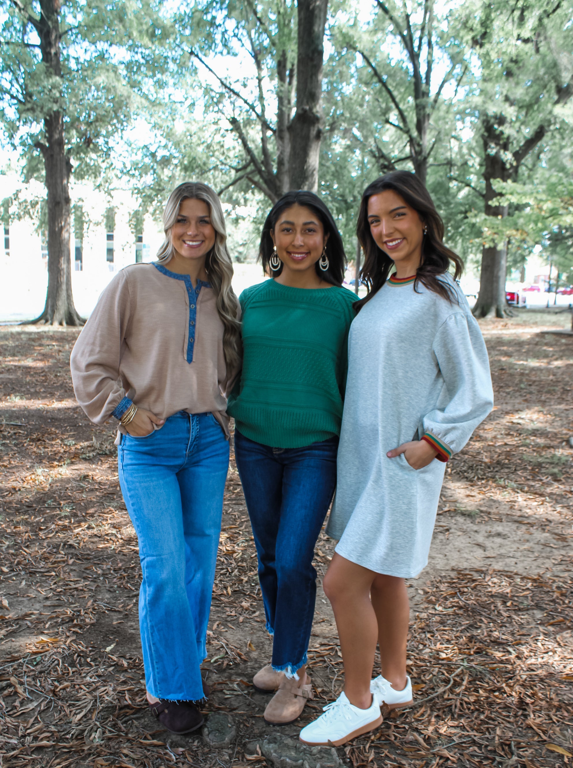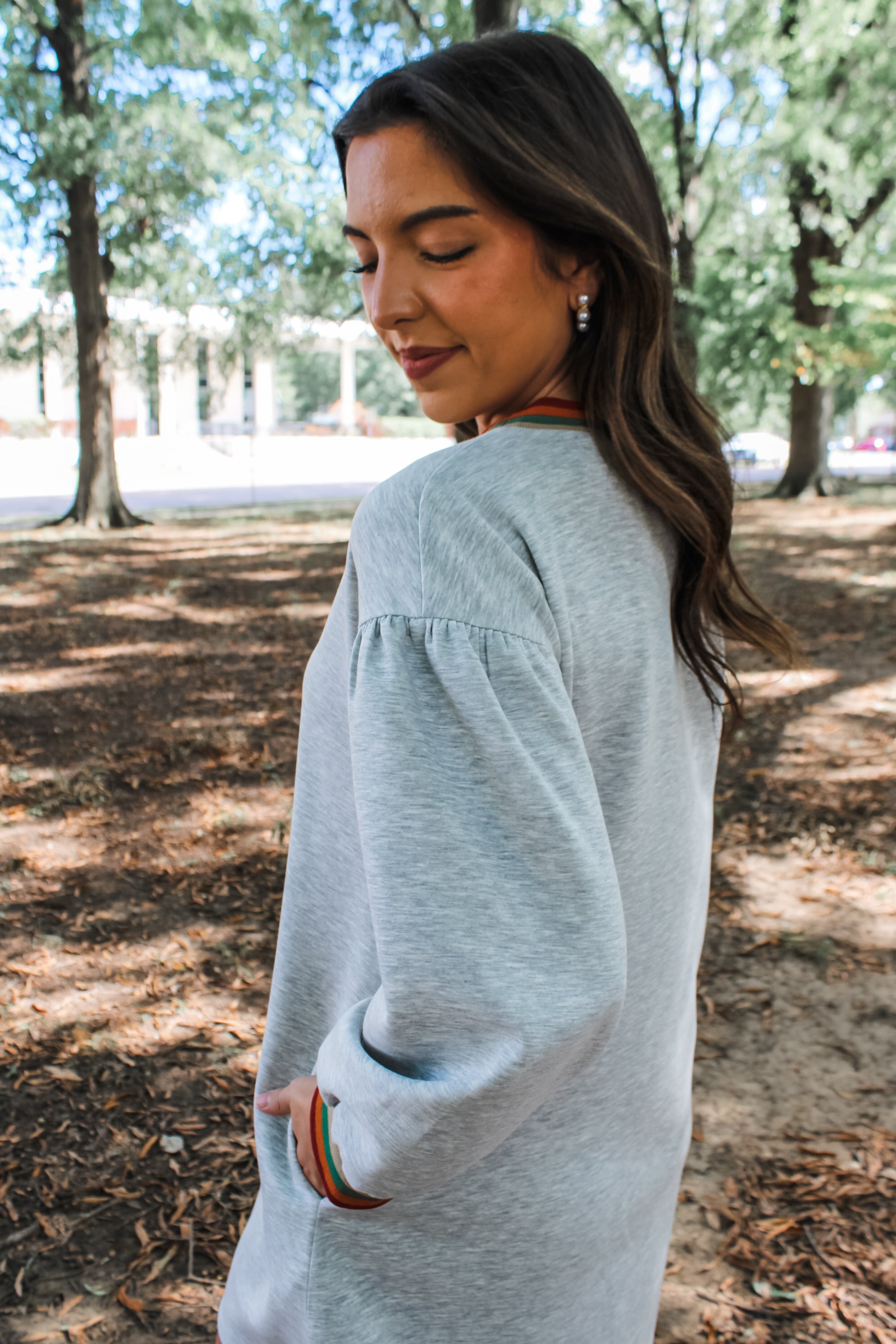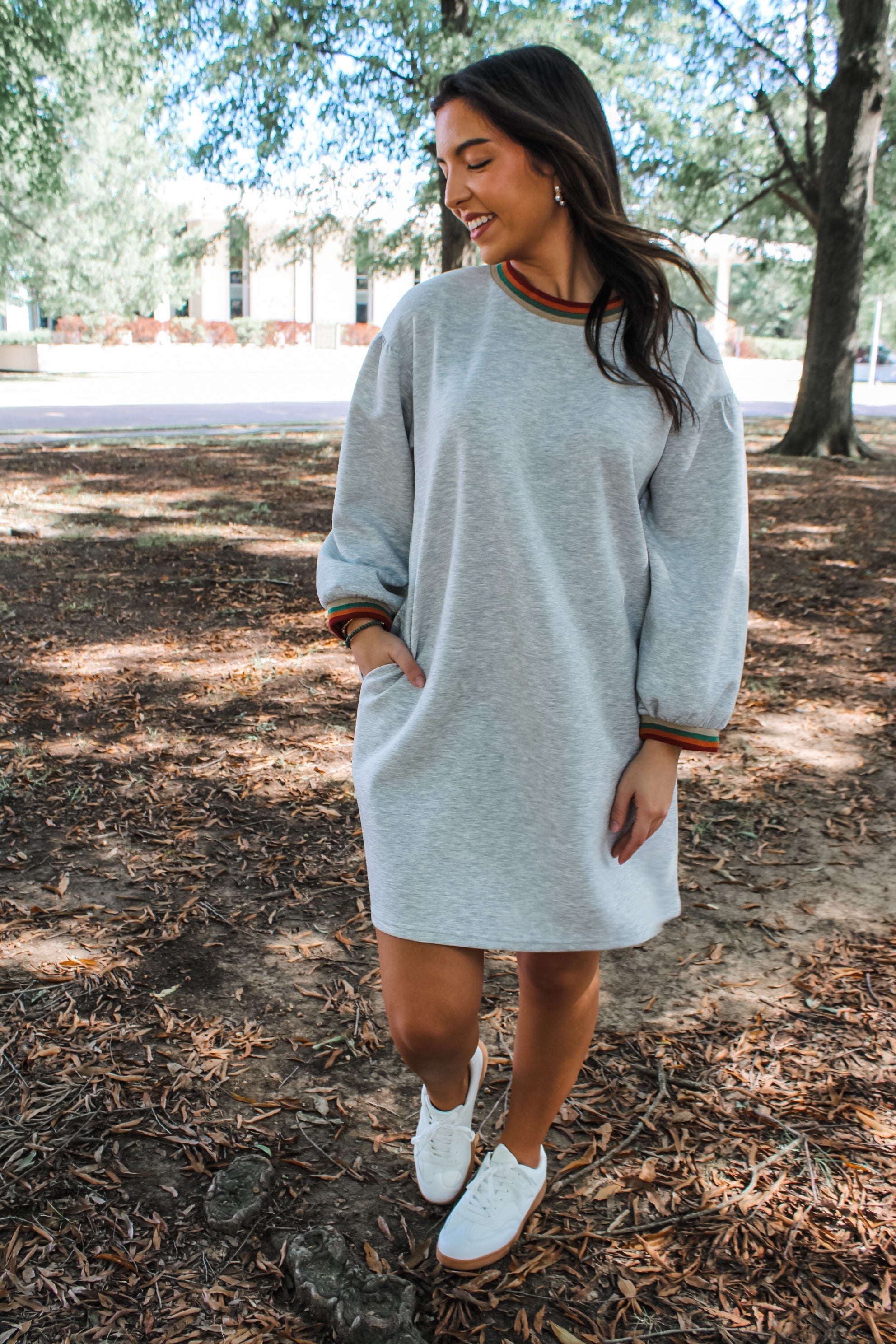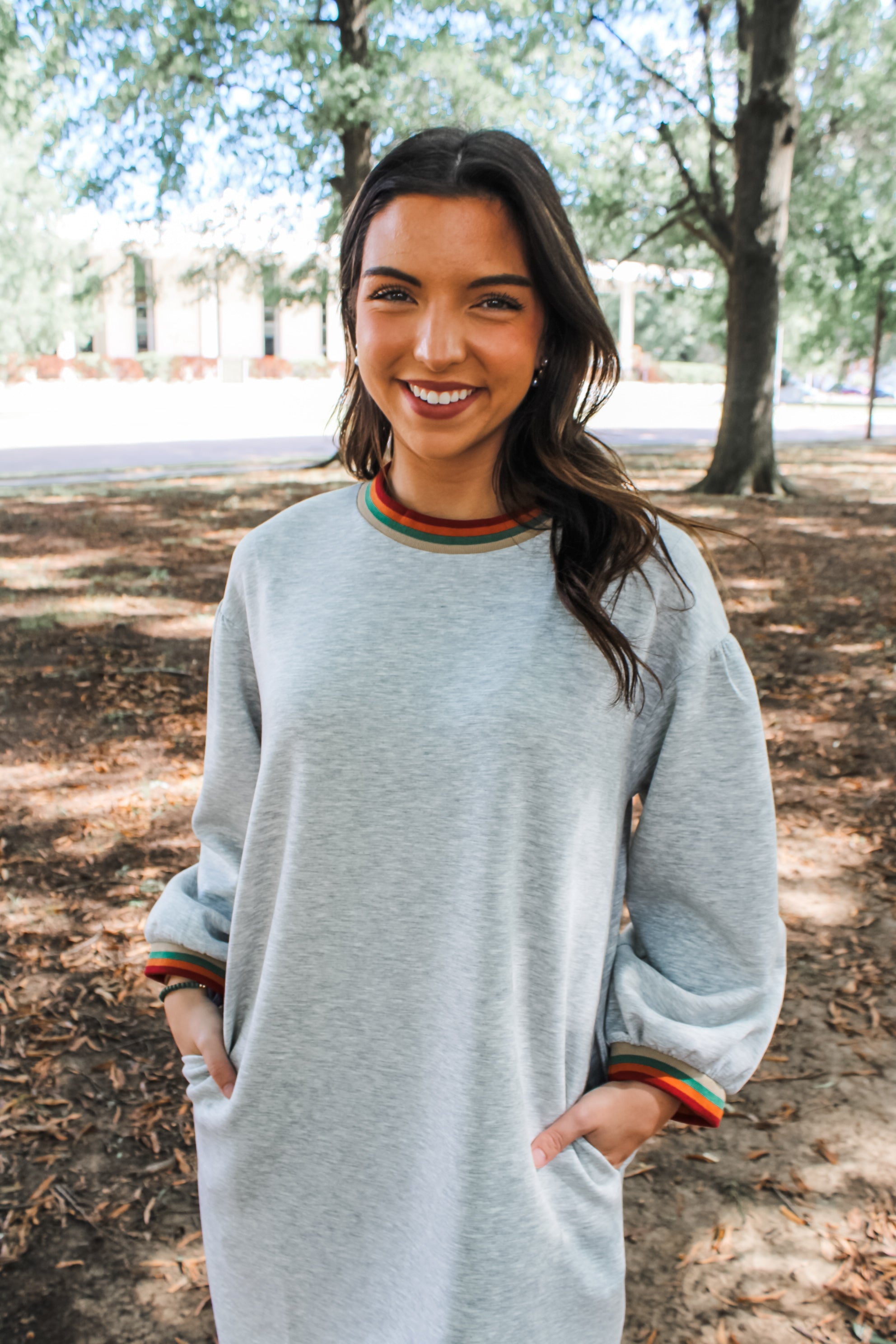 So easy and comfortable, this pocket dress will be your new style favorite! Smooth to the touch in a heathered scuba knit, with a relaxed silhouette for a fit that flatters all. Featuring a rainbow striped ringer trim design, with a crew neckline, puff sleeves and oh-so-essential side pockets. This cute staple is a truly effortless look whether you’re going out of town, running errands or attending fall events!