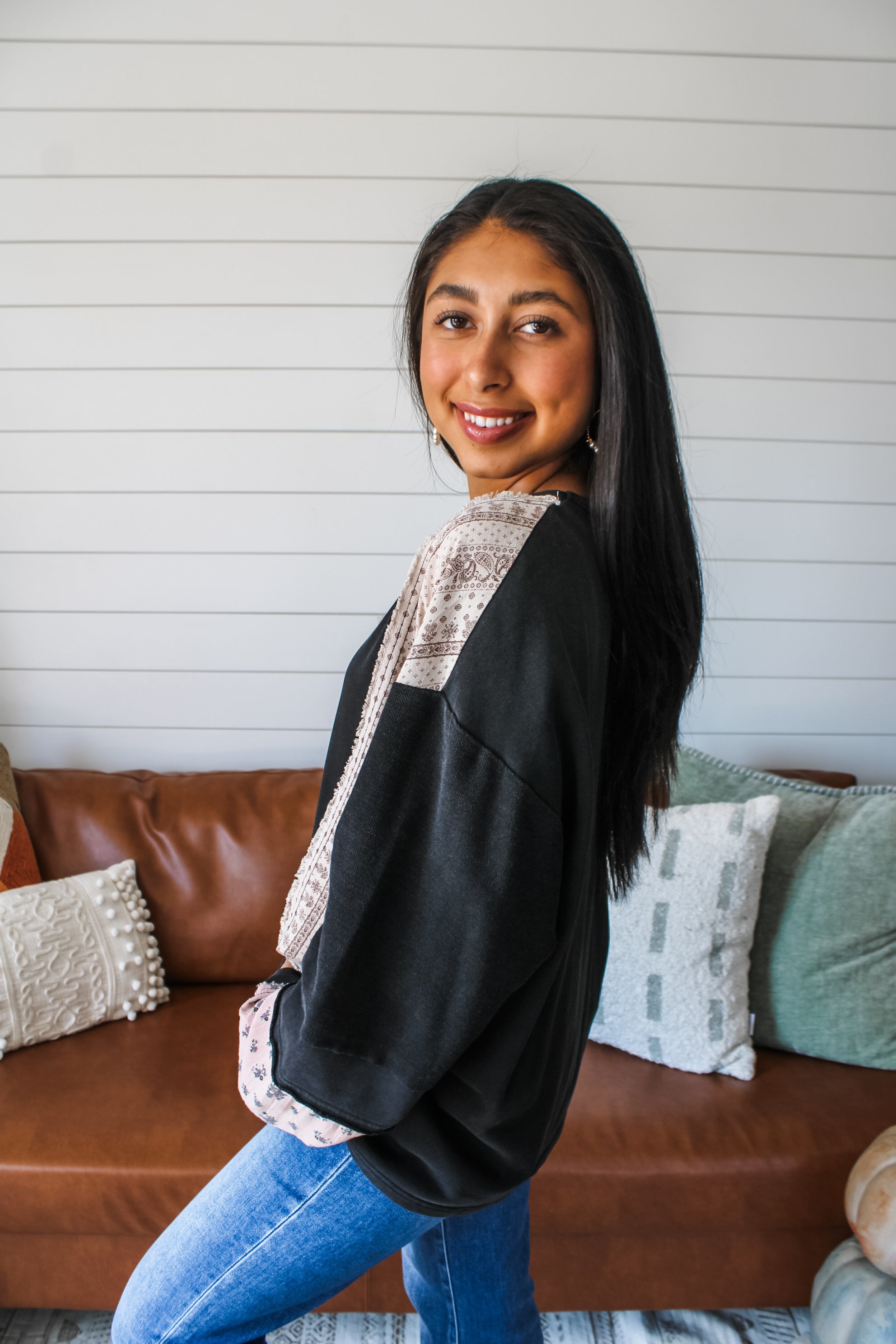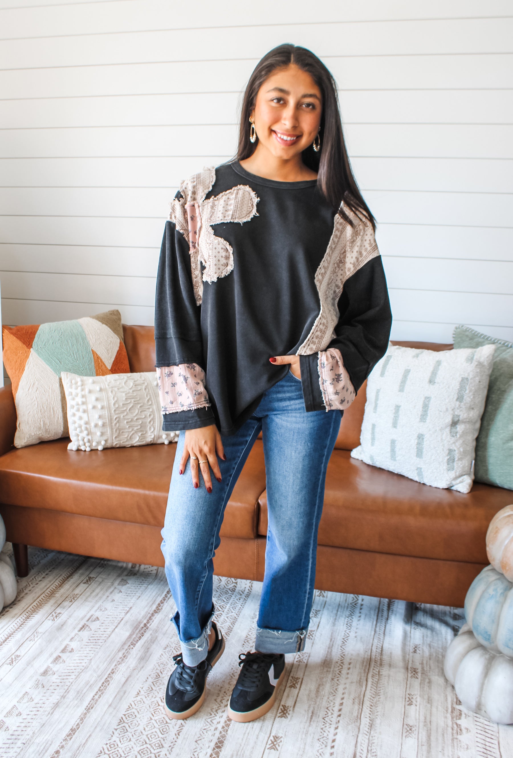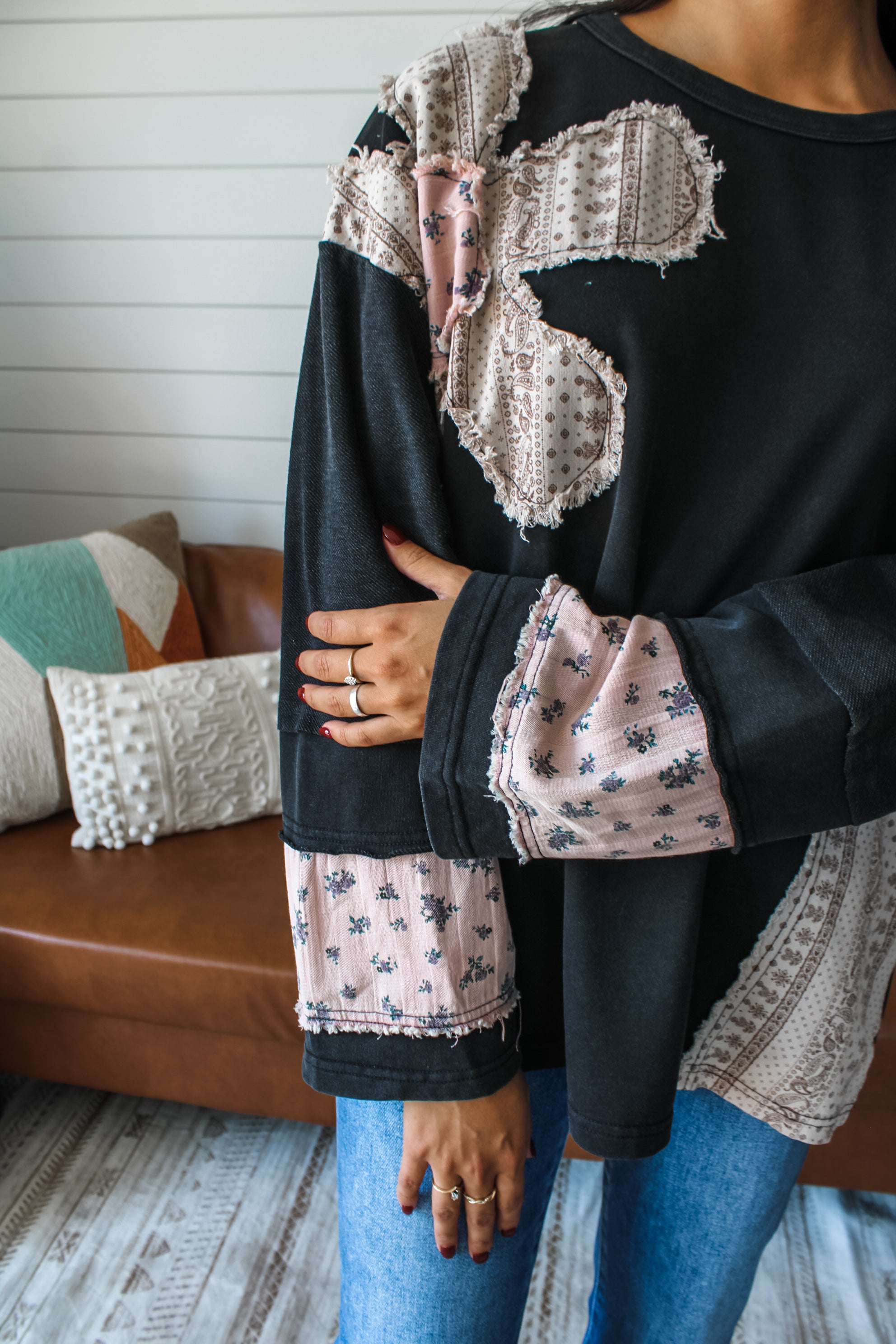 So cute and comfy, this patchwork top is a one-of-a-kind look for everyday adventures and weekend outings! The mineral washed cotton provides a vintage-inspired vibe, while flower patchwork and fringe edge panels add so much interest and texture. With a crewneck, drop shoulder sleeves and an oversized silhouette.