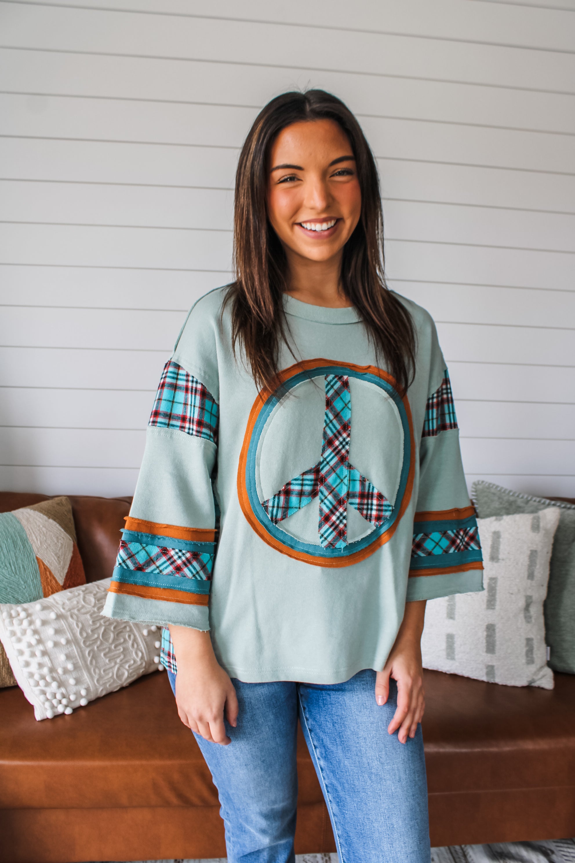 So cute and comfy, this patchwork top is a one-of-a-kind look for everyday adventures and weekend outings! Fabricated in a terry cotton knit with a peace sign detail, print contrast panels and colorblock design. Featuring a rib band crewneck, 3/4 length sleeves and a breezy silhouette.