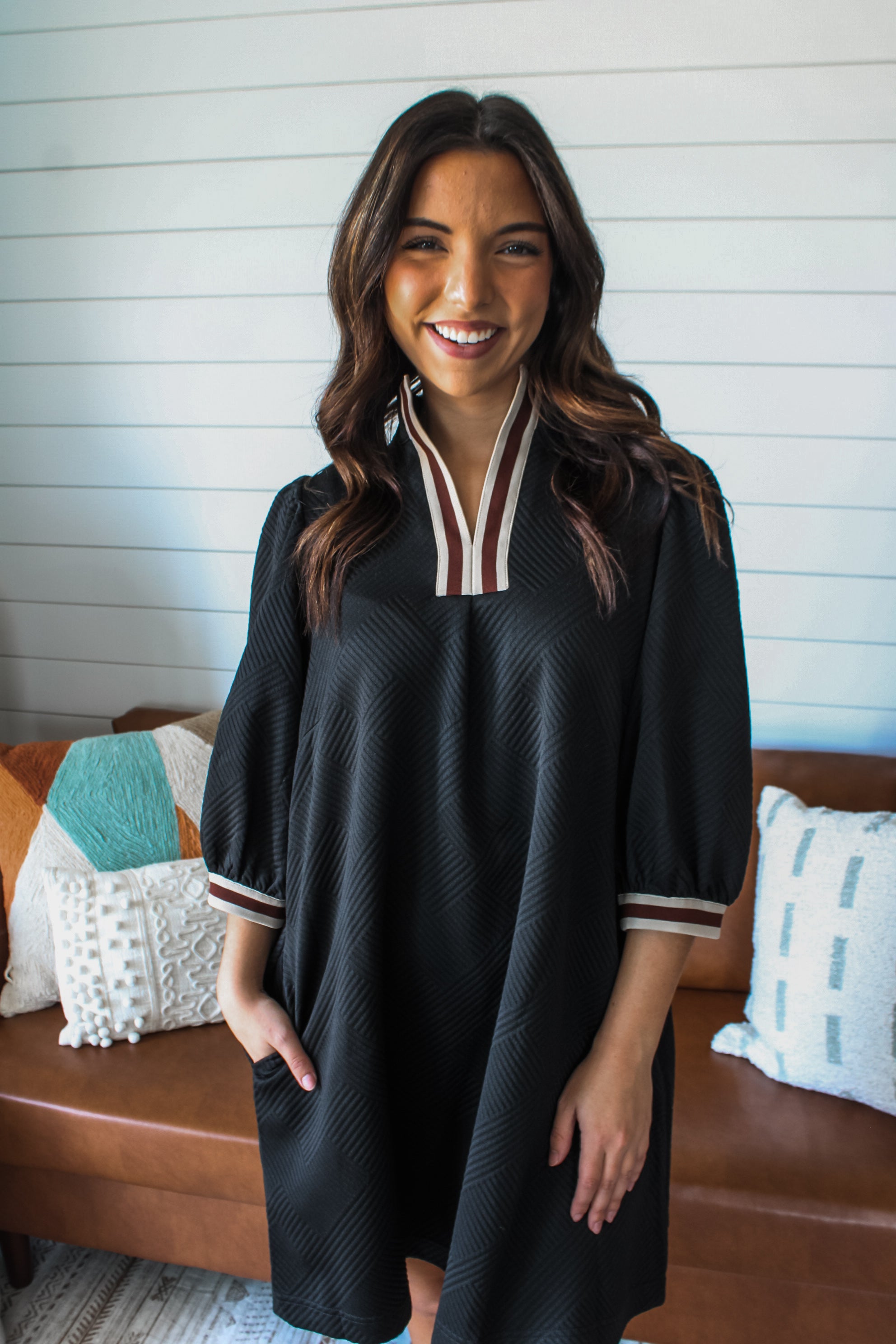 Dress to impress with unexpected details. The perfect combination of polish and charm, you can style this versatile look for the office, family gatherings and special occasions. Crafted in an embossed and patterned knit, with a notched neckline, contrast stripe detailing, elbow length puff sleeves and a simple a-line silhouette.